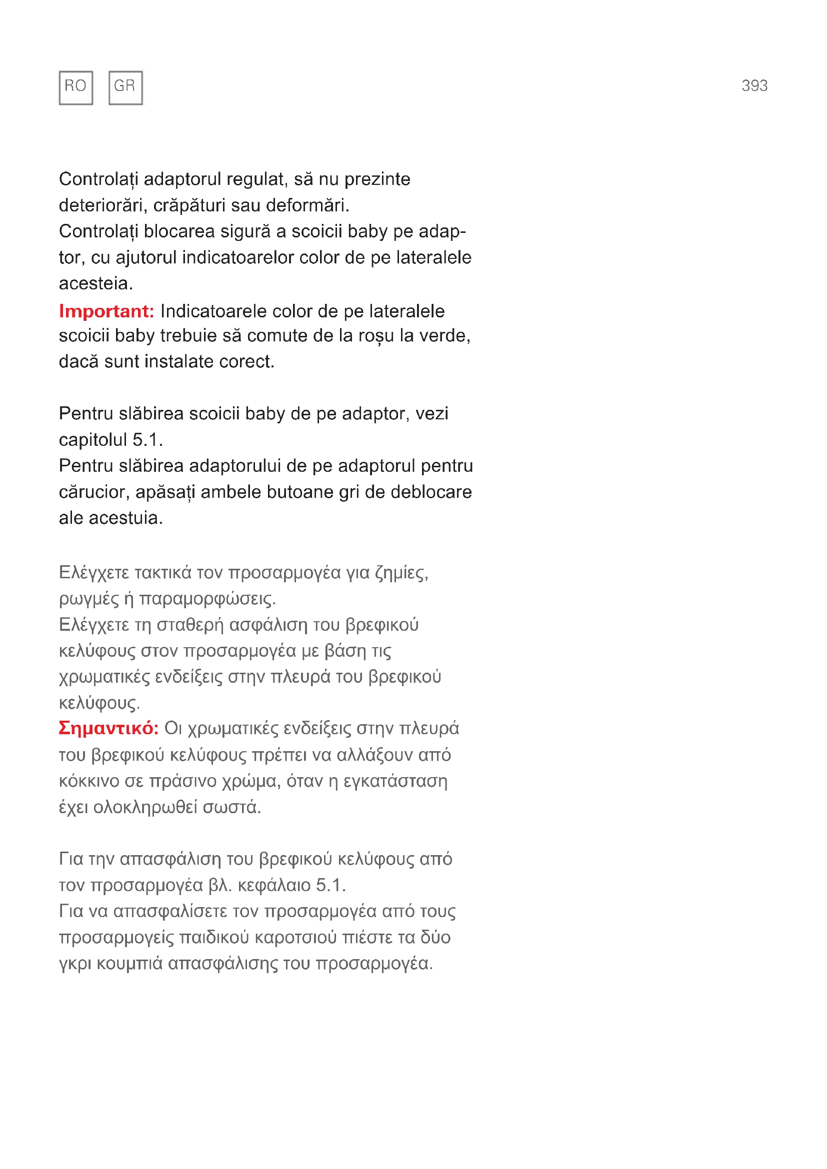 gr392 Rendszeresen ellenőrizze az adapter sérüléseit, repedéseit, vagy deformációit. A hordozó oldalán lévő színjelölések alapján ellenőrizze a hordozó biztonságos csatlakozását az adapterhez. Fontos: Megfelelő rögzítettség esetén a hordozó oldalán lévő színjelöléseknek át kell váltaniuk pirosról zöldre. A hordozó adapterről való leválasztását az 5.1 fejezetben találhatja. Az adapter gyermekkocsi adapterről való le- választásához nyomja meg az adapter két szürke kioldógombját. Kontrollige regulaarselt adapteri kahjustusi, rebendeid või deformeerumist. Kontrollige beebihälli külgedel asuvate värviliste näidikute kaudu, kas beebihäll on adapteris turvali- selt lukustunud. Tähtis: Beebihälli külgedel asuvad värvilised näidikud peavad õige paigalduse korral vahetuma punasest rohelisteks. Beebihälli vabastamist adapterist vaadake peatü- kist 5.1. Adapteri avamiseks lapsevankri adapterist vaju- tage adapteri mõlemale hallile lukustusnupule.