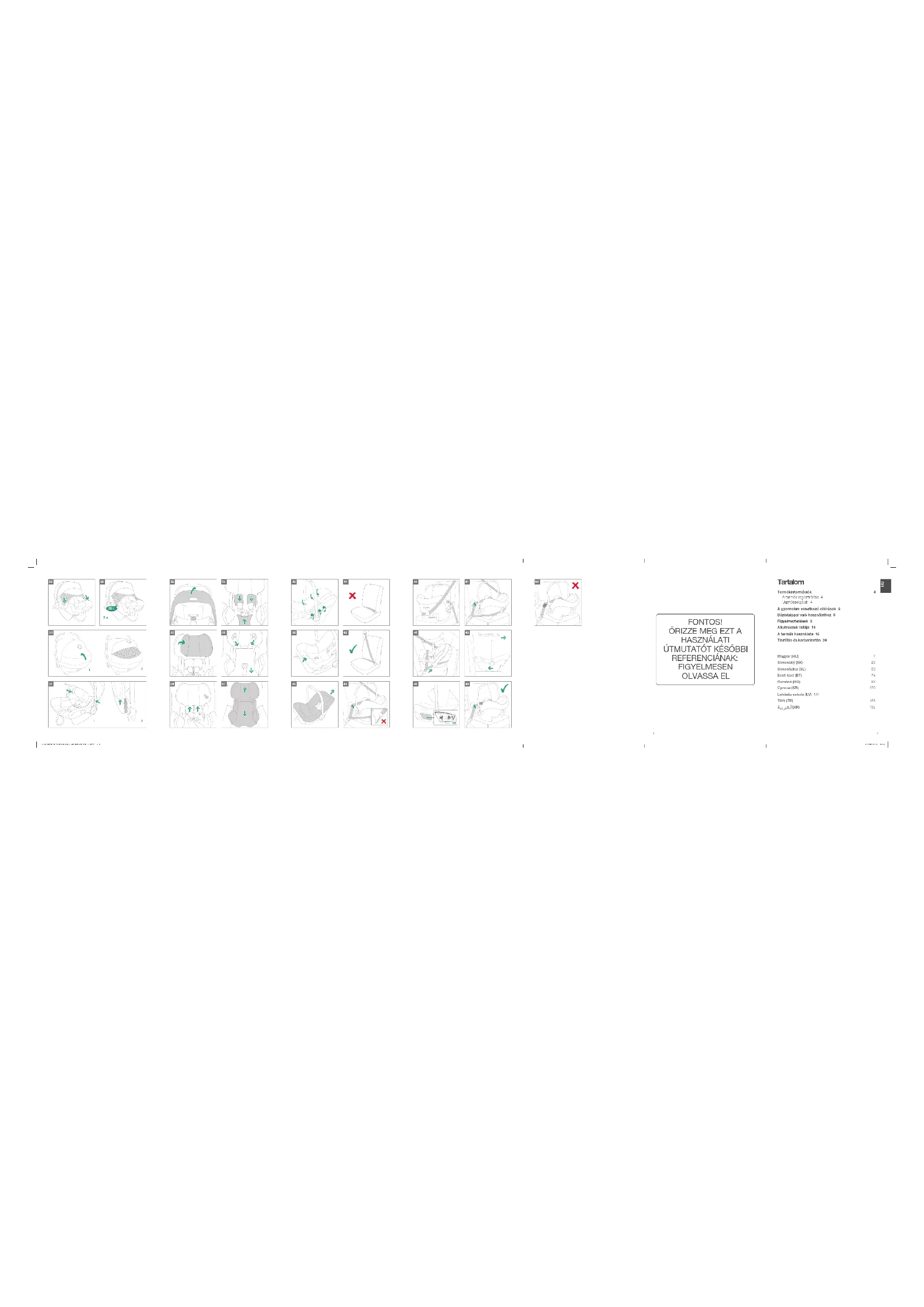 BGB Turtle Air EMEA Book A6 IMG-0119F-3.indb 8-9BGB Turtle Air EMEA Book A6 IMG-0119F-3.indb 8-9 21-08-2020 17:4821-08-2020 17:48A kiesés elkerülése érdekében mindig rögzítse a gyermeket a gyermek rögzítésére szolgáló hámrendszerrel, amikor beülteti a babahordozó modulba, akkor is, ha a megerősített gyermekbiztonsági rendszer nincs a járműben. A súlyos sérülés vagy halál elkerülése érdekében SOHA ne helyezze a babahordozó modult megemelt felületre, ha a gyermek is benne van. A megerősített gyermekbiztonsági rendszer alkatrészein semmilyen kenést ne alkalmazzon. Vegye ki a jármű üléséből a babahordozó modult és a bázistalpat, ha nem használja azokat rendszeresen. MINDIG rögzítse a gyermeket a megerősített gyermekbiztonsági rendszerrel, rövid utakon is, hiszen a legtöbb baleset rövid utakon történik. SOHA ne hagyja a gyermeket felügyelet nélkül a megerősített gyermekbiztonsági rendszerrel. SOHA ne használjon másodkézből származó megerősített gyermekbiztonsági rendszert , vagy olyan gyermekbiztonsági rendszert, amelynek nem ismeri a használati előzményeit, mert előfordulhat, hogy a rendszer a gyermek biztonságát veszélyeztető szerkezeti károsodással rendelkezik. SOHA ne használjon kötelet vagy más helyettesítő eszközt a gyermekbiztonsági rendszer járműbe való rögzítéséhez, illetve a gyermek biztonsági rendszerbe való rögzítéséhez. SEMMILYEN megerősített gyermekbiztonsági rendszer nem nyújt százszázalékos védelmet a balesetek miatti sérülések ellen. Azonban a megerősített gyermekbiztonsági rendszer megfelelő használata csökkenti a gyermek súlyos sérülésének vagy halálának kockázatát. NE használjon a menetiránynak háttal beszerelt gyermekbiztonsági rendszert olyan üléshelyzetekben, ahol aktív az első légzsák. Ez halált vagy súlyos sérülést eredményezhet. További információért olvassa el a jármű kézikönyvét. NE helyezzen semmilyen tárgyat a kitámasztóláb területére, a bázistalp elé. NE használjon más teherviselő érintkezési pontokat, mint amelyek az útmutatóban le vannak írva és a megerősített gyermekbiztonsági rendszeren jelölve vannak. NE használja tovább a megerősített gyermekbiztonsági rendszert, miután bármilyen ütközést szenvedett, akkor sem, ha csak kisebb koccanása volt. Azonnal cserélje ki, mert az ütközés miatt szemmel nem látható szerkezeti károsodás érhette a terméket. NE használja ezt a megerősített gyermekbiztonsági rendszert úgy, hogy nem tartja be a kézikönyvben szereplő utasításokat, különben súlyos vagy halálos sérülés veszélyének teheti ki gyermekét. NE végezzen semmilyen módosítást a megerősített gyermekbiztonsági rendszeren, és ne használja más gyártótól származó alkatrészekkel.