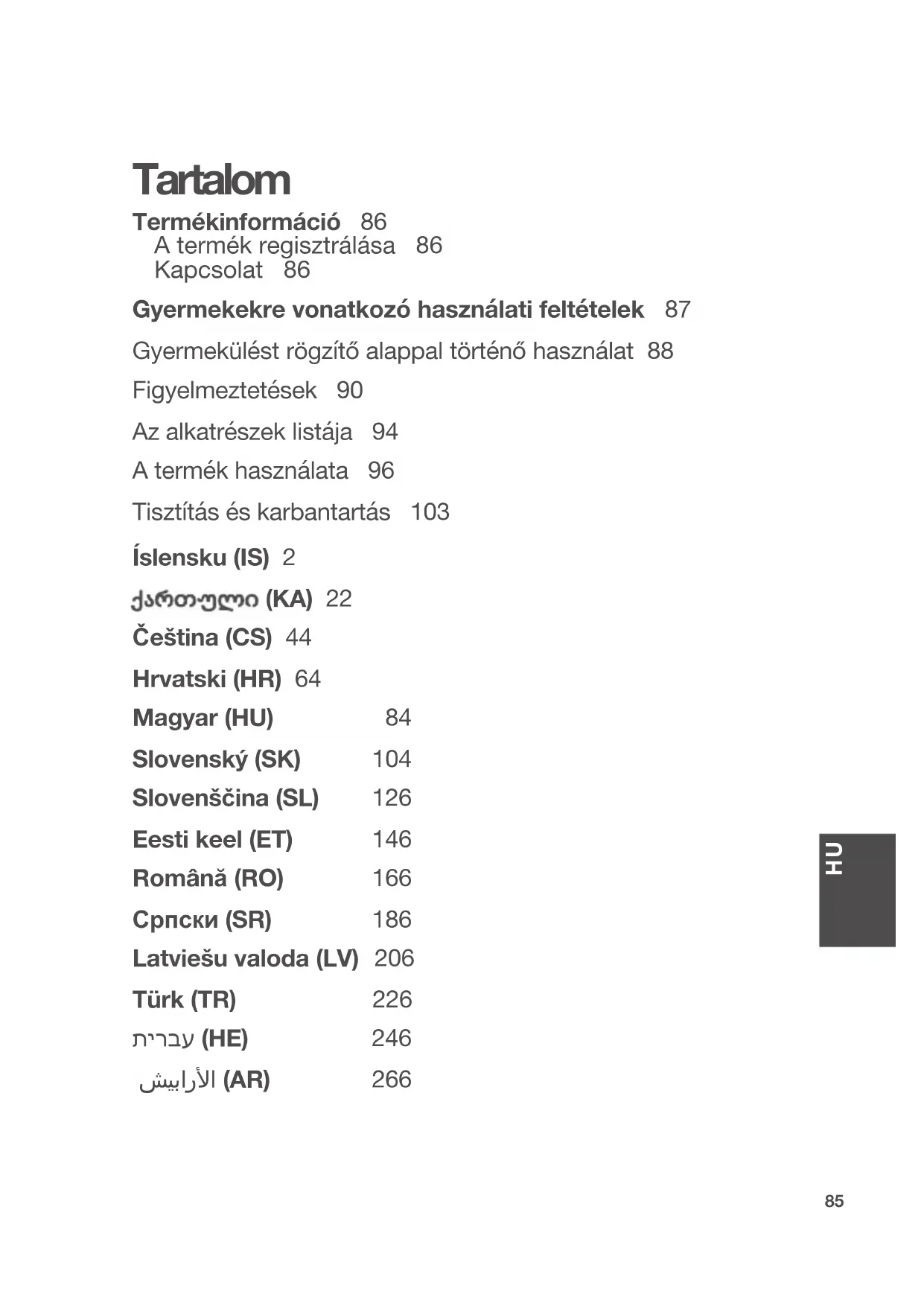 Tartalom Termékinformáció 86 A termék regisztrálása 86 Kapcsolat 86 Gyermekekre vonatkozó használati feltételek 87 Gyermekülést rögzítő alappal történő használat 88 Figyelmeztetések 90 Az alkatrészek listája 94 A termék használata 96 Tisztítás és karbantartás 103 Íslensku (IS) 2 (KA) 22 Čeština (CS) 44 Hrvatski (HR) 64 Magyar (HU) 84 Slovenský (SK) 104 Slovenščina (SL) 126 Eesti keel (ET) 146 Română (RO) 166 Српски (SR) 186 Latviešu valoda (LV) 206 Türk (TR) 226 תירבע (HE) 246 شيبارا (AR) 26686