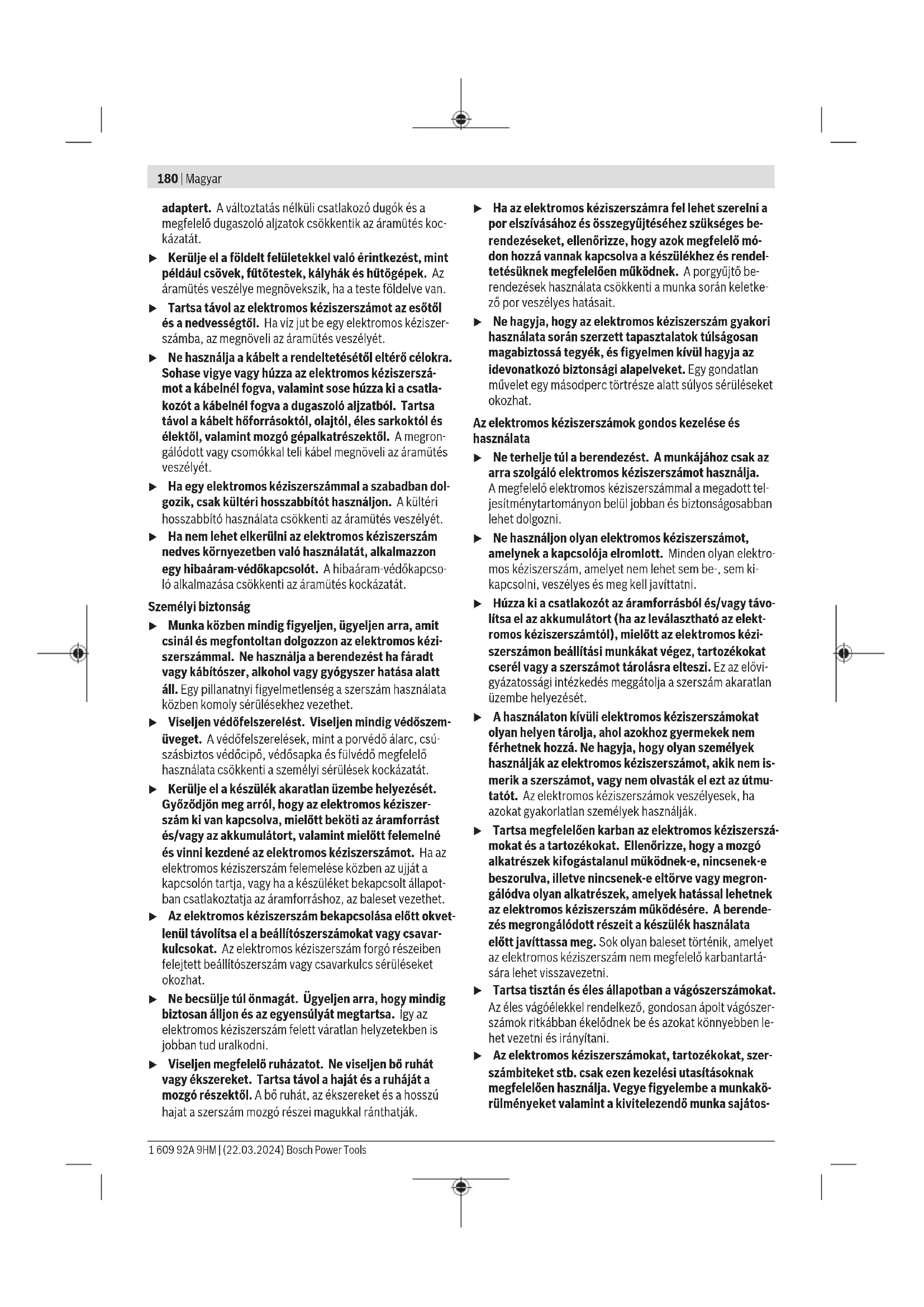 Vyhotovenie zapínača/vypínača saretáciou Na uvedenie elektrického náradia do prevádzky stlačte najprv zapínač/vypínač(2) ➊, potom ho posuňte dopredu ➋. Napokon ho stlačte adržte stlačený ➌. Na zaaretovanie stlačeného zapínača/vypínača(2) posuňte zapínač/vypínač(2) ďalej dopredu ➍. Na vypnutie elektrického náradia uvoľnite zapínač/ vypínač(2) alebo, ak je zaaretovaný, zapínač/vypínač(2) krátko stlačte apotom ho uvoľnite. Vyhotovenie zapínača/vypínača bez aretácie 1 609 92A 9HM | (22.03.2024) Bosch Power ToolsMagyar | 179 Na uvedenie elektrického náradia do prevádzky stlačte najprv zapínač/vypínač(2) ➊, potom ho posuňte dopredu ➋. Napokon ho stlačte adržte stlačený ➌. Na vypnutie elektrického náradia uvoľnite zapínač/ vypínač(2). u Brúsne nástroje pred použitím skontrolujte. Brúsny nástroj musí byť bezchybne namontovaný amusí sa dať voľne otáčať. Vykonajte skúšobný chod aspoň po- čas 1 minúty bez zaťaženia. Nepoužívajte žiadne po- škodené, zdeformované alebo vibrujúce brúsne ná- stroje. Poškodené brúsne nástroje môžu prasknúť aspô- sobiť zranenia. Údržba aservis Údržba ačistenie u Pred všetkými prácami na elektrickom náradí vytiah- nite sieťovú zástrčku zo zásuvky. u Elektrické náradie ajeho vetracie štrbiny udržiavajte vždy včistote, aby ste mohli pracovať dobre abezpeč- ne. u Pri extrémnych podmienkach používania vždy podľa možnosti použite odsávacie zariadenie. Vetracie štrbi- ny často vyfukujte apredraďte prúdový chránič (PRCD). Pri obrábaní kovov sa môže vo vnútri elektrické- ho náradia usádzať vodivý prach. To môže mať negatívny vplyv na ochrannú izoláciu elektrického náradia. Príslušenstvo skladujte aošetrujte starostlivo. Ak je potrebná výmena pripájacieho vedenia, musí ju vy- konať Bosch alebo niektoré autorizované stredisko služieb zákazníkom pre elektrické náradie Bosch, aby sa zabránilo ohrozeniam bezpečnosti. Zákaznícka služba aporadenstvo ohľadom použitia Servisné stredisko Vám odpovie na otázky týkajúce sa opravy aúdržby Vášho produktu ako aj náhradných dielov. Rozkladové výkresy ainformácie onáhradných dieloch náj- dete tiež na: www.bosch-pt.com Vprípade otázok týkajúcich sa našich výrobkov apríslušen- stva Vám ochotne pomôže poradenský tím Bosch. Vprípade akýchkoľvek otázok aobjednávok náhradných dielov uvádzajte bezpodmienečne 10‑miestne vecné číslo uvedené na typovom štítku výrobku. Slovakia Na www.bosch-pt.sk si môžete objednať opravu vášho stroja alebo náhradné diely online. Tel.: +421 2 48 703 800 Fax: +421 2 48 703 801 E-Mail: servis.naradia@sk.bosch.com www.bosch-pt.sk Ďalšie adresy servisov nájdete na: www.bosch-pt.com/serviceaddresses Likvidácia Elektrické náradie, príslušenstvo aobaly treba odovzdať na ekologickú recykláciu. Nevyhadzujte elektrické náradie do bežného odpadu zdomácnosti! Len pre krajinyEÚ: Podľa európskej smernice 2012/19/EÚ ostarých elektric- kých aelektronických zariadeniach apodľa jej realizácie vnárodnom práve sa musí už nepoužiteľné elektrické nára- die zbierať separovane aodovzdať na ekologickú recykláciu. Pri nesprávnej likvidácii môžu mať staré elektrické aelektro- nické zariadenia kvôli možnej prítomnosti nebezpečných látok škodlivý vplyv na životné prostredie aľudské zdravie. Magyar Biztonsági tájékoztató Általános biztonsági előírások az elektromos kéziszerszámok számára FIGYELMEZ- TETÉS Olvassa el valamennyi biztonsági tájékoztatót, előírást, illusztrációt és adatot, amelyet az elektromos kéziszerszámmal együtt megkapott. Az alábbiakban felso- rolt előírások betartásának elmulasztása áramütéshez, tűz- höz és/vagy súlyos testi sérülésekhez vezethet. Kérjük a későbbi használatra gondosan őrizze meg eze- ket az előírásokat. Az alább alkalmazott "elektromos kéziszerszám" fogalom a hálózati elektromos kéziszerszámokat (hálózati csatlakozó kábellel) és az akkumulátoros elektromos kéziszerszámokat (hálózati csatlakozó kábel nélkül) foglalja magában. Munkahelyi biztonság u Tartsa tisztán és jól megvilágítva a munkaterületet. A zsúfolt vagy sötét területeken gyakrabban következnek be balesetek. u Ne dolgozzon a berendezéssel olyan robbanásveszé- lyes környezetben, ahol éghető folyadékok, gázok vagy por vannak. Az elektromos kéziszerszámok szikrá- kat keltenek, amelyek a port vagy a gőzöket meggyújthat- ják. u Tartsa távol a gyerekeket és a nézelődőket, ha az elektromos kéziszerszámot használja. Haelvonják a fi- gyelmét, elvesztheti az uralmát a berendezés felett. Elektromos biztonsági előírások u A készülék csatlakozó dugójának bele kell illeszkednie a dugaszolóaljzatba. A csatlakozó dugót semmilyen módon sem szabad megváltoztatni. Védőföldeléssel ellátott készülékek esetében ne használjon csatlakozó Bosch Power Tools 1 609 92A 9HM | (22.03.2024)180 | Magyar adaptert. Aváltoztatás nélküli csatlakozó dugók és a megfelelő dugaszoló aljzatok csökkentik az áramütés koc- kázatát. u Kerülje el a földelt felületekkel való érintkezést, mint például csövek, fűtőtestek, kályhák és hűtőgépek. Az áramütés veszélye megnövekszik, ha a teste földelve van. u Tartsa távol az elektromos kéziszerszámot az esőtől és a nedvességtől. Ha víz jut be egy elektromos kéziszer- számba, az megnöveli az áramütés veszélyét. u Ne használja a kábelt a rendeltetésétől eltérő célokra. Sohase vigye vagy húzza az elektromos kéziszerszá- mot a kábelnél fogva, valamint sose húzza ki a csatla- kozót a kábelnél fogva a dugaszoló aljzatból. Tartsa távol a kábelt hőforrásoktól, olajtól, éles sarkoktól és élektől, valamint mozgó gépalkatrészektől. A 