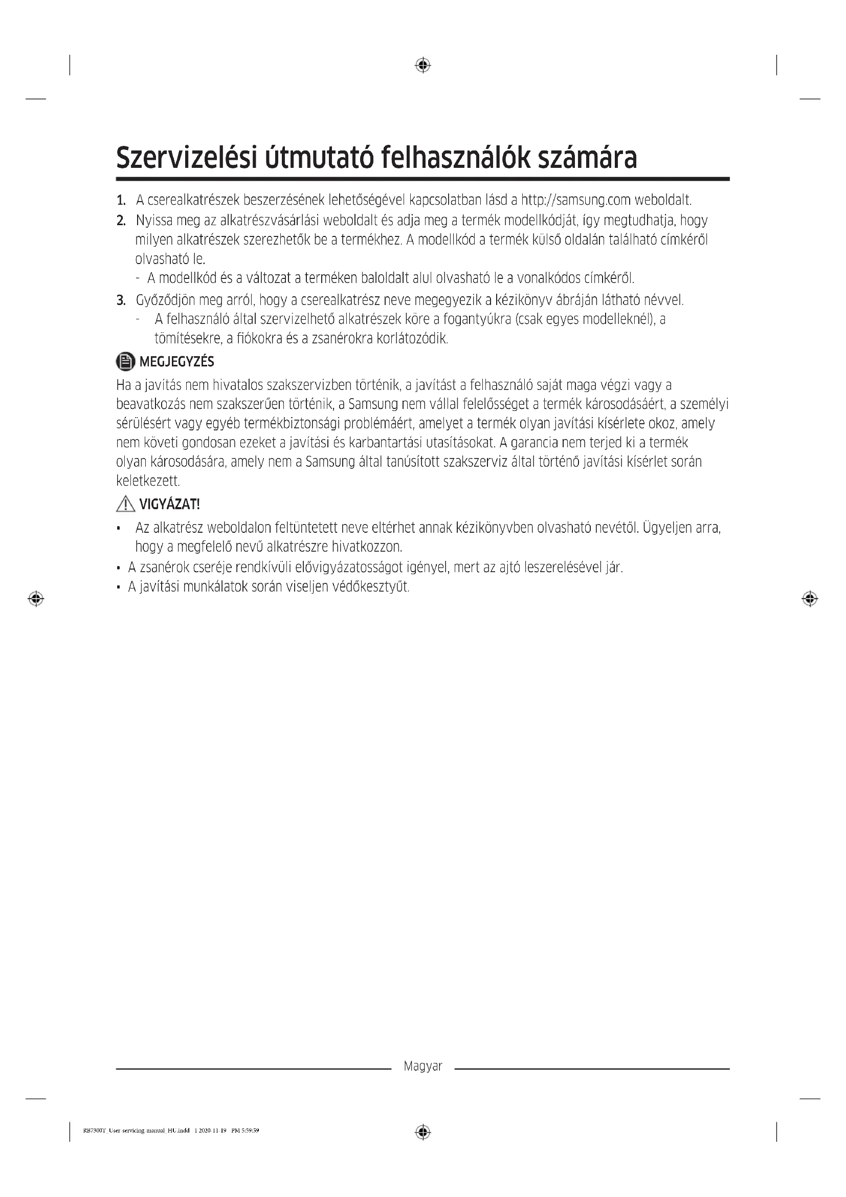 - A javítási munkálatok során viseljen védőkesztyűt. RB7300T_User-servicing-manual_HU.indd 1 2020-11-19 PM 5:59:59Magyar A hűtőszekrény kinézete és a kínált alkatrészeinek köre a modelltől és az országtól függően eltérő lehet.