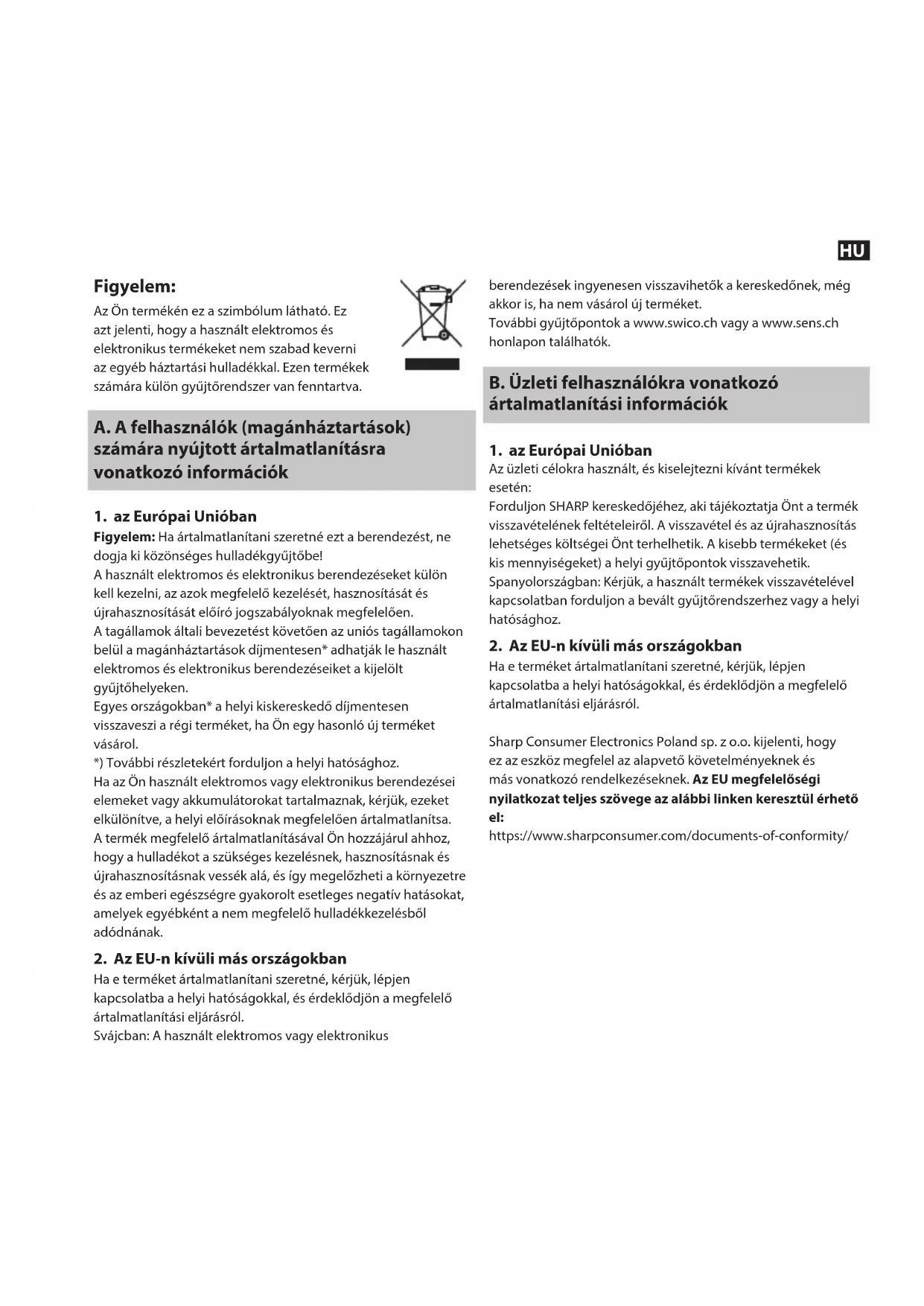 Az üzleti célokra használt, és kiselejtezni kívánt termékek esetén: Forduljon SHARP kereskedőjéhez, aki tájékoztatja Önt a termék visszavételének feltételeiről. A visszavétel és az újrahasznosítás lehetséges költségei Önt terhelhetik. A kisebb termékeket (és kis mennyiségeket) a helyi gyűjtőpontok visszavehetik. Spanyolországban: Kérjük, a használt termékek visszavételével kapcsolatban forduljon a bevált gyűjtőrendszerhez vagy a helyi hatósághoz.