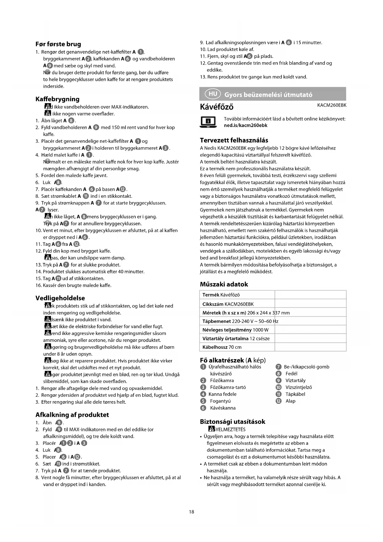 Gyors beüzemelési útmutató Kávéfőző KACM260EBKTovábbi információért lásd a bővített online kézikönyvet: ned.is/kacm260ebk Tervezett felhasználás A Nedis KACM260EBK egy legfeljebb 12 bögre kávé lefőzéséhez elegendő kapacitású víztartállyal felszerelt kávéfőző.A termék beltéri használatra készült.Ez a termék nem professzionális használatra készült.8 éven felüli gyermekek, továbbá testi, érzékszervi vagy szellemi fogyatékkal élők, illetve tapasztalat vagy ismeretek hiányában hozzá nem értő személyek használhatják a terméket megfelelő felügyelet vagy a biztonságos használatra vonatkozó útmutatások mellett, amennyiben tisztában vannak a használattal járó veszélyekkel. Gyermekek nem játszhatnak a termékkel. Gyermekek nem végezhetik a készülék tisztítását és karbantartását felügyelet nélkül.A termék rendeltetésszerűen kizárólag háztartási környezetben használható, emellett nem szakértő felhasználók is használhatják jellemzően háztartási funkciókra, például üzletekben, irodákban és hasonló munkakörnyezetekben, falusi vendéglátóhelyeken, vendégek a szállodákban, motelekben és egyéb lakossági és/vagy bed and breakfast jellegű környezetekben.A termék bármilyen módosítása befolyásolhatja a biztonságot, a jótállást és a megfelelő működést. Műszaki adatok Termék KávéfőzőCikkszám KACM260EBKMéretek (h x sz x m) 206 x 244 x 337 mmTápbemenet 220-240 V ~ 50–60 HzNévleges teljesítmény 1000 WVíztartály űrtartalma 12 csészeKábelhossz 70 cm Fő alkatrészek (A kép) 1 Újrafelhasználható hálós kávészűrő2 Főzőkamra3 Főzőkamra-tartó4 Kanna fedele5 Fogantyú6 Kávéskanna7 Be-/kikapcsoló gomb8 Fedél9 Víztartályq Vízszintjelzőw Tápkábele Alap Biztonsági utasítások