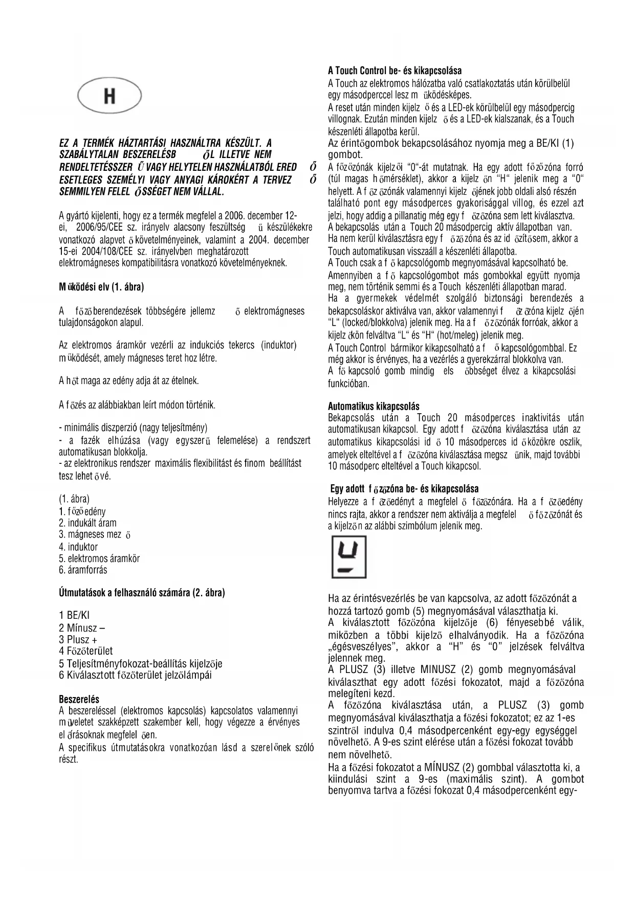Útmutatások a felhasználó számára (2. ábra) 1 BE/KI 2 Mínusz – 3 Plusz + 4 Főzőterület 5 Teljesítményfokozat-beállítás kijelzője 6 Kiválasztott főzőterület jelző lámpái Beszerelés A beszereléssel (elektromos kapcsolás) kapcsolatos valamennyi