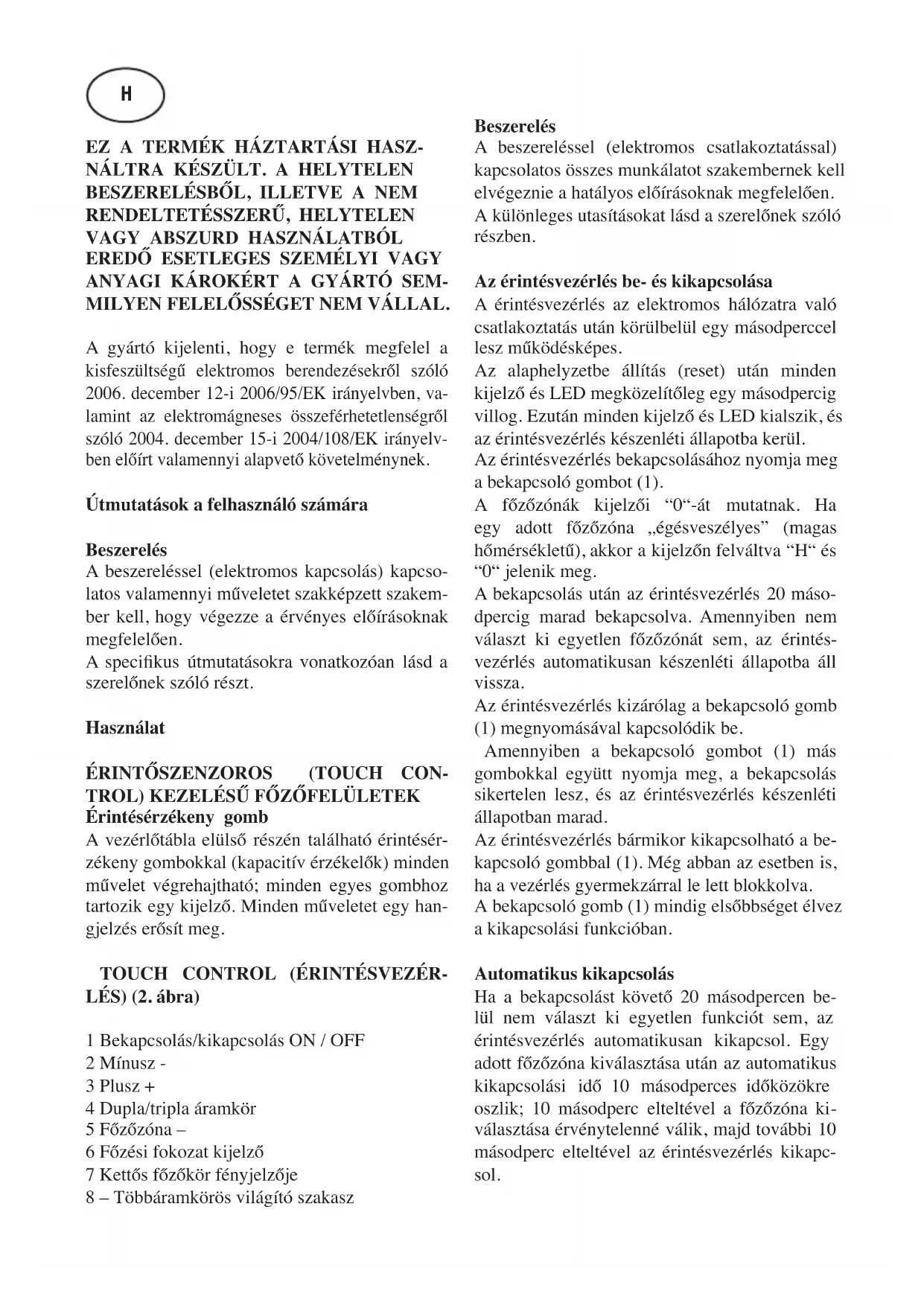 LÉS) (2. ábra) 1 Bekapcsolás/kikapcsolás ON / OFF 2 Mínusz - 3 Plusz + 4 Dupla/tripla áramkör 5 Főzőzóna – 6 Főzési fokozat kijelző 7 Kettős főzőkör fényjelzője 8 – Többáramkörös világító szakasz Beszerelés A beszereléssel (elektromos csatlakoztatással) kapcsolatos összes munkálatot szakembernek kell elvégeznie a hatályos előírásoknak megfelelően. A különleges utasításokat lásd a szerelőnek szóló részben. Az érintésvezérlés be- és kikapcsolása A érintésvezérlés az elektromos hálózatra való csatlakoztatás után körülbelül egy másodperccel lesz működésképes. Az alaphelyzetbe állítás (reset) után minden kijelző és LED megközelítőleg egy másodpercig villog. Ezután minden kijelző és LED kialszik, és az érintésvezérlés készenléti állapotba kerül. Az érintésvezérlés bekapcsolásához nyomja meg a bekapcsoló gombot (1). A főzőzónák kijelzői “0“-át mutatnak. Ha egy adott főzőzóna „égésveszélyes” (magas hőmérsékletű), akkor a kijelzőn felváltva “H“ és “0“ jelenik meg. A bekapcsolás után az érintésvezérlés 20 máso- dpercig marad bekapcsolva. Amennyiben nem választ ki egyetlen főzőzónát sem, az érintés- vezérlés automatikusan készenléti állapotba áll vissza. Az érintésvezérlés kizárólag a bekapcsoló gomb (1) megnyomásával kapcsolódik be. Amennyiben a bekapcsoló gombot (1) más gombokkal együtt nyomja meg, a bekapcsolás sikertelen lesz, és az érintésvezérlés készenléti állapotban marad. Az érintésvezérlés bármikor kikapcsolható a be- kapcsoló gombbal (1). Még abban az esetben is, ha a vezérlés gyermekzárral le lett blokkolva. A bekapcsoló gomb (1) mindig elsőbbséget élvez a kikapcsolási funkcióban. Automatikus kikapcsolás Ha a bekapcsolást követő 20 másodpercen be- lül nem választ ki egyetlen funkciót sem, az érintésvezérlés automatikusan kikapcsol. Egy adott főzőzóna kiválasztása után az automatikus kikapcsolási idő 10 másodperces időközökre oszlik; 10 másodperc elteltével a főzőzóna ki- választása érvénytelenné válik, majd további 10 másodperc elteltével az érintésvezérlés kikapc- sol. HEgy adott főzőzóna be- és kikapcsolása Ha az érintésvezérlés be van kapcsolva, az adott főzőzónát a hozzá tartozó gomb (5) megnyomá- sával választhatja ki. A kiválasztott főzőzóna kijelzője (6) fényesebbé válik, miközben a többi kijelző elhalványodik. Ha a főzőzóna „égésveszélyes”, akkor a “H” és “0” jelzések felváltva jelennek meg. A PLUSZ (3) illetve MINUSZ (2) gomb megn- yomásával kiválaszthat egy adott főzési fokoza- tot, majd a főzőzóna melegíteni kezd. A főzőzóna kiválasztása után, a PLUSZ (3) gomb megnyomásával kiválaszthatja a főzési fokozatot; ez az 1-es szintről indulva 0,4 másodpercenként egy-egy egységgel növelhető. A 9-es szint eléré- se után a főzési fokozat tovább nem növelhető. Ha a főzési fokozatot a MÍNUSZ (2) gombbal választotta ki, a kiindulási szint a 9-es (maximá- lis szint). A gombot benyomva tartva a főzési fokozat 0,4 másodpercenként egy-egy egységgel csökken. A 0 szint elérése után a főzési fokozat nem csökkenthető tovább. A beállított főzési fokozatot csak a PLUSZ (2), illetve MÍNUSZ (3) gombok újbóli megnyomásával lehet módosíta- ni. Egy adott főzőzóna kikapcsolása A kikapcsolandó főzőzónát a hozzá tartozó (5) gombbal tudja kiválasztani. A kiválasztott főzőzóna kijelzője (6) fényesebb lesz, miköz- ben a többi kijelző elhalványodik. A PLUSZ (3), illetve MÍNUSZ (2) gombok egyidejű megnyo- másával az adott főzőzóna főzési fokozata 0-ra áll. Választhatja azt a megoldást is, hogy a főzési fokozatot a MÍNUSZ (2) gombbal csökkenteni le a 0-ra. Ha egy adott főzőzóna „égésveszélyes”, akkor a kijelzőn felváltva “H“ és “0“ jelzés jelenik meg. Az összes főzőzóna kikapcsolása A bekapcsoló gomb (1) megnyomásával az ös- szes főzőzóna bármikor azonnal kikapcsolható. Készenléti üzemmódban egy “H“ jelenik meg az összes „égésveszélyes” főzőzóna kijelzőjén. Az összes többi kijelző kikapcsol. Főzési fokozat A főzőzónák 9 főzési fokozattal rendelkeznek, amelyek “1“-től “9“-ig terjedő számjelzés- sel jelennek meg a hét szegmensből álló LED kijelzőkön (6). Maradékhő kijelző Jelzi a felhasználónak, hogy az üvegkerámia hőmérséklete veszélyes a főzőzóna területével való érintkezés esetén. A hőmérséklet egy ma- tematikai modell szerint kerül meghatározásra, és maradékhő esetén az adott hét szegmensű kijelzőn egy “H” jelzi. A melegítés és a hűtés az alábbiak alapján kerül kiszámításra:
