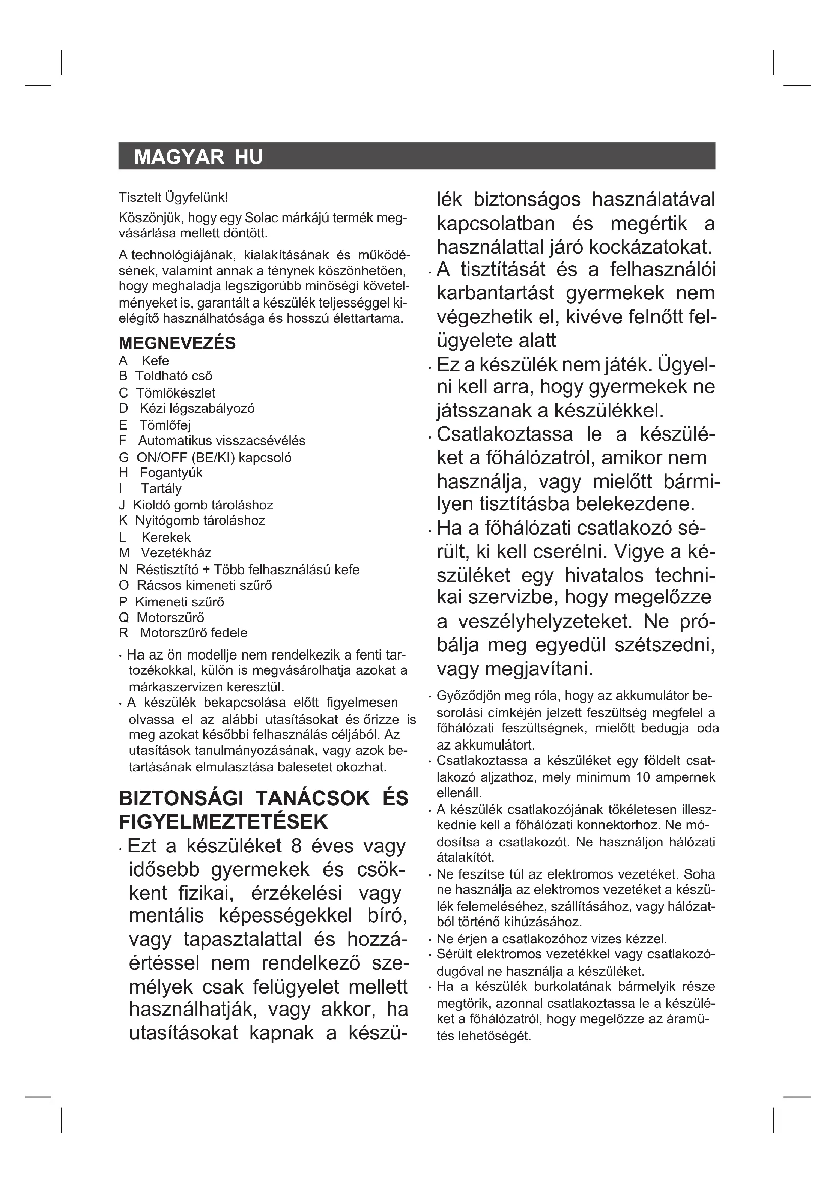 - Tento výrobok neobsahuje koncentrácie látok, ktoré by mohli byť považované za nebezpečné pre životné prostredie. Táto značka znamená, že zariadenie sa pri likvidovaní na konci jeho prevádzkovej životnosti musí odovzdať do schválenej zberne separovaného odpadu pre staré elektric- ké a elektronické zariadenia (WEEE). Tento prístroj je v súlade so smernicou č. 2014/35/ EU o nízkom napätí, smernicou č. 2014/30/EU o elektromagnetickej kompatibilite, smernicou č. 2011/65/EÚ o obmedzení používania určitých nebezpečných látok v elektrických a elektronic- kých zariadeniach a smernicou č. 2009/125/EC o požiadavkách na ekodizajn výrobkov využíva- júcich energiu.:MAGYAR HU Tisztelt Ügyfelünk! Köszönjük, hogy egy Solac márkájú termék meg- vásárlása mellett döntött. A technológiájának, kialakításának és működé- sének, valamint annak a ténynek köszönhetően, hogy meghaladja legszigorúbb minőségi követel- ményeket is, garantált a készülék teljességgel ki- elégítő használhatósága és hosszú élettartama. MEGNEVEZÉS A Kefe B Toldható cső C Tömlőkészlet D Kézi légszabályozó E Tömlőfej F Automatikus visszacsévélés G ON/OFF (BE/KI) kapcsoló H Fogantyúk I Tartály J Kioldó gomb tároláshoz K Nyitógomb tároláshoz L Kerekek M Vezetékház N Réstisztító + Több felhasználású kefe O Rácsos kimeneti szűrő P Kimeneti szűrő Q Motorszűrő R Motorszűrő fedele