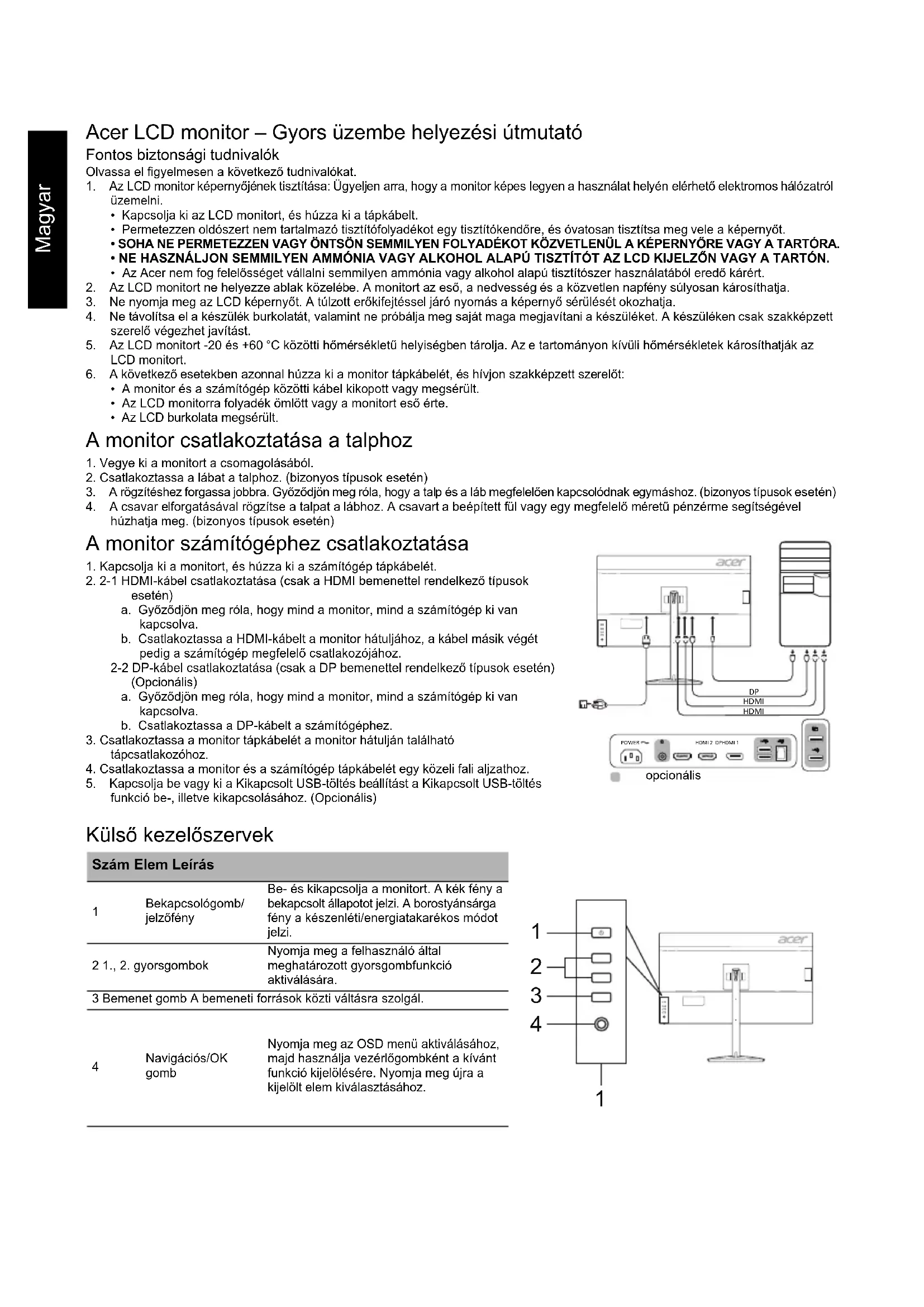 Bemenet Menü/Navigációs/OK Funkciók Fényerő Kontraszt Kék fény Sötét élénkítése ACM HDR*** Szuper élesség Gamma Színhőmérséklet Módok Színtér Szürkeárnyalatos mód 6 tengelyes színárnyalat 6 tengelyes telítettség Hangerő Némítás Túlhajtás FreeSync Premium** Frissítési frekvencia száma Rendkívül alacsony késleltetés Célzópont Nyelv OSD időkorlátja Átlátszóság OSD zár Bemenet Automatikus forrás DP-formátum Gyorsgomb hozzárendelése Széles mód PIP/PBP DDC/CI HDMI Feketeszint Gyorsindítás mód Túlhúzás# USB-töltés kikapcsolt állapotban Kijelzőinformációk Állítsa vissza az összes beállítást Kilépés A műszaki adatok típusonként és/vagy régiónként eltérőek lehetnek.Ελληνικά Οδηγός γρήγορης εγκατάστασης οθόνης LCD Acer (ΟΓΕ) Σημαντικές οδηγίες ασφαλείας Διαβάστε προσεκτικά τις ακόλουθες οδηγίες. 1. Για να καθαρίσετε την οθόνη LCD: Βεβαιωθείτε ότι η οθόνη σας είναι ηλεκτρικά χαρακτηρισμένη για λειτουργία με το εναλλασσόμενο ρεύμα που είναι διαθέσιμο στην περιοχή σας.• Απενεργοποιήστε την οθόνη LCD και αποσυνδέστε το καλώδιο ρεύματος.• Ψεκάστε με διάλυμα καθαρισμού χωρίς διαλύτες πάνω σε ένα πανί και καθαρίστε την οθόνη απαλά.