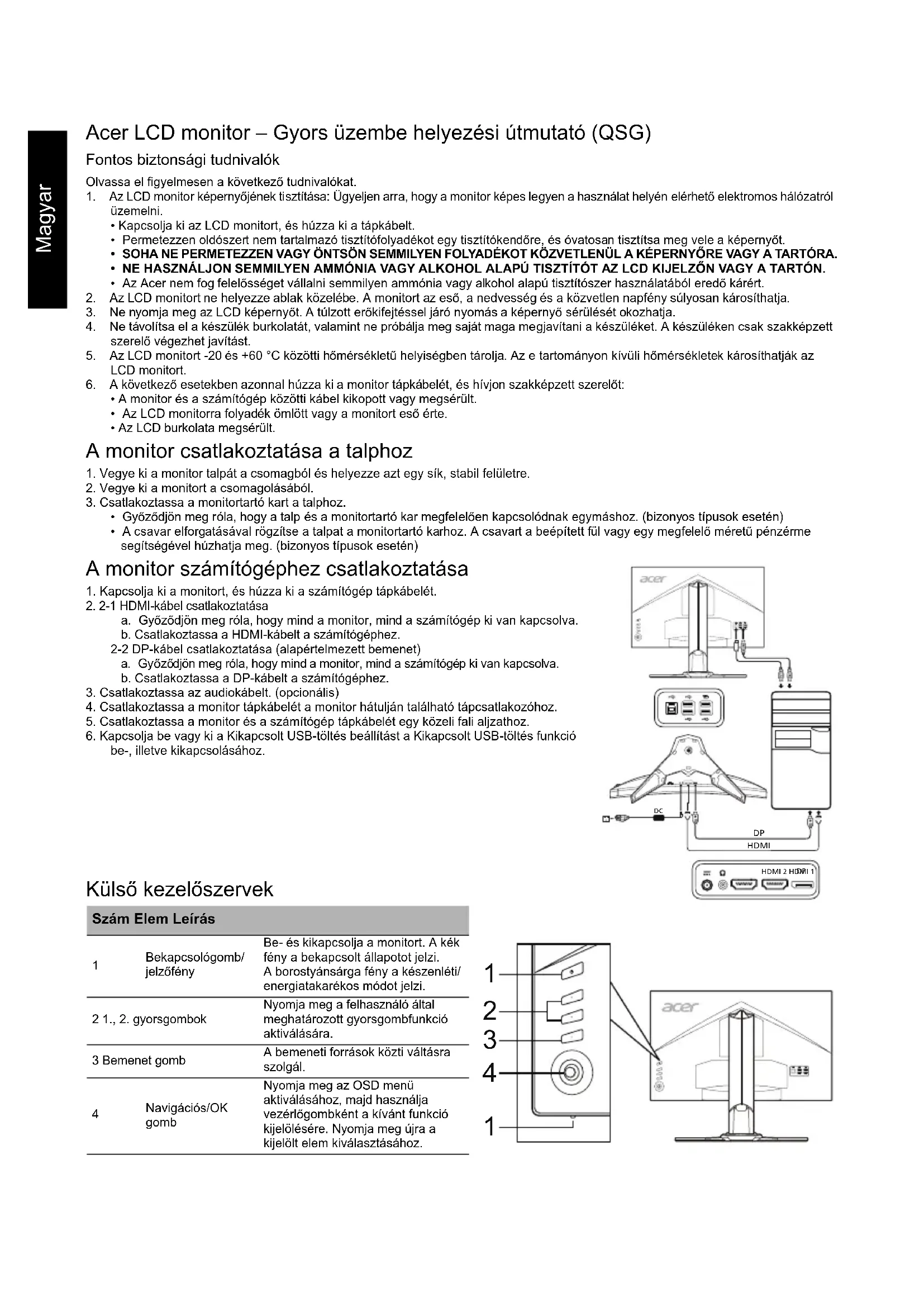 a. Győződjön meg róla, hogy mind a monitor, mind a számítógép ki van kapcsolva. b. Csatlakoztassa a HDMI-kábelt a számítógéphez.2-2 DP-kábel csatlakoztatása (alapértelmezett bemenet) a. Győződjön meg róla, hogy mind a monitor, mind a számítógép ki van kapcsolva. b. Csatlakoztassa a DP-kábelt a számítógéphez.3. Csatlakoztassa az audiokábelt. (opcionális)4. Csatlakoztassa a monitor tápkábelét a monitor hátulján található tápcsatlakozóhoz.5. Csatlakoztassa a monitor és a számítógép tápkábelét egy közeli fali aljzathoz. 6. Kapcsolja be vagy ki a Kikapcsolt USB-töltés beállítást a Kikapcsolt USB-töltés funkció be-, illetve kikapcsolásához. Külső kezelőszervek Szám Elem Leírás