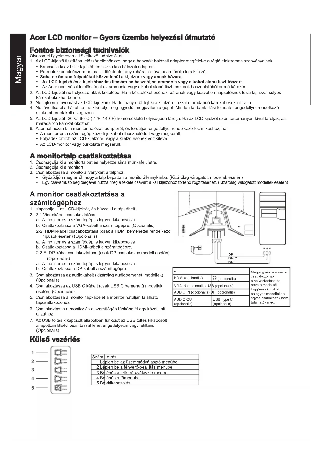 Megjegyzés: a monitor csatlakozóinak elhelyezkedése és neve a modelltől függően változhat, és egyes modelleken egyes csatlakozók nem találhatók meg. HDMI (opcionális) (opcionális) VGA IN (opcionális) USB (opcionális) AUDIO IN (opcionális) DP (opcionális) AUDIO OUT (opcionális) USB Type C (opcionális) Külső vezérlés Szám Leírás 1 Lépjen be az üzemmódválasztó menübe. 2 Lépjen be a fényerő-beállítás menübe. 3 Belépés a jelforrás-választó módba. 4 Belépés a főmenübe. 5 Be-/kikapcsolás.Magyar Szabályozó és biztonsági nyilatkozatok FCC-nyilatkozat A berendezést tesztnek vetették alá, amely során megállapították, hogy megfelel az FCC-előírások 15. fejezete szerinti B osztályú digitális eszközökre vonatkozó korlátozásoknak. Ezen korlátozások célja, hogy ésszerű védelmet biztosítsanak a káros interferenciával szemben a készülék lakóterületen történő telepítése esetén. A készülék rádiófrekvenciás energiát generál, használ és sugározhat, és ha nem az utasításoknak megfelelően telepítik és használják, akkor zavarhatja a rádiókommunikációt. Azonban nem garantálható, hogy adott esetben nem jelentkezik interferencia. Ha az készülék zavarja a rádió- vagy a televízióvételt (amelyet a kapcsolóberendezés határozhat meg), akkor az interferencia kiküszöbölése érdekében ajánlott végrehajtani az alábbi intézkedések közül egyet vagy többet: