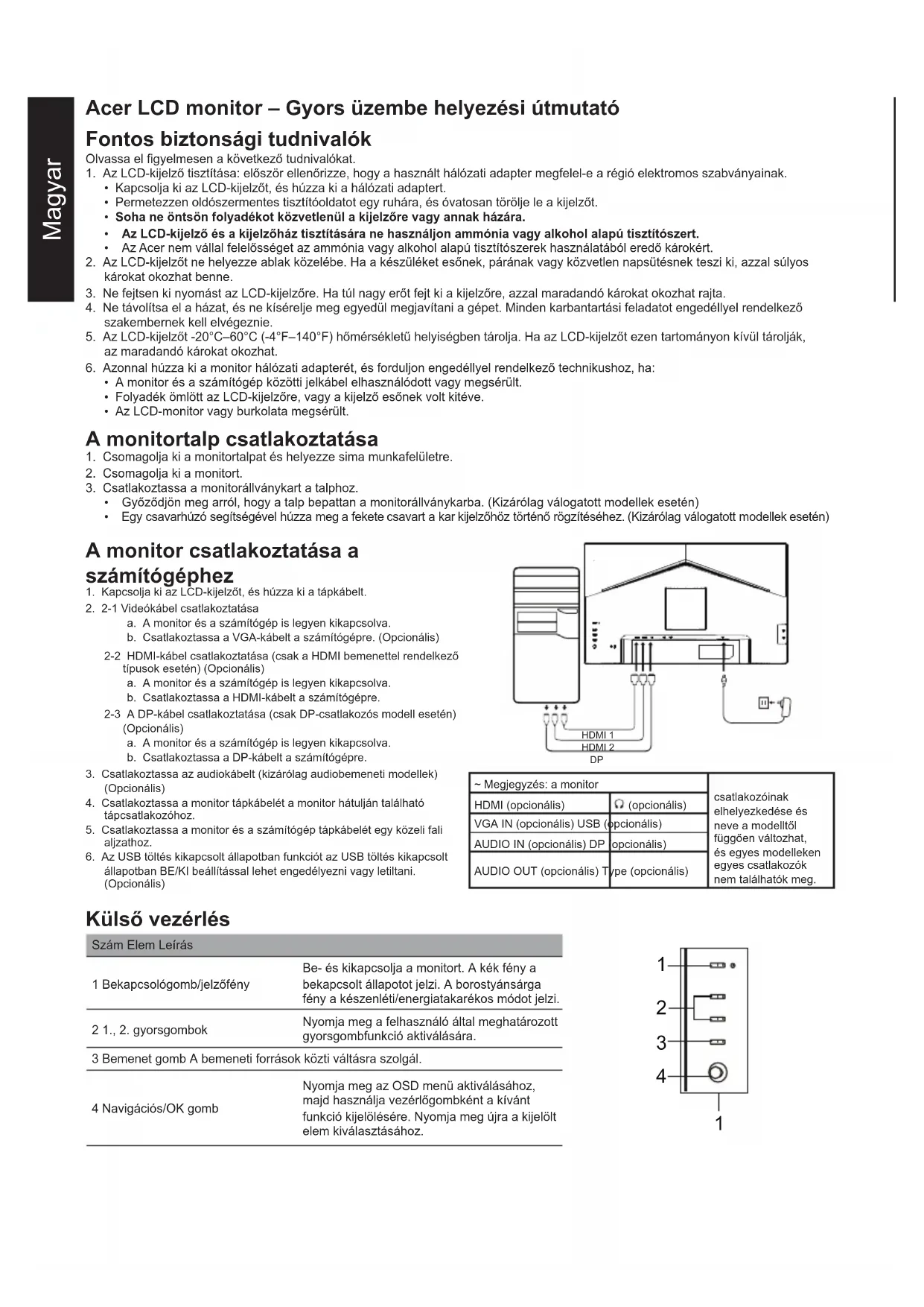 Bemenet Menü/Navigációs/OK Funkciók Fényerő Kontraszt Kék fény Feketeszint-javítás ACM Szuperéles kép Gamma Színhőmérséklet Üzemmódok sRGB mód Szürkeárnyalat üzemmód 6 tengelyes színárnyalat 6 tengelyes telítettség Hangerő Némítás Túlhajtás Adaptive Sync Frissítési gyakoriság szám Nyelv OSD időtúllépés Átlátszóság OSD lezárása Bemenet Auto bemenetválasztás Széles mód Billentyűkombináció-kiosztás DDC/CI HDMI fekete szint Gyors indítás mód USB-töltés kikapcsolt állapotban Információk A műszaki adatok típusonként és/vagy régiónként eltérőek lehetnek. Acer termékéhez kézikönyveket és egyéb dokumentumokat a hivatalos Acer támogató weboldalon találhat.Ελληνικά Οδηγός γρήγορης εγκατάστασης οθόνης LCD Acer (ΟΓΕ) Σημαντικές οδηγίες ασφαλείας ∆ιαβάστε προσεκτικά τις ακόλουθες οδηγίες. 1. Για να καθαρίσετε την οθόνη LCD: Βεβαιωθείτε αρχικά ότι το τροφοδοτικό που χρησιμοποιείτε αντιστοιχεί στα ηλεκτρολογικά πρότυπα της περιοχής σας.