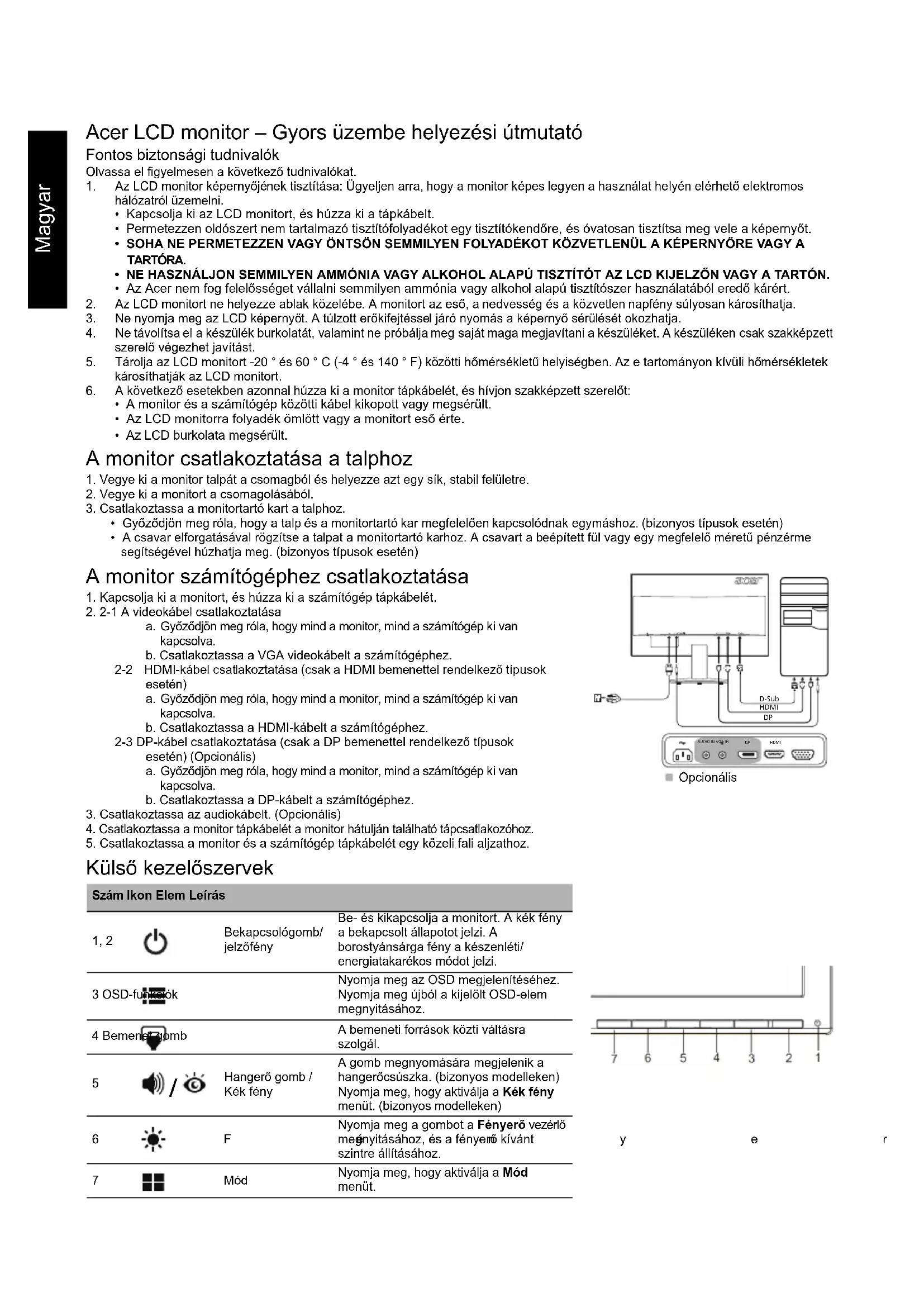 (jellemző) Kontraszt Max. 100 000 000:1 (ACM) Betekintési szög 178° (vízszintes) 178° (függőleges) (CR=10) 90° (vízszintes) 65° (függőleges) (CR=10) Válaszidő 4 ms (G–G) 5 ms Paneltípus VA TN Videó R, G, B analóg felület Vízszintes frekvencia 30 kHz – 80 kHz Függőleges frekvencia 55 – 75 Hz Megjeleníthető színek 16,7 millió Videoórajel 175 MHz Maximális felbontás 1920 x 1080 60 Hz-en Plug&Play VESA DDCCI/DDC2B Fogyasztás (200 nit fényerő mellett) Bekapcsolt állapot 19 W 19 W Alvó állapot 0,5 W 0,5 W Kikapcsolt állapot 0,3 W) 0,3 W Bemeneti csatlakozó D-Sub HDMI (csak a HDMI bemenettel rendelkező típusnál) DP (csak a DP bemenettel rendelkező típusnál) (opcionális) Bemeneti videojel Analóg: 0,7 Vp-p (normál), 75 OHM, pozitív HDMI (csak a HDMI bemenettel rendelkező típusnál) (opcionális) DP (csak a DP bemenettel rendelkező típusnál) (opcionális) Hangszórók 1 W x 2 (opcionális) Maximális képernyőméret Vízszintes: 476,6 mm Függőleges: 268,1 mm Áramforrás 100–240 V, 50/60 Hz Környezetre vonatkozó követelmények: Üzemi hőmérséklet: 5 °C és 35 °C között Tárolási hőmérséklet: -20 °C és 60 °C között Üzemi páratartalom: 10% és 85% között Méretek 508 (szé) × 390,5 (ma) × 207 (mé) mm Tömeg (nettó) 3,1 kg (nettó) Mechanikai jellemzők Dőlés: -5° és +25° között Elfordulás: Nincs Magasságbeállítás: Nincs Elfordítható: Nem Levehető talp: Van Külső kezelőszervek Kapcsoló/gombok Bekapcsológomb MENU/ENTER Bemenet Hangerő gomb/Kék fény Fényerő Mód Funkciók Fényerő Kontraszt Kék fény ACM Vízszintes pozíció (csak az analóg bemenetű típusnál) Függőleges pozíció (csak az analóg bemenetű típusnál) Fókusz (csak az analóg bemenetű típusnál) Órajel (csak az analóg bemenetű típusnál) Automatikus konfiguráció (csak az analóg bemenetű típusnál) Gamma Színhőmérséklet sRGB 6 tengelyes színárnyalat 6 tengelyes telítettség Hangerő (opcionális) Nyelv OSD időkorlátja Bemenet DP-formátum (opcionális) Széles mód Automatikus forrás Túlhajtás (opcionális) Gyorsgomb kiosztása DDC/CI Gyorsindítás mód Kijelzőinformációk Minden beállítás visszaállítása A műszaki adatok típusonként és/vagy régiónként eltérőek lehetnek.Ελληνικά Οδηγός γρήγορης εγκατάστασης οθόνης LCD Acer (ΟΓΕ) Σημαντικές οδηγίες ασφαλείας Διαβάστε προσεκτικά τις ακόλουθες οδηγίες. 1. Για να καθαρίσετε την οθόνη LCD: Βεβαιωθείτε ότι η οθόνη σας είναι ηλεκτρικά χαρακτηρισμένη για λειτουργία με το εναλλασσόμενο ρεύμα που είναι διαθέσιμο στην περιοχή σας.