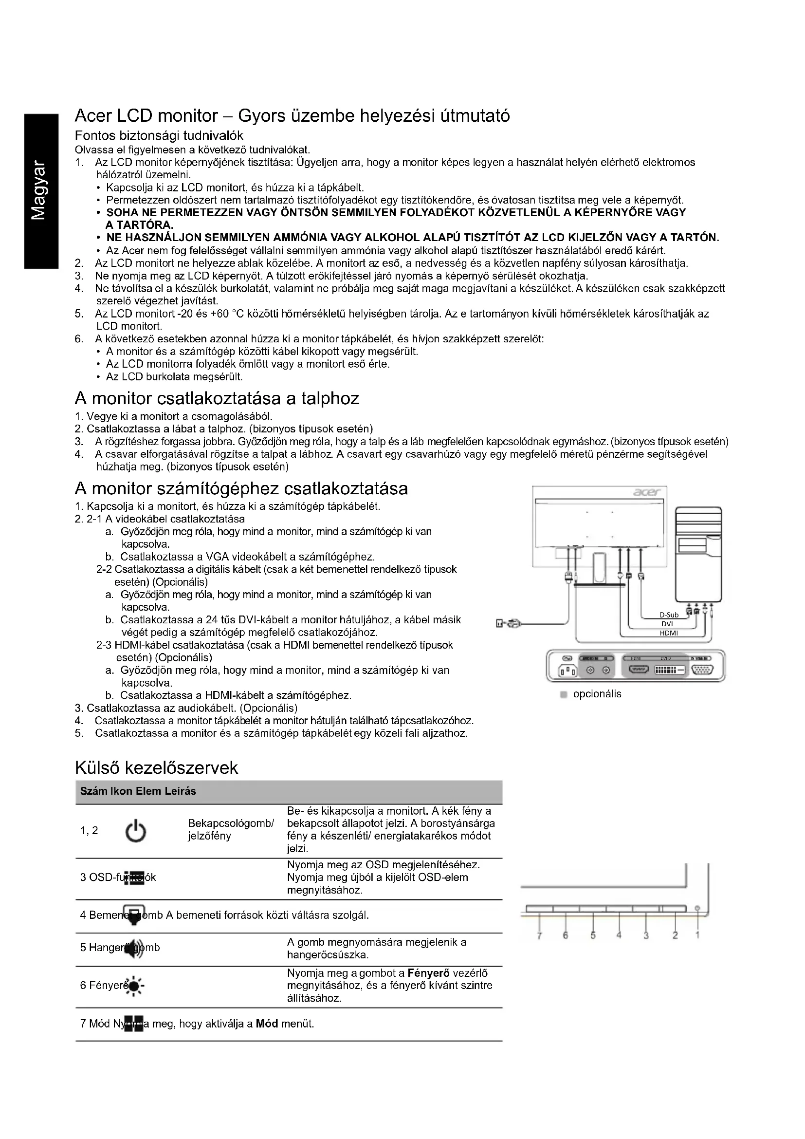 (jellemző) Kontraszt Max. 100 000 000:1 (ACM) Betekintési szög 178° (vízszintes) 178° (függőleges) (CR=10) Válaszidő 4 ms (G–G) Paneltípus VA Videó R, G, B analóg felület Vízszintes frekvencia 31 kHz – 83 kHz Függőleges frekvencia 56 – 76 Hz Megjeleníthető színek 16,7 millió Videoórajel VGA/HDMI: 170 MHz DVI: 165 MHz Maximális felbontás 1920 × 1080 60 Hz-en Plug&Play VESA DDCCI/DDC2B Energiagazdaságossági besorolás B *Éves energiafogyasztás 38 (kWh) (a HDMI bemenettel rendelkező típus esetén) Fogyasztás (200 nit fényerő mellett) Bekapcsolt állapot 21 W (jellemző) Alvó állapot 0,5 W (jellemző) Kikapcsolt állapot 0,35 W (jellemző) Bemeneti csatlakozó D-Sub 24 tűs DVI-D (csak a két bemenettel rendelkező típusnál) (opcionális) HDMI (csak a HDMI bemenettel rendelkező típusnál) (opcionális) Bemeneti videojel Analóg: 0,7 Vp-p (normál), 75 OHM, pozitív Digitális jel (csak a két bemenettel rendelkező típusnál) (opcionális) HDMI (csak a HDMI bemenettel rendelkező típusnál) (opcionális) Hangszórók 2 W × 2 (Opcionális) Maximális képernyőméret Vízszintes: 534,74 mm Függőleges: 313,26 mm Áramforrás 100–240 V, 50/60 Hz Környezetre vonatkozó követelmények: Üzemi hőmérséklet: 0 °C és 40 °C között Tárolási hőmérséklet: -20 °C és 60 °C között Üzemi páratartalom: 20% és 80% között Méretek 539,9 (szé) × 409,4 (ma) × 207,4 (mé) mm Tömeg (nettó) 3,91 kg (nettó) Mechanikai jellemzők Dőlés: -5° és +25° között (Csak a készülék legmagasabb pontján mérhető 25 fokos dőlésszög) Vízszintesen elfordítható: Nem Magasságállítás: Nem Függőlegesen elfordítható: Nem Levehető talp: igen (csavaros rögzítésű levehető talp) Külső kezelőszervek Kapcsoló/gombok Bekapcsológomb MENU/ENTER Bemenet Hangerő Fényerő Mód Funkciók Fényerő Kontraszt Kék fény ACM Vízszintes pozíció (csak az analóg bemenetű típusnál) Függőleges pozíció (csak az analóg bemenetű típusnál) Fókusz (csak az analóg bemenetű típusnál) Órajel (csak az analóg bemenetű típusnál) Automatikus konfiguráció (csak az analóg bemenetű típusnál) Gamma Színhőmérséklet sRGB mód 6 tengelyes színárnyalat 6 tengelyes telítettség Hangerő Nyelv OSD időkorlátja Bemenet Automatikus forrás Túlhajtás Gyorsgomb kiosztása Széles mód DDC/CI Gyorsindítás mód Kijelzőinformációk Minden beállítás visszaállítása A műszaki adatok értesítés nélkül változhatnak.Ελληνικά Οδηγός γρήγορης εγκατάστασης οθόνης LCD Acer (ΟΓΕ) Σημαντικές οδηγίες ασφαλείας ∆ιαβάστε προσεκτικά τις ακόλουθες οδηγίες. 1. Για να καθαρίσετε την οθόνη LCD: Βεβαιωθείτε ότι η οθόνη σας είναι ηλεκτρικά χαρακτηρισμένη για λειτουργία με το εναλλασσόμενο ρεύμα που είναι διαθέσιμο στην περιοχή σας.