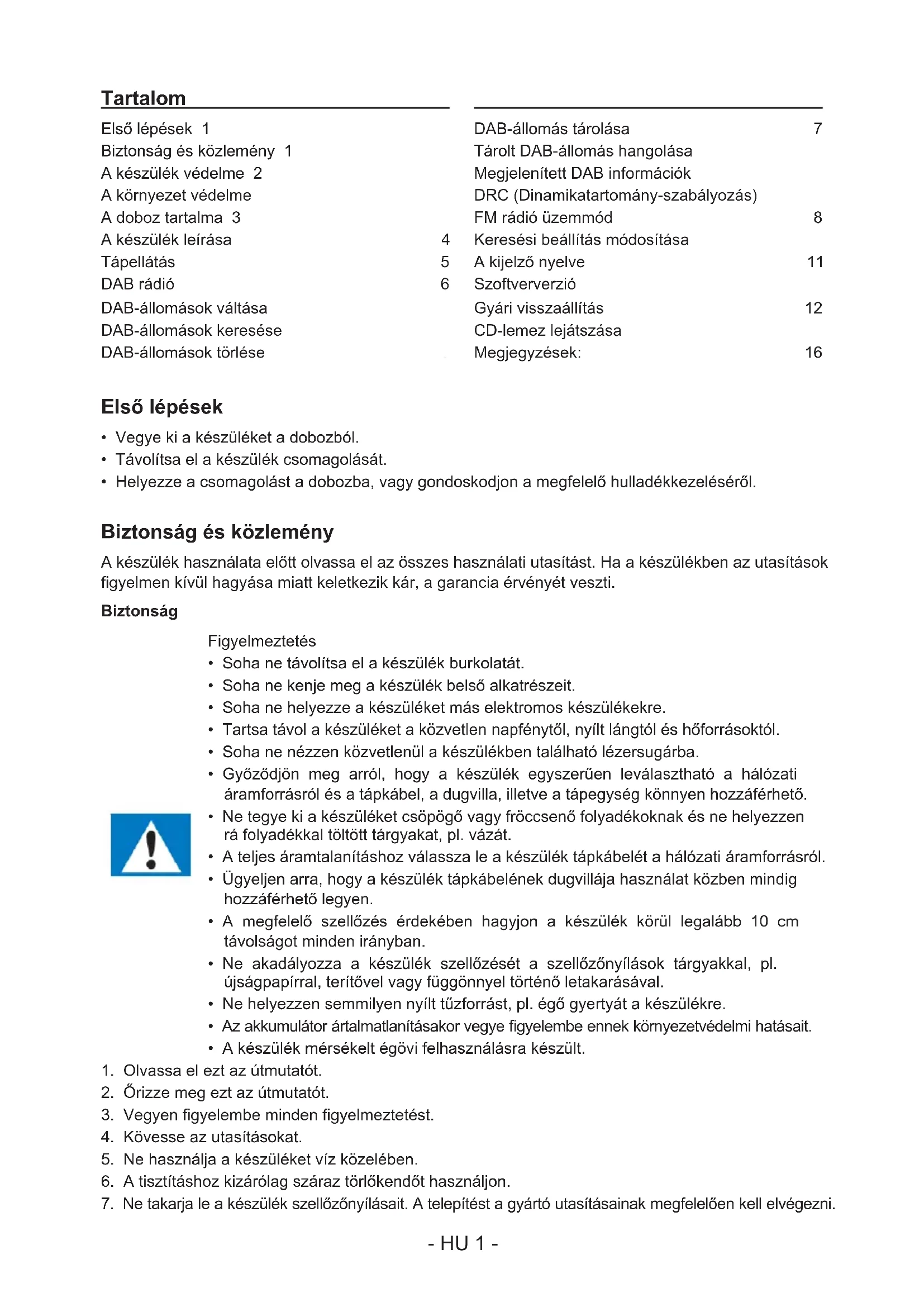 Első lépések 1 Biztonság és közlemény 1 A készülék védelme 2 A környezet védelme 2 A doboz tartalma 3 A készülék leírása 4 Tápellátás 5 DAB rádió 6 DAB-állomások váltása 6 DAB-állomások keresése 6 DAB-állomások törlése 6 DAB-állomás tárolása 7 Tárolt DAB-állomás hangolása 7 Megjelenített DAB információk 7 DRC (Dinamikatartomány-szabályozás) 7 FM rádió üzemmód 8 Keresési beállítás módosítása 8 A kijelző nyelve 11 Szoftververzió 11 Gyári visszaállítás 12 CD-lemez lejátszása 12 Megjegyzések: 16 Tartalom- HU 2 -