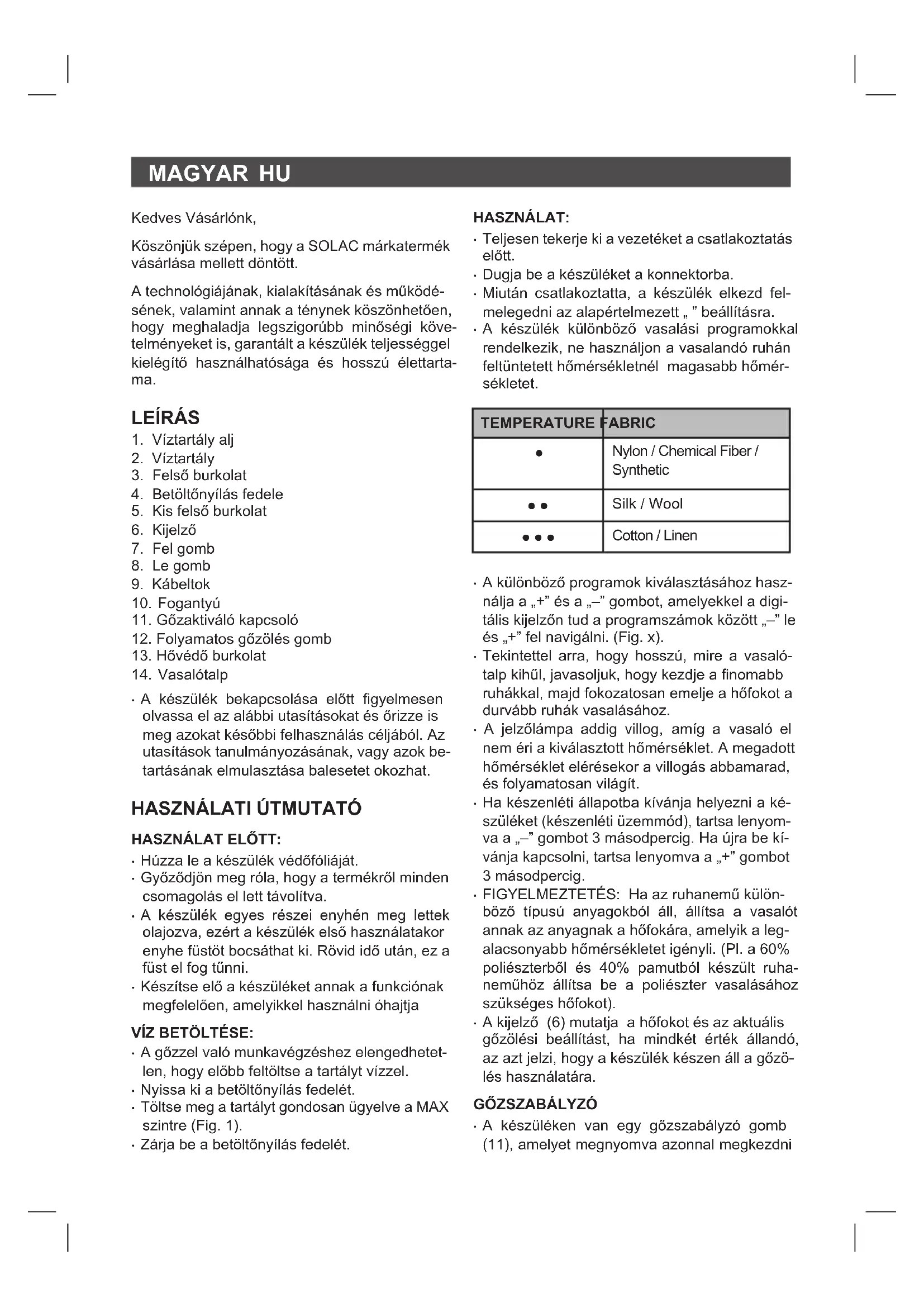- A készülék különböző vasalási programokkal rendelkezik, ne használjon a vasalandó ruhán feltüntetett hőmérsékletnél magasabb hőmér- sékletet.