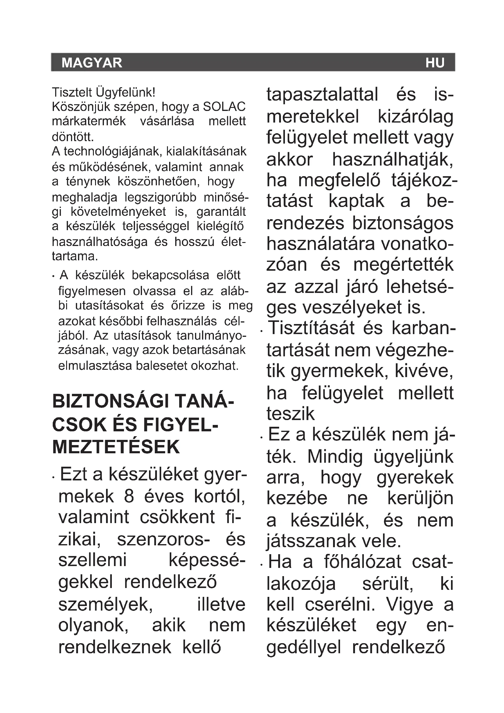 - Tento výrobok neobsahuje kon- centrácie látok, ktoré by mohli byť považované za nebezpečné pre životné prostredie. - Tento symbol znamená, že ak produkt chcete po skončení jeho životnosti zlikvidovať, od- neste ho do autorizovanej zberne odpadu z elektrických a elektronic- kých zariadení (WEE). Tento prístroj je v súlade so smer- nicou č. 2014/35/ES o nízkom napätí, smernicou č. 2014/30/ES o elektromagnetickej kompatibi- lite, smernicou č. 2011/65/EÚ o obmedzení používania určitých nebezpečných látok v elektrických a elektronických zariadeniach a smernicou č. 2009/125/ES o po- žiadavkách na ekodizajn výrobkov využívajúcich energiu.MAGYAR HU Tisztelt Ügyfelünk! Köszönjük szépen, hogy a SOLAC márkatermék vásárlása mellett döntött. A technológiájának, kialakításának és működésének, valamint annak a ténynek köszönhetően, hogy meghaladja legszigorúbb minősé- gi követelményeket is, garantált a készülék teljességgel kielégítő használhatósága és hosszú élet- tartama.