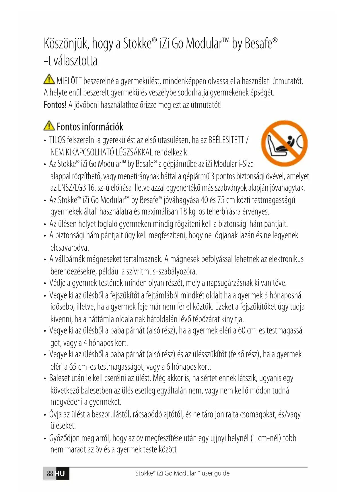 - Jamstvo prestaje vrijediti: ako nemate račun, ako su kvarovi nastali pogrešnim ili nepri- mjerenim korištenjem, ako su kvarovi nastali namjernom krivom upotrebom, pogrešnom upotrebom ili nemarom.Stokke® iZi Go Modular™ user guide 88 HU Köszönjük, hogy a Stokke® iZi Go Modular™ by Besafe® -t választotta MIELŐTT beszerelné a gyermekülést, mindenképpen olvassa el a használati útmutatót. A helytelenül beszerelt gyermekülés veszélybe sodorhatja gyermekének épségét. Fontos! A jövőbeni használathoz őrizze meg ezt az útmutatót! Fontos információk