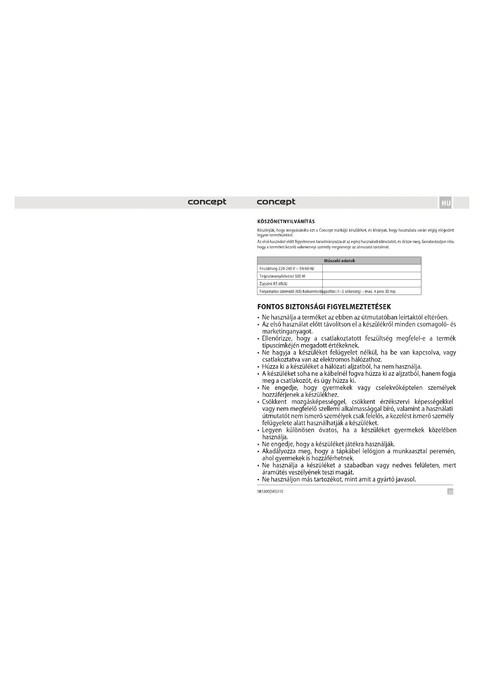 Köszönjük, hogy megvásárolta ezt a Concept márkájú készüléket, és kívánjuk, hogy használata során végig elégedett legyen termékünkkel. Az első használat előtt figyelmesen tanulmányozza át az egész használati útmutatót, és őrizze meg. Gondoskodjon róla, hogy a terméket kezelő valamennyi személy megismerje az útmutató tartalmát. Műszaki adatok Feszültség 220-240 V ~ 50/60 Hz Teljesítményfelvétel 500 W Zajszint 85 dB(A) Folyamatos üzemidő (KB) habverés/dagasztás (1–5 sebesség) – max. 4 perc 30 mp