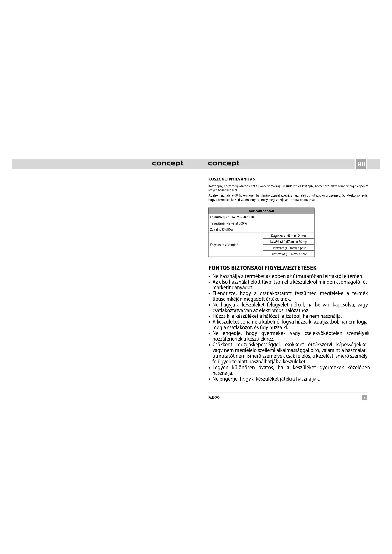 Köszönjük, hogy megvásárolta ezt a Concept márkájú készüléket, és kívánjuk, hogy használata során végig elégedett legyen termékünkkel. Az első használat előtt figyelmesen tanulmányozza át az egész használati útmutatót, és őrizze meg. Gondoskodjon róla, hogy a terméket kezelő valamennyi személy megismerje az útmutató tartalmát. Műszaki adatok Feszültség 220-240 V ~ 50-60 Hz Teljesítményfelvétel 800 W Zajszint 85 dB(A) Folyamatos üzemidő Dagasztás (KB max) 2 perc Kávédaráló (KB max) 30 mp Habverés (KB max) 3 perc Turmixolás (KB max) 3 perc