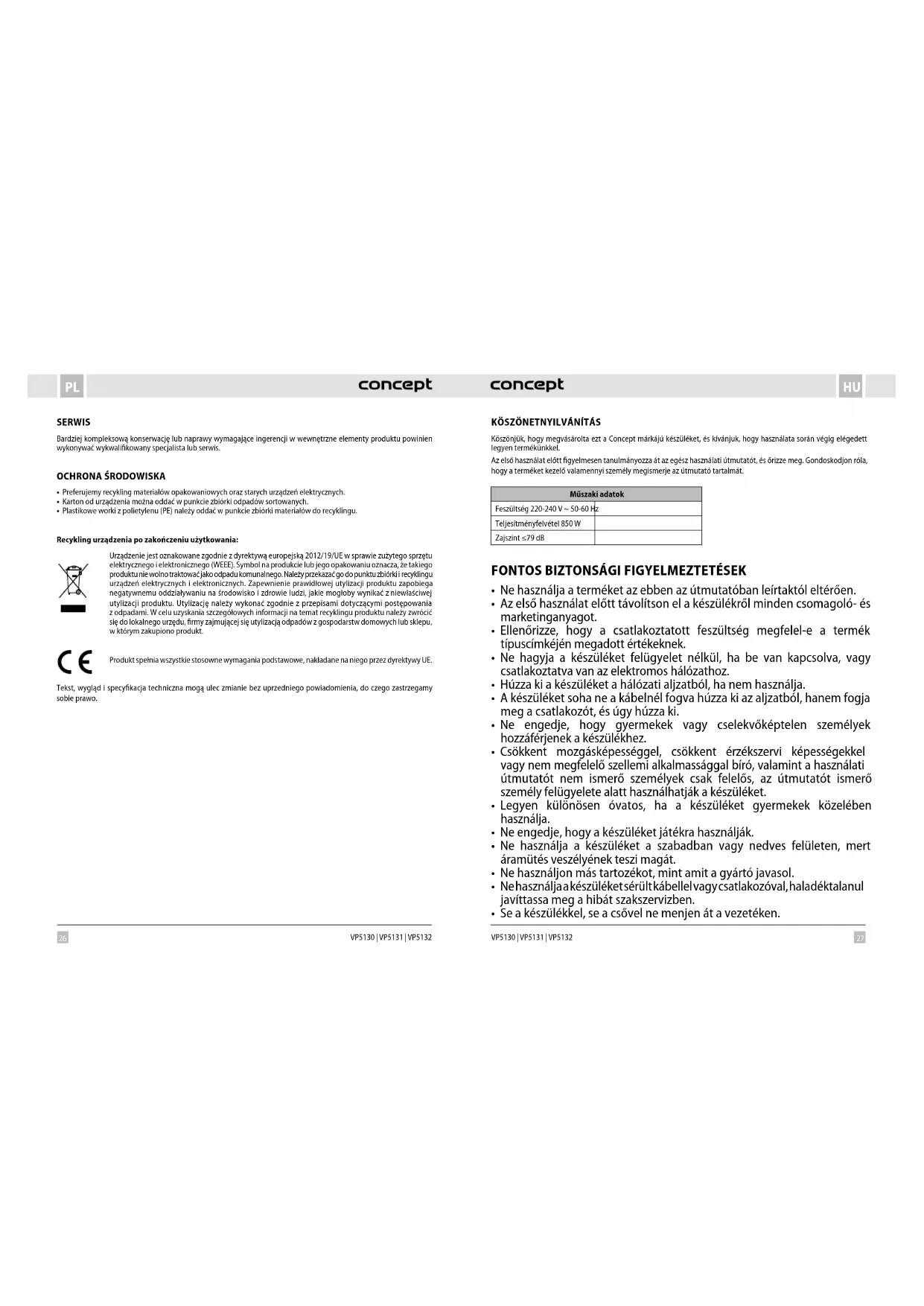 - A polietilén (PE) műanyagzacskókat adja le újrahasznosítható anyagokat gyűjtő helyen. A készülék újrahasznosítása az élettartama végén: Ez a készülék az európai Elektromos hulladékról és elektromos berendezésekről (WEEE) szóló 2012/19/ EU irányelvnek megfelelően van megjelölve. A terméken vagy a csomagolásán található szimbólum jelzi, hogy a termék nem tartozik a vegyes háztartási hulladék közé. El kell vinni olyan helyre, ahol az elektromos és elektronikus hulladékot gyűjtik újrahasznosítás céljából. A termék megfelelő módon történő megsemmisítésének biztosításával megakadályozza a környezetet és az emberi egészséget veszélyeztető negatív hatásokat, amelyeket a nem megfelelő hulladék-megsemmisítés okozhatna. A megsemmisítést ahulladékgazdálkodási előírásoknak megfelelően kell végrehajtani. A termék újrahasznosítására vonatkozó részletesebb információkért forduljon az illetékes helyi hivatalhoz, a háztartási hulladék megsemmisítésével foglalkozó szolgáltatóhoz, vagy az üzlethez, ahol a terméket vásárolta. Ez a termék megfelel az összes vonatkozó EU irányelv követelményeinek. A szövegben, a kivitelben és a műszaki jellemzőkben előzetes figyelmeztetés nélkül sor kerülhet változtatásokra, minden módosításra vonatkozó jog fenntartva. PATEICĪBA Pateicamies par šīs “Concept” ierīces iegādi. Ceram, ka būsiet apmierināti ar šo izstrādājumu visu tā izmantošanas laiku. Pirms lietošanas rūpīgi izlasiet šo lietošanas instrukciju un uzglabājiet to drošā vietā, lai nepieciešamības gadījumā varētu pārlasīt. Nodrošiniet, lai arī citi cilvēki, kuri izmantos šo ierīci, pirms tās lietošanas būtu iepazinušies ar norādījumiem. Tehniskie dati Spriegums 220–240V ~ 50–60Hz Jauda 850W Skaņas intensitātes līmenis ≤79dB SVARĪGI DROŠĪBAS NORĀDĪJUMI