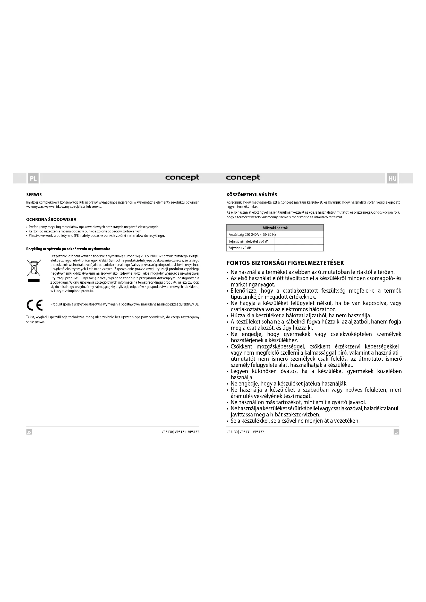 - A polietilén (PE) műanyagzacskókat adja le újrahasznosítható anyagokat gyűjtő helyen. A készülék újrahasznosítása az élettartama végén: Ez a készülék az európai Elektromos hulladékról és elektromos berendezésekről (WEEE) szóló 2012/19/ EU irányelvnek megfelelően van megjelölve. A terméken vagy a csomagolásán található szimbólum jelzi, hogy a termék nem tartozik a vegyes háztartási hulladék közé. El kell vinni olyan helyre, ahol az elektromos és elektronikus hulladékot gyűjtik újrahasznosítás céljából. A termék megfelelő módon történő megsemmisítésének biztosításával megakadályozza a környezetet és az emberi egészséget veszélyeztető negatív hatásokat, amelyeket a nem megfelelő hulladék-megsemmisítés okozhatna. A megsemmisítést ahulladékgazdálkodási előírásoknak megfelelően kell végrehajtani. A termék újrahasznosítására vonatkozó részletesebb információkért forduljon az illetékes helyi hivatalhoz, a háztartási hulladék megsemmisítésével foglalkozó szolgáltatóhoz, vagy az üzlethez, ahol a terméket vásárolta. Ez a termék megfelel az összes vonatkozó EU irányelv követelményeinek. A szövegben, a kivitelben és a műszaki jellemzőkben előzetes figyelmeztetés nélkül sor kerülhet változtatásokra, minden módosításra vonatkozó jog fenntartva. PATEICĪBA Pateicamies par šīs “Concept” ierīces iegādi. Ceram, ka būsiet apmierināti ar šo izstrādājumu visu tā izmantošanas laiku. Pirms lietošanas rūpīgi izlasiet šo lietošanas instrukciju un uzglabājiet to drošā vietā, lai nepieciešamības gadījumā varētu pārlasīt. Nodrošiniet, lai arī citi cilvēki, kuri izmantos šo ierīci, pirms tās lietošanas būtu iepazinušies ar norādījumiem. Tehniskie dati Spriegums 220–240V ~ 50–60Hz Jauda 850W Skaņas intensitātes līmenis ≤79dB SVARĪGI DROŠĪBAS NORĀDĪJUMI