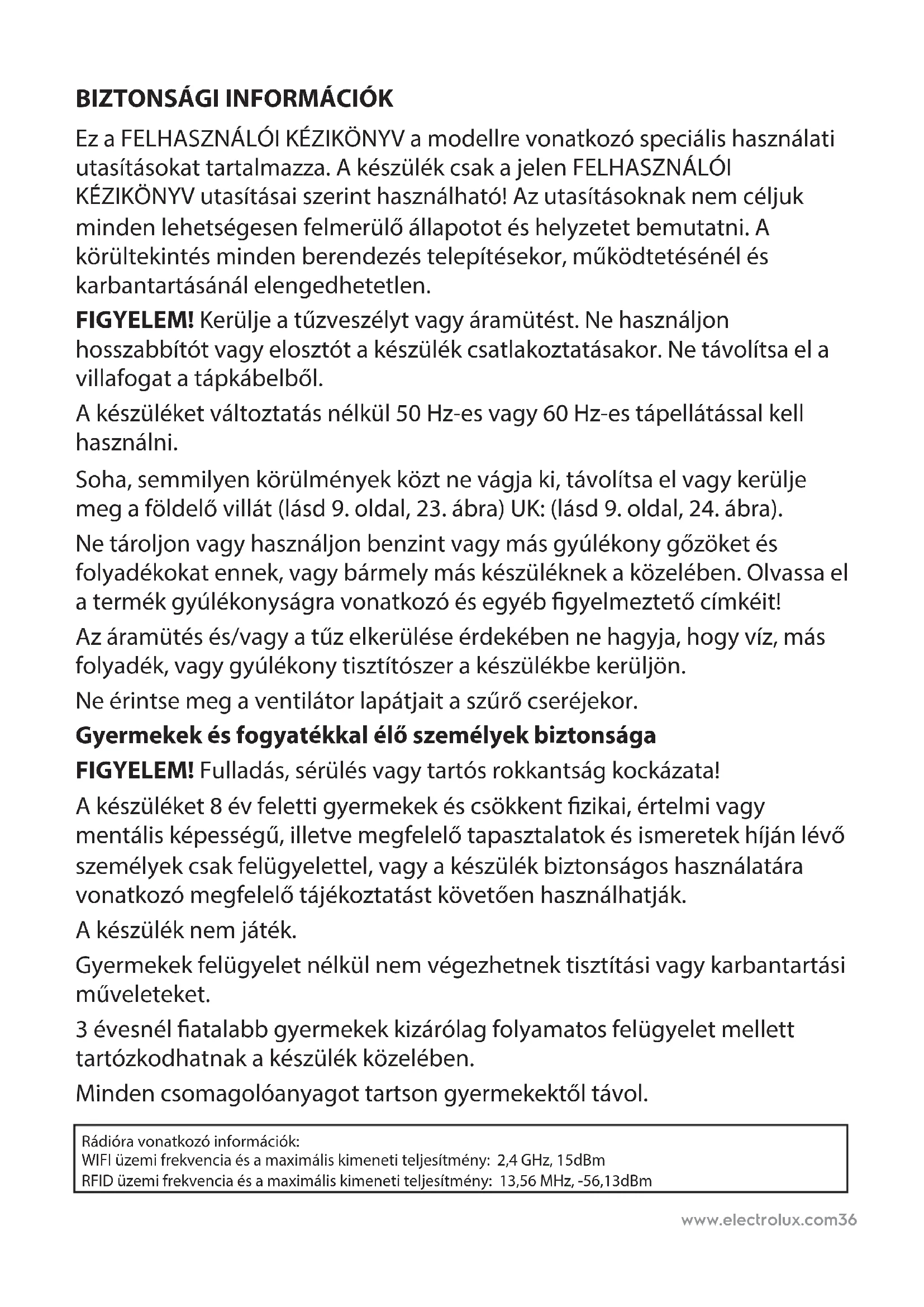 Ez a FELHASZNÁLÓI KÉZIKÖNYV a modellre vonatkozó speciális használati utasításokat tartalmazza. A készülék csak a jelen FELHASZNÁLÓI KÉZIKÖNYV utasításai szerint használható! Az utasításoknak nem céljuk minden lehetségesen felmerülő állapotot és helyzetet bemutatni. A körültekintés minden berendezés telepítésekor, működtetésénél és karbantartásánál elengedhetetlen. FIGYELEM! Kerülje a tűzveszélyt vagy áramütést. Ne használjon hosszabbítót vagy elosztót a készülék csatlakoztatásakor. Ne távolítsa ela villafogat a tápkábelből. A készüléket változtatás nélkül 50 Hz-es vagy 60 Hz-es tápellátással kell használni. Soha, semmilyen körülmények közt ne vágja ki, távolítsa el vagy kerülje meg a földelő villát (lásd 9. oldal, 23. ábra) UK: (lásd 9. oldal, 24. ábra). Ne tároljon vagy használjon benzint vagy más gyúlékony gőzöket és folyadékokat ennek, vagy bármely más készüléknek a közelében. Olvassa el a termék gyúlékonyságra vonatkozó és egyéb gyelmeztető címkéit! Az áramütés és/vagy a tűz elkerülése érdekében ne hagyja, hogy víz, más folyadék, vagy gyúlékony tisztítószer a készülékbe kerüljön. Ne érintse meg a ventilátor lapátjait a szűrő cseréjekor. Gyermekek és fogyatékkal élő személyek biztonsága FIGYELEM! Fulladás, sérülés vagy tartós rokkantság kockázata! A készüléket 8 év feletti gyermekek és csökkent zikai, értelmi vagy mentális képességű, illetve megfelelő tapasztalatok és ismeretek híján lévő személyek csak felügyelettel, vagy a készülék biztonságos használatára vonatkozó megfelelő tájékoztatást követően használhatják. A készülék nem játék. Gyermekek felügyelet nélkül nem végezhetnek tisztítási vagy karbantartási műveleteket. 3 évesnél atalabb gyermekek kizárólag folyamatos felügyelet mellett tartózkodhatnak a készülék közelében. Minden csomagolóanyagot tartson gyermekektől távol. Rádióra vonatkozó információk: WIFI üzemi frekvencia és a maximális kimeneti teljesítmény: 2,4 GHz, 15dBm RFID üzemi frekvencia és a maximális kimeneti teljesítmény: 13,56 MHz, -56,13dBmwww.electrolux.com 37 Elektromos információ FIGYELEM! Kerülje a tűzveszélyt vagy áramütést. Ha nem biztos benne, hogy a kimenet megfelelően földelt, vagy hogy időzített biztosítékkal vagy megszakítóval van védve, akkor a Nemzeti Elektromos Szabályzat rendelkezéseinek és a vonatkozó helyi előírásoknak megfelelően szakképzett villanyszerelőnek kell telepítenie a megfelelő elektromos csatlakozót. Ne használjon hosszabbítót vagy elosztót a készülék csatlakoztatásakor. Soha ne a tápkábelt húzva áramtalanítsa az egységet! Mindig határozottan fogja meg a dugót, és így húzza kiegyenesen a dugaszaljból. Ne csípje meg, hajlítsa meg, ne kössön csomót a tápkábelre. Ne vágja el és ne károsítsa a tápkábel. Ha a tápkábel megsérül, azt csak hivatalos Electrolux szerviz cserélheti. Ez a készülék nem tartalmaz felhasználó által javítható alkatrészeket. Mindig az illetékes Electrolux szervizzel javíttassa a készüléket. Ha a hálózati kábel megsérül, azt a gyártónak, a gyártó szerelőjének, vagy más, hasonlóan képzett személynek kikell cserélnie a veszélyhelyzet elkerülése érdekében. A tisztítás előtt az áramütés és a tűzveszély megelőzése érdekében feltétlenül áramtalanítsa a készüléket. MAGYAR Köszönjük, hogy az Electrolux PURE A9-40/PURE A9-60 légtisztítót választotta! A legjobb eredmények biztosítása érdekében mindig eredeti tartozékokat és alkatrészeket használjon. Ez a termék környezettudatosan készült. Minden műanyag alkatrész el van látva újrahasznosításra vonatkozó jelzéssel.