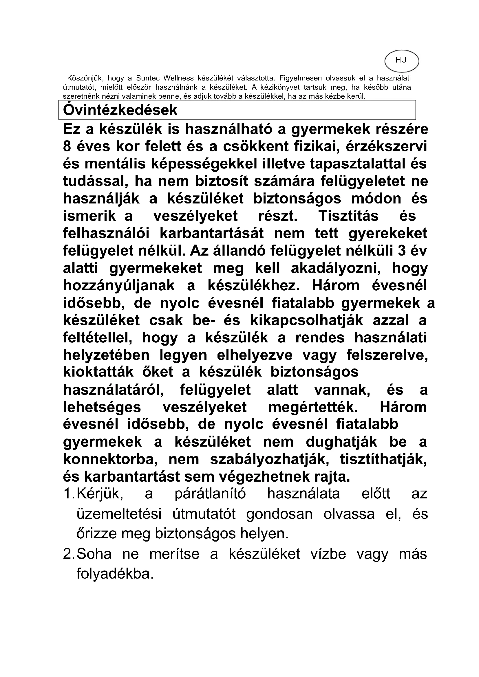 DryFix SUNTEC WELLNESS GMBH / HOLZSTRASSE 2 / 40 221 DÜSSELDORF / DEUTSCHLANDHU Köszönjük, hogy a Suntec Wellness készülékét választotta. Figyelmesen olvassuk el a használati útmutatót, mielőtt először használnánk a készüléket. A kézikönyvet tartsuk meg, ha később utána szeretnénk nézni valaminek benne, és adjuk tovább a készülékkel, ha az más kézbe kerül. Óvintézkedések Ez a készülék is használható a gyermekek részére 8 éves kor felett és a csökkent fizikai, érzékszervi és mentális képességekkel illetve tapasztalattal és tudással, ha nem biztosít számára felügyeletet ne használják a készüléket biztonságos módon és ismerik a veszélyeket részt. Tisztítás és felhasználói karbantartását nem tett gyerekeket felügyelet nélkül. Az állandó felügyelet nélküli 3 év alatti gyermekeket meg kell akadályozni, hogy hozzányúljanak a készülékhez. Három évesnél idősebb, de nyolc évesnél fiatalabb gyermekek a készüléket csak be- és kikapcsolhatják azzal a feltétellel, hogy a készülék a rendes használati helyzetében legyen elhelyezve vagy felszerelve, kioktatták őket a készülék biztonságos használatáról, felügyelet alatt vannak, és a lehetséges veszélyeket megértették. Három évesnél idősebb, de nyolc évesnél fiatalabb gyermekek a készüléket nem dughatják be a konnektorba, nem szabályozhatják, tisztíthatják, és karbantartást sem végezhetnek rajta.