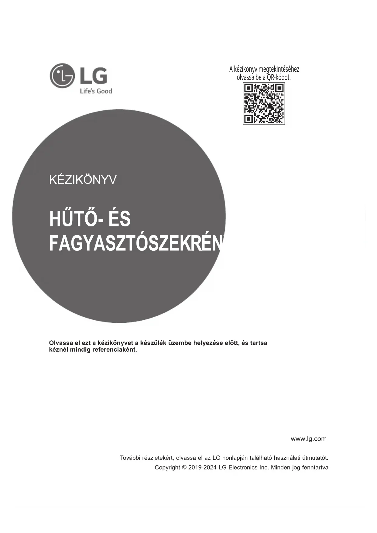 Olvassa el ezt a kézikönyvet a készülék üzembe helyezése előtt, és tartsa kéznél mindig referenciaként. További részletekért, olvassa el az LG honlapján található használati útmutatót. Copyright © 2019-2024 LG Electronics Inc. Minden jog fenntartva A kézikönyv megtekintéséhez olvassa be a QR-kódot.TARTALOMJEGYZÉK A jelen kézikönyvben szereplő képanyag, illetve tartalom eltérhet az Ön által vásárolt modelltől. A kézikönyvet a gyártó bármikor átdolgozhatja.