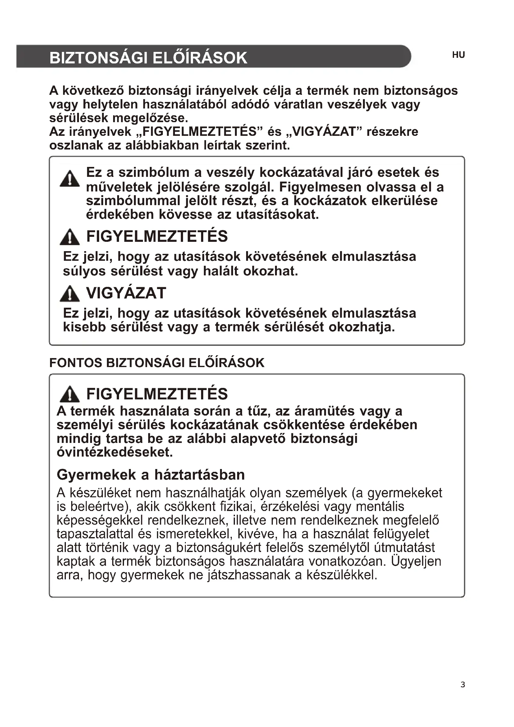 szimbólummal jelölt részt, és a kockázatok elkerülése érdekében kövesse az utasításokat. FIGYELMEZTETÉS Ez jelzi, hogy az utasítások követésének elmulasztása súlyos sérülést vagy halált okozhat. VIGYÁZAT Ez jelzi, hogy az utasítások követésének elmulasztása kisebb sérülést vagy a termék sérülését okozhatja. FIGYELMEZTETÉS