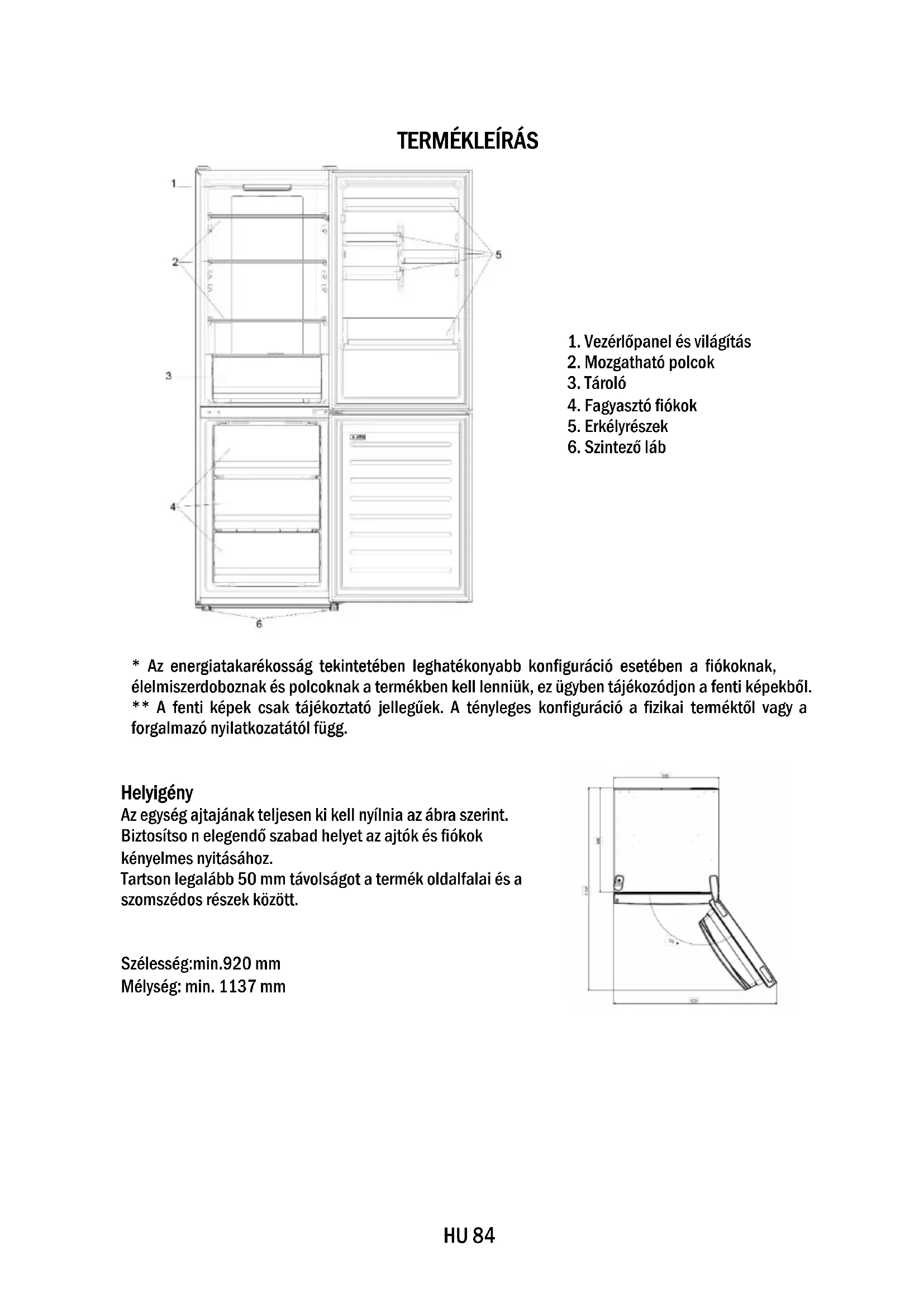 - Az energiatakarékosság tekintetében leghatékonyabb konfiguráció esetében a fiókoknak, élelmiszerdoboznak és polcoknak a termékben kell lenniük, ez ügyben tájékozódjon a fenti képekből. ** A fenti képek csak tájékoztató jellegűek. A tényleges konfiguráció a fizikai terméktől vagy a forgalmazó nyilatkozatától függ. Helyigény Az egység ajtajának teljesen ki kell nyílnia az ábra szerint. Biztosítso n elegendő szabad helyet az ajtók és fiókok kényelmes nyitásához. Tartson legalább 50 mm távolságot a termék oldalfalai és a szomszédos részek között. Szélesség:min.920 mm Mélység: min. 1137 mmHU 85 HASZNÁLAT ➀ BE/KI gomb, amely a készülék be- és kikapcsolására szolgál. ➁ SET gomb, amely a hűtőszekrény hőmérsékletének vagy speciális funkciók kiválasztására szolgál. ➂ Super Cool ikon,amely megerositi a funkciò bekapcsolt àllapotàt. ➃ Hőmérsékleti szintek, amelyek visszajelzéssel szolgálnak a kiválasztott hőmérsékletről. Használat