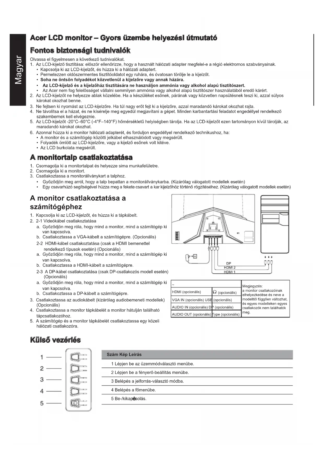 HDMI (csak a HDMI bemenettel rendelkező típusnál) (Opcionális) Hangszórók 2 W × 2 (Csak az audiobemenettel rendelkező típusok esetén) (Opcionális) Maximális képernyőméret Vízszintesen: 698 mm Függőlegesen: 393 mm Áramforrás BEMENET: 100 – 240 V, 50/60 Hz Környezetre vonatkozó követelmények: Működési hőmérséklet: 0–40 °C Tárolás hőmérséklet: -20–60 °C Működési páratartalom: 20–80% Méretek 713 (Sz) x 512,5 (Ma) x 198,6 (Mé) mm Tömeg (nettó) 5 kg (nettó) Mechanikai jellemzők Dőlés: -5° és +20° között Elfordulás: Nem Magasságbeállítás: Nem Elfordítható: Nem Levehető talp: Nem Külső kezelőszervek Kapcsoló/gombok Bekapcsológomb 1.gyorsgomb 2.gyorsgomb 3.gyorsgomb 4.gyorsgomb Funkciók Fényerő Kontraszt Kék fény Sötét élénkítése ACM HDR10 Szuper élesség Gamma Színhőmérséklet Módok Színteret Használja Szürkeárnyalatos mód 6 tengelyes színárnyalat 6 tengelyes telítettség Hangerő Némítás Túlhajtás FreeSync Premium VRB Ultra alacsony késés Frissítési frekvencia száma Célpont Nyelv OSD időkorlátja Átlátszóság OSD zár Bemenet Automatikus forrás DP formátum Széles mód Gyorsgomb hozzárendelése DDC/CI HDMI Feketeszint Gyorsindítás mód Tájékoztatás Minden beállítás visszaállítása A műszaki adatok típusonként és/vagy régiónként eltérőek lehetnek. Acer termékéhez az Acer hivatalos támogatási webhelyén találhat kézikönyveket és egyéb dokumentumokat.Ελληνικά Οδηγός γρήγορης εγκατάστασης οθόνης LCD Acer (ΟΓΕ) Σημαντικές οδηγίες ασφαλείας ∆ιαβάστε προσεκτικά τις ακόλουθες οδηγίες. 1. Για να καθαρίσετε την οθόνη LCD: Βεβαιωθείτε αρχικά ότι το τροφοδοτικό που χρησιμοποιείτε αντιστοιχεί στα ηλεκτρολογικά πρότυπα της περιοχής σας.