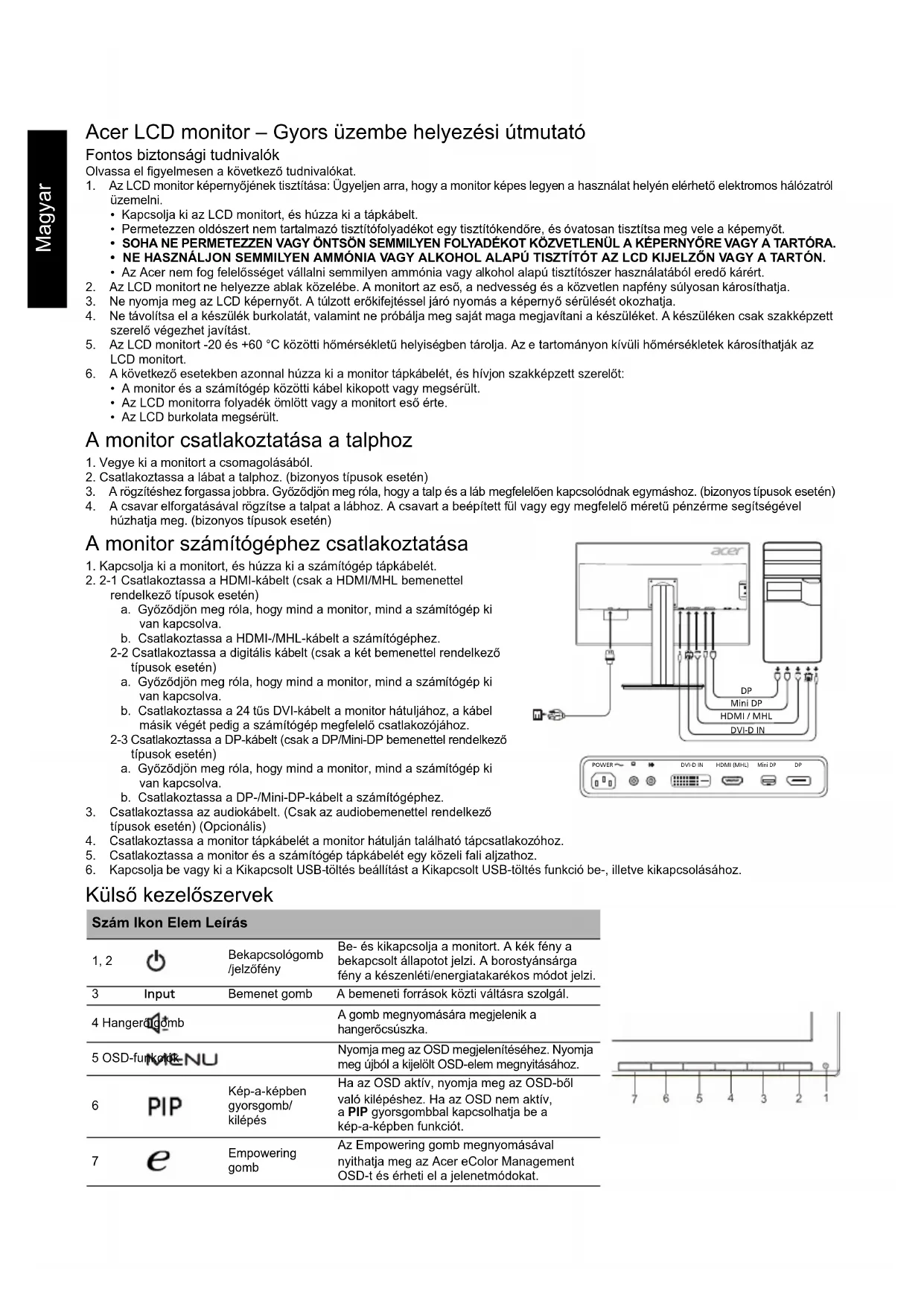 lés: -5° és +25° között (Csak a készülék legmagasabb pontján mérhető 25 fokos dőlésszög) Elfordulás: -60° és +60° között Magasságbeállítás: 0–150 mm Levehető talp: Igen (Csavaros rögzítésű levehető talp) Külső kezelőszervek Kapcsoló/gombok Bekapcsológomb Bemenet Hangerő Menü/Enter PIP/Kilépés E (Empowering) gomb Funkciók Kontraszt Fényerő Fókusz (csak az analóg bemenetű típuson) Órajel (csak az analóg bemenetű típuson) Vízszintes pozíció (csak az analóg bemenetű típuson) Függőleges pozíció (csak az analóg bemenetű típuson) Szuper élesség 6 tengelyes telítettség 6 tengelyes színárnyalat Gamma Színhőmérséklet sRGB PIP/PBP Acer eColor Management Kék fény DP-formátum USB-töltés kikapcsolt állapotban Nyelv OSD időkorlátja Automatikus konfiguráció (csak az analóg bemenetű típuson) Széles mód (teljes/arány) ACM be/ki Bemeneti jel kiválasztása DDC/CI be/ki Kijelzőinformációk Nullázás Kilépés A műszaki adatok értesítés nélkül változhatnak.Ελληνικά Οδηγός γρήγορης εγκατάστασης οθόνης LCD Acer (ΟΓΕ) Σημαντικές οδηγίες ασφαλείας Διαβάστε προσεκτικά τις ακόλουθες οδηγίες. 1. Για να καθαρίσετε την οθόνη LCD: Βεβαιωθείτε ότι η οθόνη σας είναι ηλεκτρικά χαρακτηρισμένη για λειτουργία με το εναλλασσόμενο ρεύμα που είναι διαθέσιμο στην περιοχή σας.