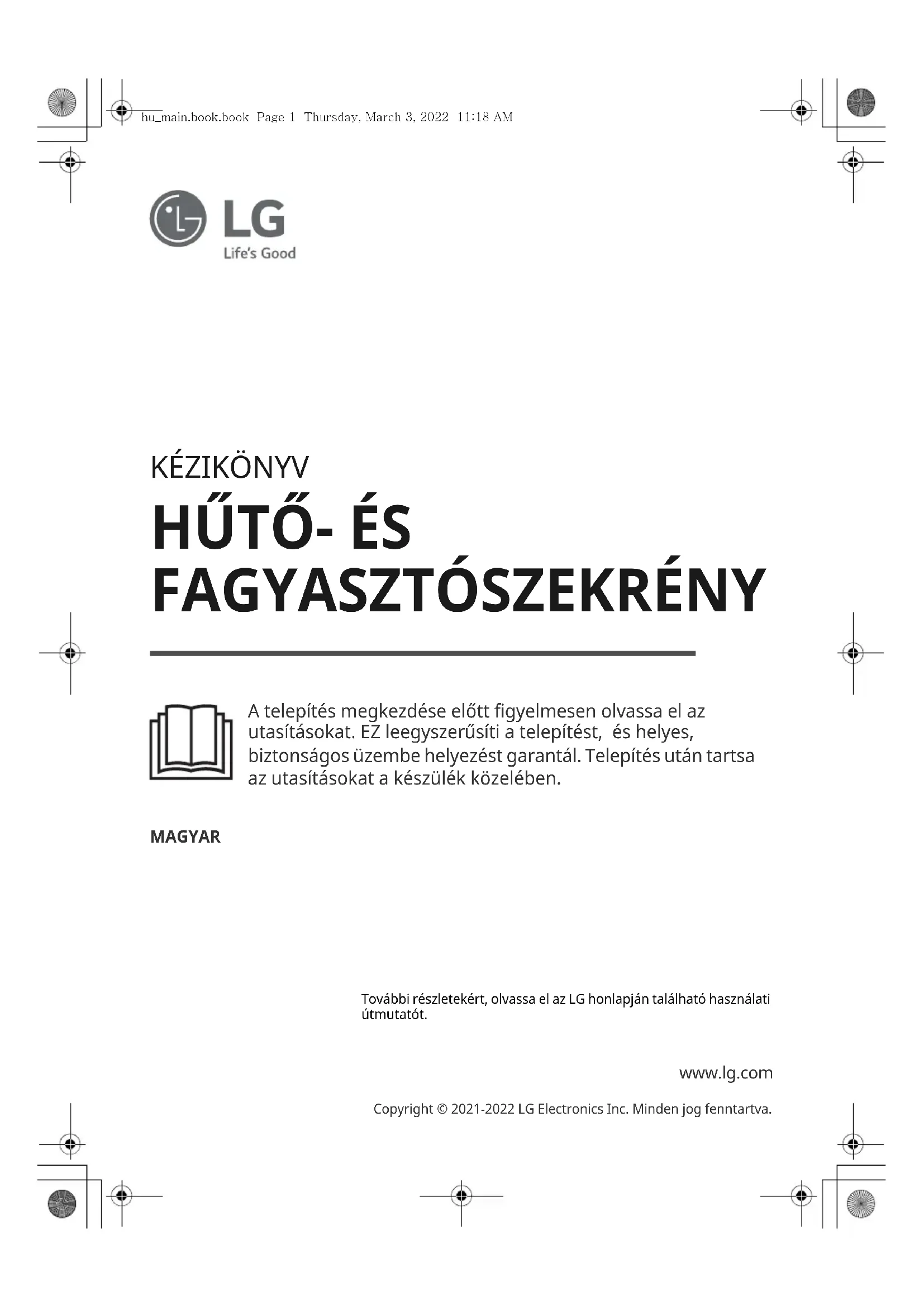 A telepítés megkezdése előtt figyelmesen olvassa el az utasításokat. EZ leegyszerűsíti a telepítést, és helyes, biztonságos üzembe helyezést garantál. Telepítés után tartsa az utasításokat a készülék közelében. MAGYAR www.lg.com Copyright © 2021-2022 LG Electronics Inc. Minden jog fenntartva. További részletekért, olvassa el az LG honlapján található használati útmutatót. hu_main.book.book Page 1 Thursday, March 3, 2022 11:18 AMTARTALOMJEGYZÉK A jelen kézikönyvben szereplő képanyag, illetve tartalom eltérhet az Ön által vásárolt modelltől. A kézikönyvet a gyártó bármikor átdolgozhatja.