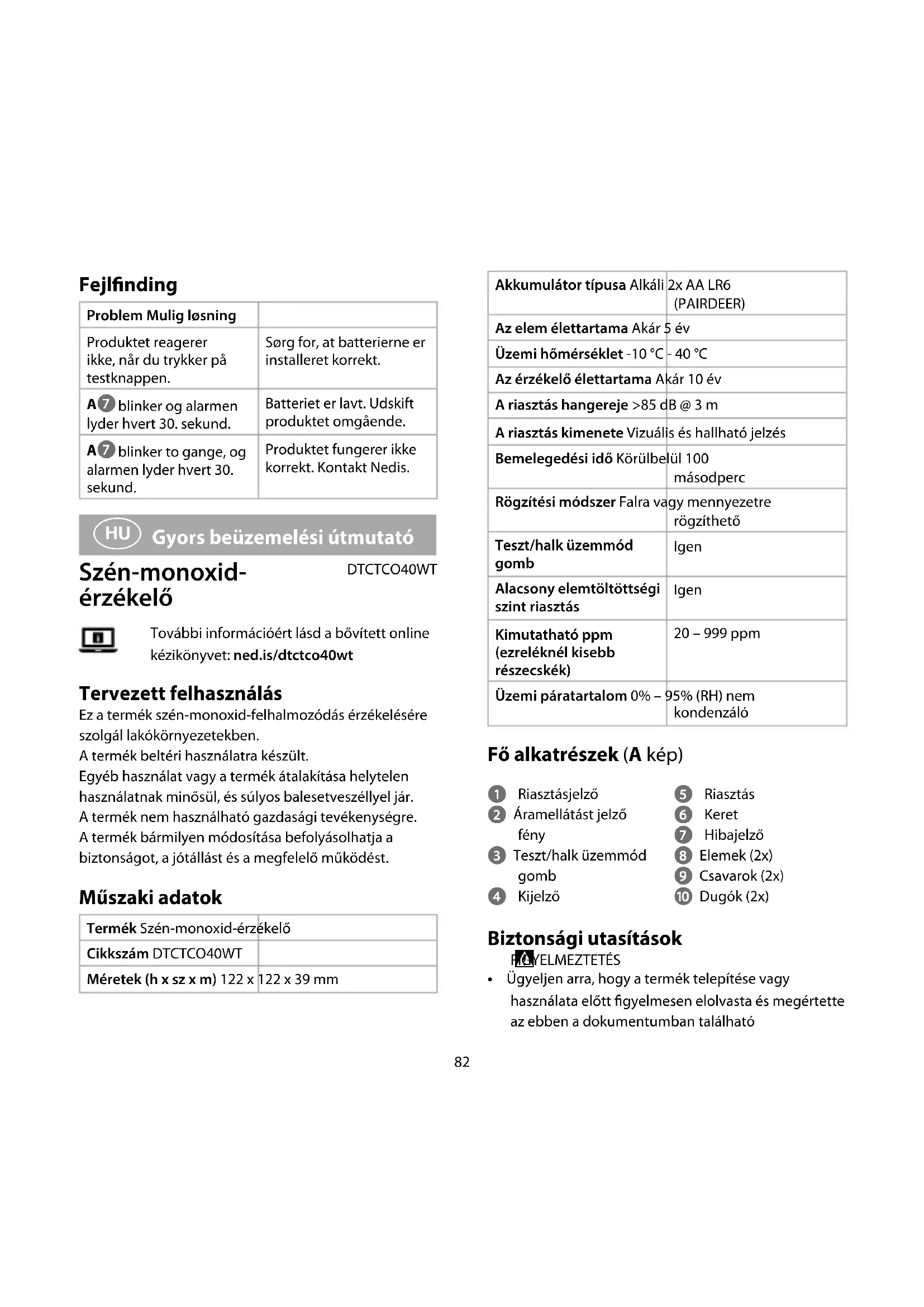 Gyors beüzemelési útmutató Szén-monoxid- érzékelő DTCTCO40WTTovábbi információért lásd a bővített online kézikönyvet: ned.is/dtctco40wt Tervezett felhasználás Ez a termék szén-monoxid-felhalmozódás érzékelésére szolgál lakókörnyezetekben.A termék beltéri használatra készült.Egyéb használat vagy a termék átalakítása helytelen használatnak minősül, és súlyos balesetveszéllyel jár.A termék nem használható gazdasági tevékenységre.A termék bármilyen módosítása befolyásolhatja a biztonságot, a jótállást és a megfelelő működést. Műszaki adatok Termék Szén-monoxid-érzékelőCikkszám DTCTCO40WTMéretek (h x sz x m) 122 x 122 x 39 mmAkkumulátor típusa Alkáli 2x AA LR6 (PAIRDEER)Az elem élettartama Akár 5 évÜzemi hőmérséklet -10 °C - 40 °CAz érzékelő élettartama Akár 10 évA riasztás hangereje >85 dB @ 3 mA riasztás kimenete Vizuális és hallható jelzésBemelegedési idő Körülbelül 100 másodpercRögzítési módszer Falra vagy mennyezetre rögzíthetőTeszt/halk üzemmód gomb Igen Alacsony elemtöltöttségi szint riasztás Igen Kimutatható ppm (ezreléknél kisebb részecskék)20 – 999 ppmÜzemi páratartalom 0% – 95% (RH) nem kondenzáló Fő alkatrészek (A kép) 1 Riasztásjelző 2 Áramellátást jelző fény 3 Teszt/halk üzemmód gomb 4 Kijelző 5 Riasztás 6 Keret 7 Hibajelző 8 Elemek (2x) 9 Csavarok (2x) q Dugók (2x) Biztonsági utasítások