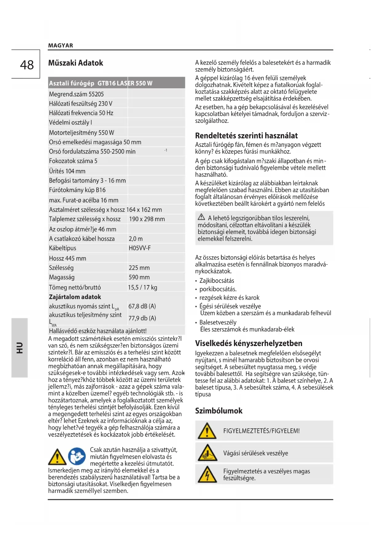 MAGYAR Műszaki Adatok Asztali fúrógép GTB16 LASER 550 W Megrend.szám 55205 Hálózati feszültség 230 V Hálózati frekvencia 50 Hz Védelmi osztály I Motorteljesítmény 550 W Orsó emelkedési magassága 50 mm Orsó fordulatszáma 550-2500 min