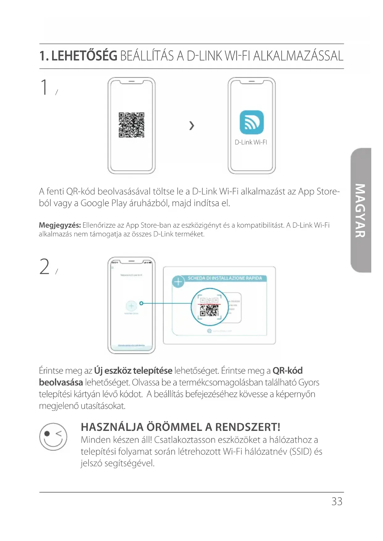 Miért nem férek hozzá a webalapú kongurációs segédprogramhoz? Győződjön meg róla, hogy a http://dlinkrouter.local./ címet helyesen írta be a böngészőbe. Ezen a ponton nem valódi weboldalhoz kapcsolódik, és még az internetkapcsolatnak sem kell működnie. A beépített segédprogram magában az eszközben, egy ROM-chipen található. Ahhoz, hogy csatlakozhasson a webalapú segédprogramhoz, a számítógépnek a router hálózatához csatlakozva ugyanazon az IP-alhálózaton kell lennie. Miért nincs internet-hozzáférésem? A router újraindításával ellenőrizze, hogy a router működik-e. Ha továbbra sem tud kapcsolódni az internethez, forduljon az internetszolgáltatójához. Mit tegyek, ha elfelejtettem az eszköz jelszavát / a vezeték nélküli hálózat jelszavát? Ha elfelejti jelszavát, vissza kell állítania a routert. Ez a folyamat visszaállítja az összes beállítást gyári beállításra. Hogyan állíthatom vissza a routert alapértelmezett gyári beállításokra? Keresse meg és nyomja meg az eszköz hátlapján található resetgombot. A routert hagyja bekapcsolva, és egy kiegyenesített iratkapoccsal nyomja be a gombot 10 másodpercre. Engedje el a gombot és a router elvégzi az újraindítási folyamatot. Műszaki támogatás, termékdokumentáció és egyéb információk a weboldalunkon találhatók. https://eu.dlink.com/support37 NORSK Skann QR-koden ovenfor for å laste ned D-Link Wi-Fi-appen fra App Store eller Google Play og åpne den. Merk: Du finner enhetskrav og -kompatibilitet i appbutikken. Ikke alle D-Link-produkter støttes av D-Link Wi-Fi-appen. 1 / Trykk på Installer ny enhet. Trykk på Skann QR-koden. Skann koden på hurtiginstallasjonskortet i produktets emballasje. Følg instruksjonene på skjermen for å fullføre konfigureringen. 2 /