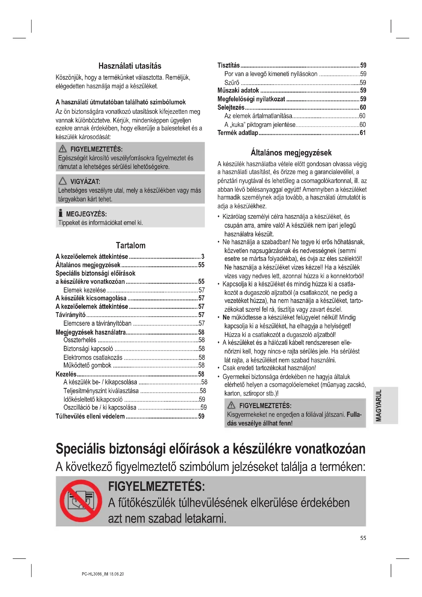 - Gyermekei biztonsága érdekében ne hagyja általuk elérhető helyen a csomagolóelemeket (műanyag zacskó, karton, sztiropor stb.)! FIGYELMEZTETÉS: Kisgyermekeket ne engedjen a fóliával játszani. Fulla- dás veszélye állhat fenn! Speciális biztonsági előírások a készülékre vonatkozóan A következő gyelmeztető szimbólum jelzéseket találja a terméken: FIGYELMEZTETÉS: A fűtőkészülék túlhevülésének elkerülése érdekében azt nem szabad letakarni.PC-HL3086_IM 18.06.20