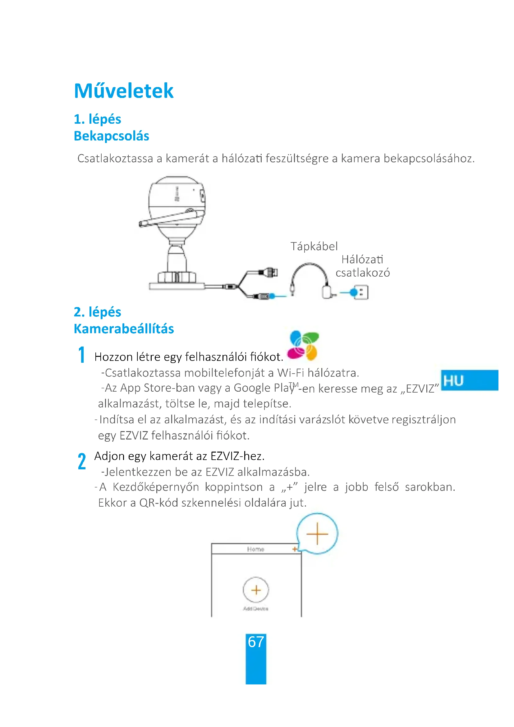 Adjon egy kamerát az EZVIZ-hez. -Jelentkezzen be az EZVIZ alkalmazásba. -A Kezdőképernyőn koppintson a „+” jelre a jobb felső sarokban. Ekkor a QR-kód szkennelési oldalára jut.68 -Szkennelje be a kamera testén látható QR-kódot. -A Wi-Fi kongurálás befejezéséhez kövesse az EZVIZ alkalmazás varázslójának utasításait. Vezetékes összeköetést is választhat.