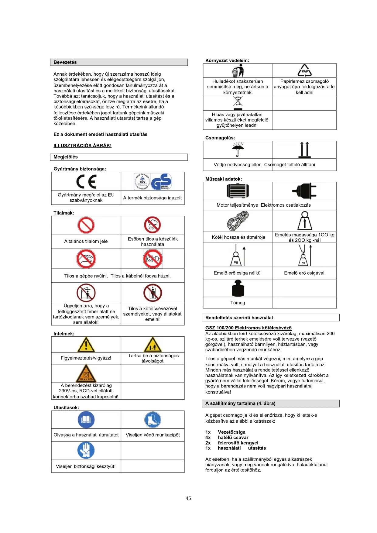Megsemmisítés A berendezés megsemmisítése, a gépen elhelyezett piktogrammokból olvasható le. Az egyes jelzések értelmét a „Jelzések“ fejezetben találja meg. A csomagolás megsemmisítése A csomagolás védi a gépet a szállítás alatti megrongálódás ellen. A csomagolás anyaga, a környezetvédelmi szempontok és megsemmisítési lehetőségek szerint van kiválasztva, tehát reciklálható. A csomagoló anyag körforgalomba való visszatérése, nyersanyagot spórol meg és csökkenti a hulladék mennyiségét. A csomagoló anyag egyes részei (pl. fólia, styropor®), veszélyesek lehetnek gyerekek részére. Fulladás veszélye fenyeget! Tehát a csomagoló anyag illetékes darabjait raktározza olyan helyen, ahová nem juthatnak gyerekek, s minél előbb semmisítse meg. Követelmények a gép kezelőjére A gép kezelője, használat előtt, figyelmesen olvassa el a használati utasítást. Szakképzettség A gép használatához elegendő szakember felvilágosítása, resp. a használati utasítással való megismerkedés. Speciális képzés nem szükséges Minimális korhatár A géppel kizárólag 16 éven felüli személyek dolgozhatnak. Kivételt képez a fiatalkorúak foglalkoztatása szakképzés alatt, az oktató felügyelete mellet, szakképzettség elsajátítása érdekében. Képzés A gép használatához elegendő szakember felvilágosítása, resp. a használati utasítással való megismerkedés. Speciális képzés nem szükséges. Műszaki adatok Villamos csatlakozás 230 Volt Motor teljesítménye 450 W Max. emelő erő mozgócsigával 200 kg Max. emelő erő mozgócsiga nélkül 100 kg Max. emelés 100 kg 11 m Max. emelés 200 kg 5,5 m Kötél átmérője 12 m Kötélhossz 3 mm Védelmi tipus IP 54 B Súly 12,0 kg Szallitas es tarolas Száraz helyen tartandó úgy, hogy gyerekek és hívatlan személyek ne érjék el. Amennyiben a készüléket hosszabb ideig nem fogja használni, alaposan tisztítsa ki. Szerelés és előkészület Felállítás