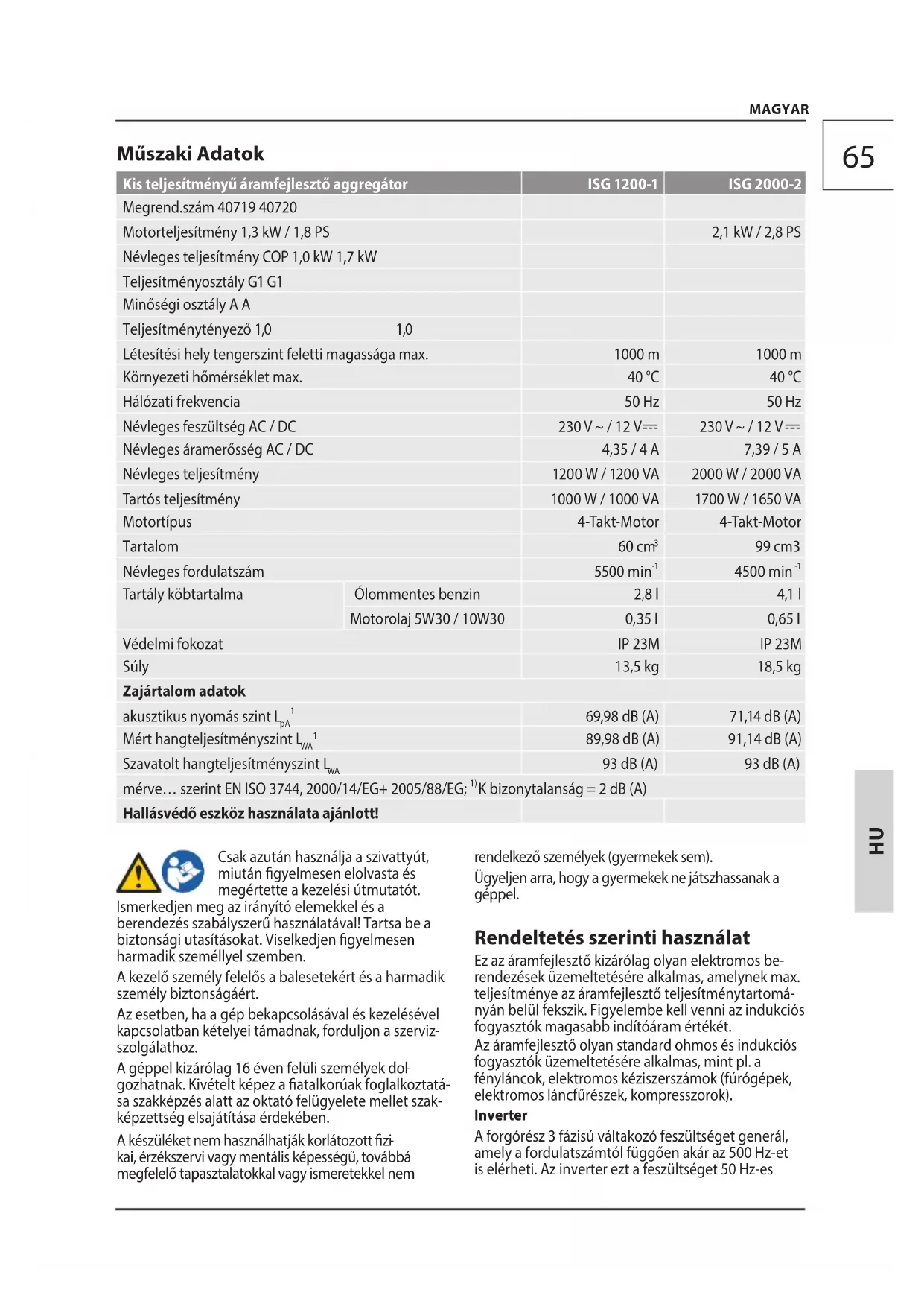 kai, érzékszervi vagy mentális képességű, továbbá megfelelő tapasztalatokkal vagy ismeretekkel nem rendelkező személyek (gyermekek sem). Ügyeljen arra, hogy a gyermekek ne játszhassanak a géppel. Rendeltetés szerinti használat Ez az áramfejlesztő kizárólag olyan elektromos be- rendezések üzemeltetésére alkalmas, amelynek max. teljesítménye az áramfejlesztő teljesítménytartomá- nyán belül fekszik. Figyelembe kell venni az indukciós fogyasztók magasabb indítóáram értékét. Az áramfejlesztő olyan standard ohmos és indukciós fogyasztók üzemeltetésére alkalmas, mint pl. a fényláncok, elektromos kéziszerszámok (fúrógépek, elektromos láncfűrészek, kompresszorok). Inverter A forgórész 3 fázisú váltakozó feszültséget generál, amely a fordulatszámtól függően akár az 500 Hz-et is elérheti. Az inverter ezt a feszültséget 50 Hz-es66 MAGYAR