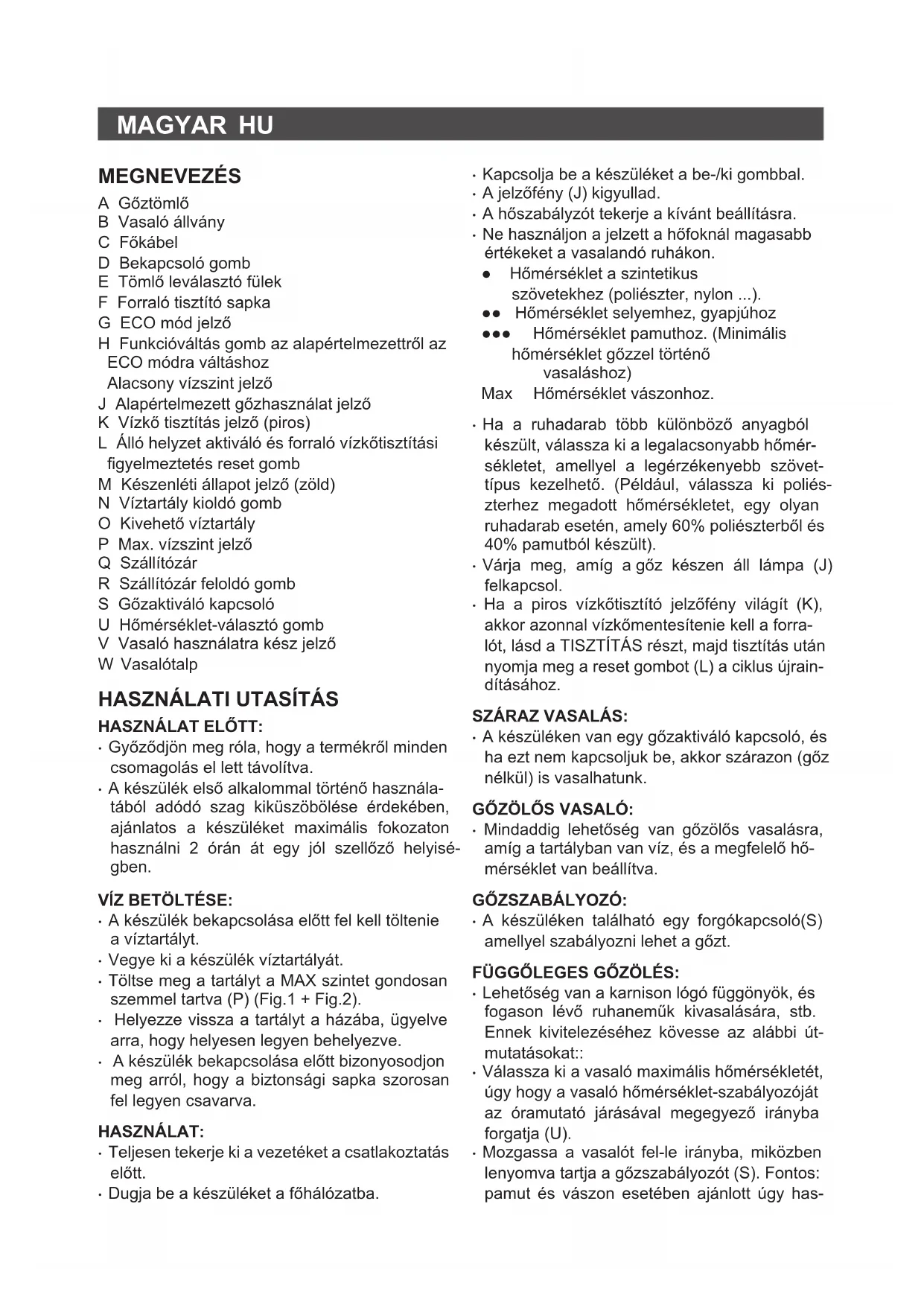 - Ak je zariadenie poškodené alebo došlo k iným problémom, odneste ho do oprávneného servi- sného strediska. Nepokúšajte sa sami rozobe- rať alebo opravovať toto zariadenie, pretože to môže byť nebezpečné.MAGYAR HU MEGNEVEZÉS A Gőztömlő B Vasaló állvány C Főkábel D Bekapcsoló gomb E Tömlő leválasztó fülek F Forraló tisztító sapka G ECO mód jelző H Funkcióváltás gomb az alapértelmezettről az ECO módra váltáshoz Alacsony vízszint jelző J Alapértelmezett gőzhasználat jelző K Vízkő tisztítás jelző (piros) L Álló helyzet aktiváló és forraló vízkőtisztítási gyelmeztetés reset gomb M Készenléti állapot jelző (zöld) N Víztartály kioldó gomb O Kivehető víztartály P Max. vízszint jelző Q Szállítózár R Szállítózár feloldó gomb S Gőzaktiváló kapcsoló U Hőmérséklet-választó gomb V Vasaló használatra kész jelző W Vasalótalp
