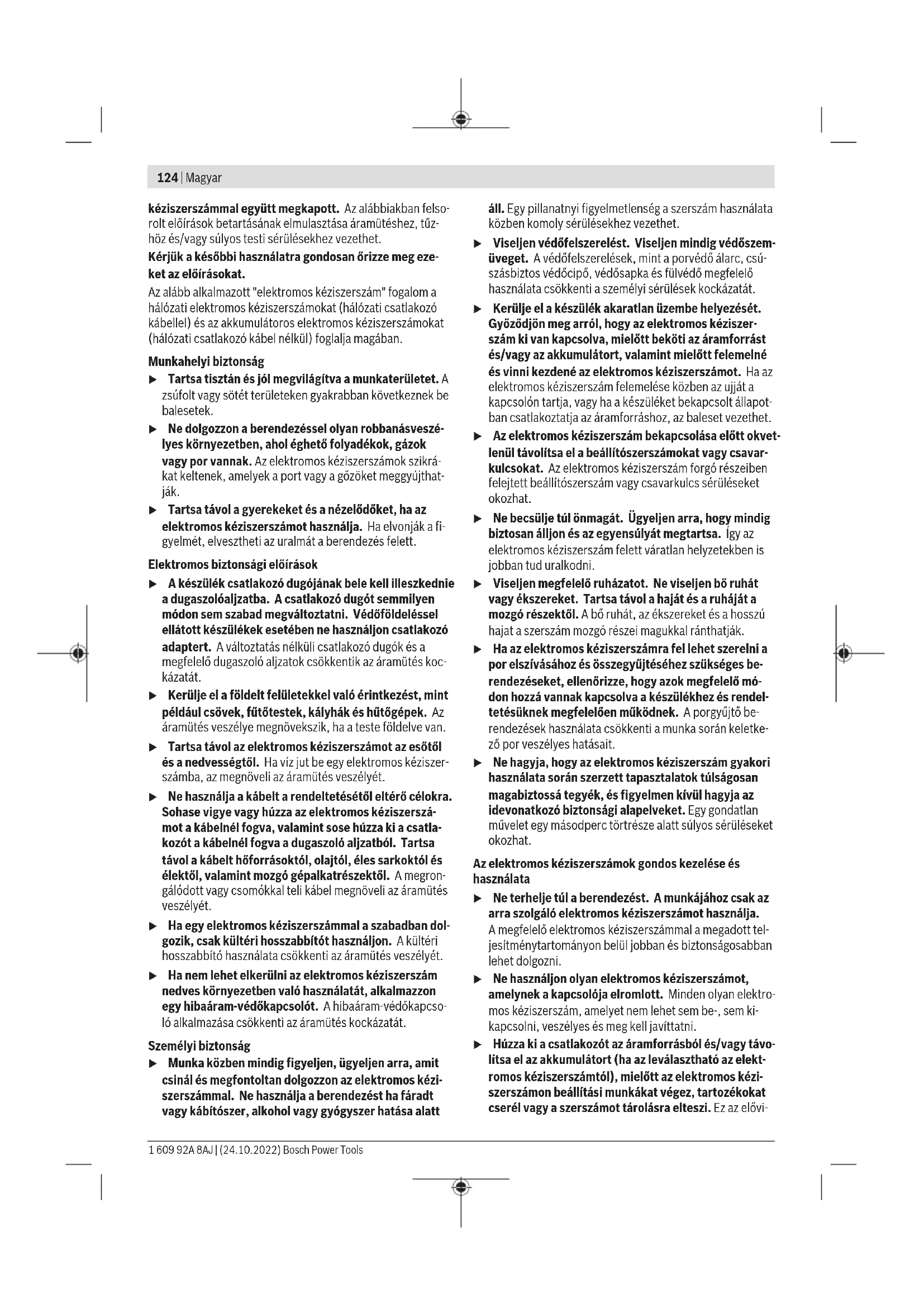 Low Energy Module GCY 30-4 je vybavené rádiovým rozhraním. Rešpektujte lokálne obmedzenia prevádzky, napríklad vlietadlách alebo nemocniciach. u Na skrutku/maticu prikladajte ručné elektrické nára- die iba vo vypnutom stave. Otáčajúce sa pracovné ná- stroje by sa mohli zošmyknúť. Po dlhšej práci snízkymi otáčkami by ste mali elektrické náradie kvôli ochladeniu nechať cca 3minúty bežať napráz- dno smaximálnymi otáčkami. Pri vŕtaní do kovu používajte len bezchybné, naostrené HSS vrtáky (HSS = vysokovýkonná rýchlorezná oceľ). Zodpove- dajúcu kvalitu garantuje Bosch sortiment príslušenstva. Pred skrutkovaním väčších adlhších skrutiek do tvrdých materiálov by ste mali vrtákom spriemerom rovným jadru závitu skrutky predvŕtať otvor do 2/3 dĺžky skrutky. Údržba aservis Údržba ačistenie u Pred všetkými prácami na elektrickom náradí (naprí- klad údržba, výmena nástroja apodobne), ako aj pri jeho preprave auskladnení vyberte akumulátor zelektrického náradia. Vprípade neúmyselného aktivo- vania vypínača hrozí nebezpečenstvo poranenia. u Elektrické náradie ajeho vetracie štrbiny udržiavajte vždy včistote, aby ste mohli pracovať dobre abezpeč- ne. Zákaznícka služba aporadenstvo ohľadom použitia Servisné stredisko Vám odpovie na otázky týkajúce sa opravy aúdržby Vášho produktu ako aj náhradných dielov. Rozkladové výkresy ainformácie onáhradných dieloch náj- dete tiež na: www.bosch-pt.com Vprípade otázok týkajúcich sa našich výrobkov apríslušen- stva Vám ochotne pomôže poradenský tím Bosch. Vprípade akýchkoľvek otázok aobjednávok náhradných dielov uvádzajte bezpodmienečne 10‑miestne vecné číslo uvedené na typovom štítku výrobku. Slovakia Na www.bosch-pt.sk si môžete objednať opravu vášho stroja alebo náhradné diely online. Tel.: +421 2 48 703 800 Fax: +421 2 48 703 801 E-Mail: servis.naradia@sk.bosch.com www.bosch-pt.sk Ďalšie adresy servisov nájdete na: www.bosch-pt.com/serviceaddresses Transport Odporúčané lítiovo-iónové akumulátory podliehajú požiadavkám na transport nebezpečného nákladu. Tieto aku- mulátory smie používateľ náradia prepravovať po cestách bez ďalších opatrení. Pri zasielaní tretími osobami (napr.: leteckou dopravou alebo prostredníctvom špedície) treba rešpektovať osobitné požiadavky na obaly aoznačenie. Vtakomto prípade treba pri príprave zásielky bezpodmienečne konzultovať sodborní- kom na prepravu nebezpečného tovaru. Akumulátory zasielajte iba vtedy, ak nemajú poškodený obal. Otvorené kontakty prelepte aakumulátor zabaľte tak, aby sa vobale nemohol posúvať. Rešpektujte aj prípadné doplňujú- ce národné predpisy. Likvidácia Ručné elektrické náradie, príslušenstvo aobal treba dať na recykláciu zodpovedajúcu ochrane životného prostredia. Neodhadzujte ručné elektrické náradie ani aku- mulátory/batérie do komunálneho odpadu! Len pre krajinyEÚ: Podľa európskej smernice 2012/19/EÚ oodpade zelektrických aelektronických zariadení apodľa jej trans- pozície vnárodnom práve sa musí už nepoužiteľné elektrické náradie a, podľa európskej smernice 2006/66/ES, po- škodené alebo vybité akumulátory/batérie zbierať separova- ne aodovzdať na recykláciu vsúlade sochranou životného prostredia. Pri nesprávnej likvidácii môžu mať staré elektrické aelektro- nické zariadenia kvôli možnej prítomnosti nebezpečných látok škodlivý vplyv na životné prostredie aľudské zdravie. Akumulátory/batérie: Li-Ion: Dodržujte pokyny uvedené včasti Transport (pozri „Trans- port“, Stránka123). Magyar Biztonsági tájékoztató Általános biztonsági előírások az elektromos kéziszerszámok számára FIGYELMEZ- TETÉS Olvassa el valamennyi biztonsági tájékoztatót, előírást, illusztrációt és adatot, amelyet az elektromos Bosch Power Tools 1 609 92A 8AJ | (24.10.2022)124 | Magyar kéziszerszámmal együtt megkapott. Az alábbiakban felso- rolt előírások betartásának elmulasztása áramütéshez, tűz- höz és/vagy súlyos testi sérülésekhez vezethet. Kérjük a későbbi használatra gondosan őrizze meg eze- ket az előírásokat. Az alább alkalmazott "elektromos kéziszerszám" fogalom a hálózati elektromos kéziszerszámokat (hálózati csatlakozó kábellel) és az akkumulátoros elektromos kéziszerszámokat (hálózati csatlakozó kábel nélkül) foglalja magában. Munkahelyi biztonság u Tartsa tisztán és jól megvilágítva a munkaterületet. A zsúfolt vagy sötét területeken gyakrabban következnek be balesetek. u Ne dolgozzon a berendezéssel olyan robbanásveszé- lyes környezetben, ahol éghető folyadékok, gázok vagy por vannak. Az elektromos kéziszerszámok szikrá- kat keltenek, amelyek a port vagy a gőzöket meggyújthat- ják. u Tartsa távol a gyerekeket és a nézelődőket, ha az elektromos kéziszerszámot használja. Haelvonják a fi- gyelmét, elvesztheti az uralmát a berendezés felett. Elektromos biztonsági előírások u A készülék csatlakozó dugójának bele kell illeszkednie a dugaszolóaljzatba. A csatlakozó dugót semmilyen módon sem szabad megváltoztatni. Védőföldeléssel ellátott készülékek esetében ne használjon csatlakozó adaptert. Aváltoztatás nélküli csatlakozó dugók és a megfelelő dugaszoló aljzatok csökkentik az áramütés koc- kázatát. u Kerülje el a földelt felületekkel való érintkezést, mint például csövek, fűtőtestek, kályhák és hűtőgépek. Az áramütés veszélye megnövekszik, ha a teste földelve van. u Tartsa távol az elektromos kéziszerszámot az esőtől és a nedvességtől. Ha víz jut be egy elektromos kéziszer- számba, az megnöveli az áramütés veszélyét. u Ne használja a kábelt a rendeltetésétől eltérő célokra. Sohase vigye vagy húzza az elektromos kéziszerszá- mot a kábeln