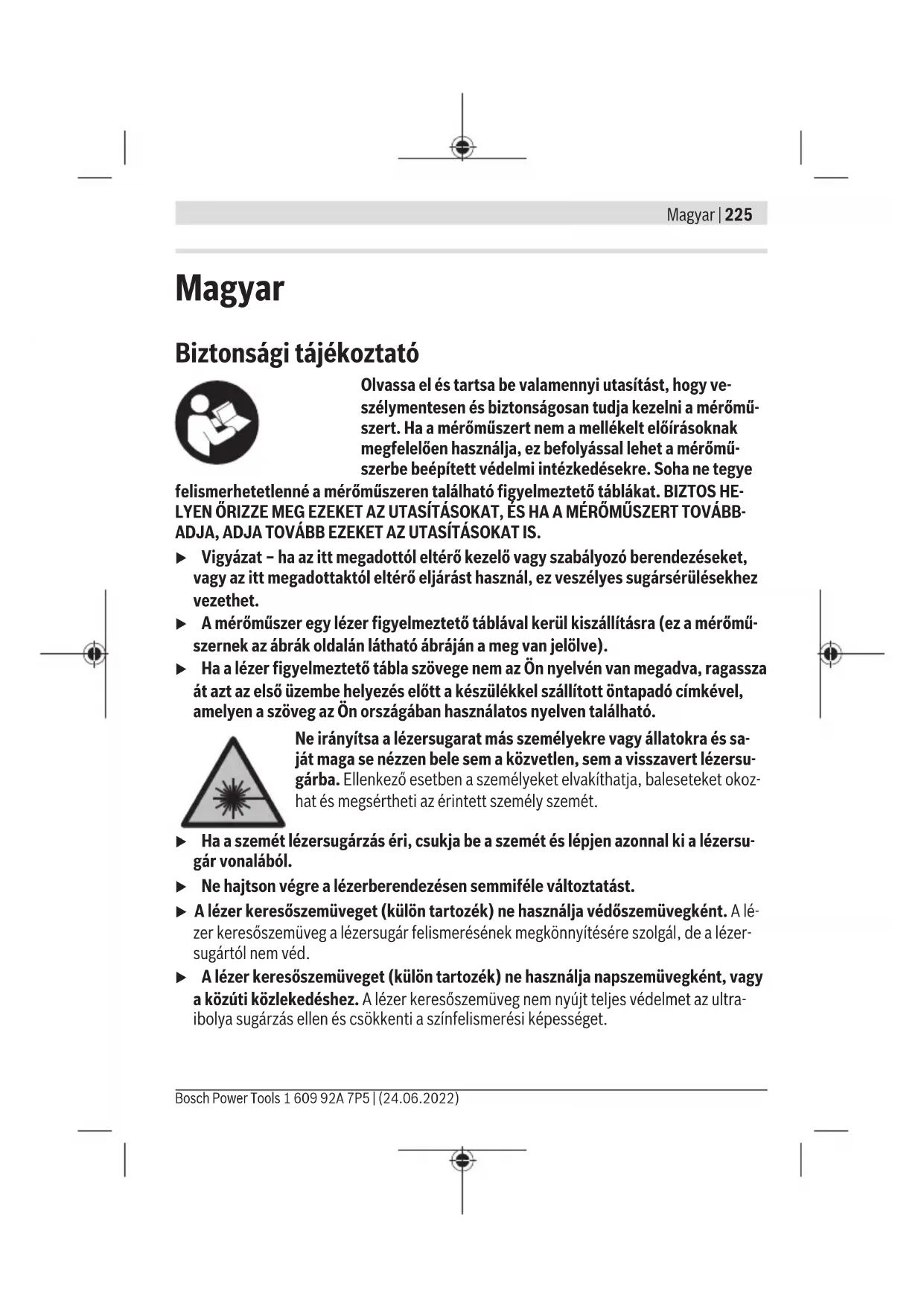 2609120713 (EU) 2609120718 (UK) 1600A013A0 (ARG) 1 609 92A 7P5 | (24.06.2022) Bosch Power ToolsMagyar | 231 Digitális lézeres távol- ságmérő GLM50-22 GLM50-23G GLM50-25G 1600A013A1 (MEX) 1600A013A2 (BRL) A) A mérőműszer első élétől végzett mérés esetén, erős visszaverő képességű célra (pl. egy fehérre festett fal), gyenge háttérvilágításra és 25°C üzemi hőmérsékletre vonatkozik, ezen felül egy a tá- volságtól függő ±0,05mm/m eltérésre lehet számítani. B) A mérőműszer első élétől végzett mérés esetén, erős visszaverő képességű célra (pl. egy fehérre festett fal), erős háttérvilágításra, 25°C üzemi hőmérsékletre és nagyobb tengerszint feletti ma- gasságokban végzett mérésre vonatkozik. Ezen felül a távolságtól függő ±0,15mm/m eltérésre le- het számítani. C) A tartós mérési funkciónál a max. üzemi hőmérséklet +40 °C. D) Csak egy nem vezetőképes szennyezés lép fel, ámbár időnként a harmatképződés következtében ideiglenesen egy nullától eltérő vezetőképességre is lehet számítani. E) További műszaki adatok az alábbi címen találhatók: https://www.bosch-professional.com/ecodesign A mérőműszerét a típustáblán található(11)gyári számmal lehet egyértelműen azonosítani. Elem behelyezése/kicserélése Az elemeket, illetve akkumulátort mindig egyszerre cserélje ki. Csak egy bizonyos gyártó cég azonos kapacitású elemeit vagy akkumulátorait használja. Ekkor ügyeljen az elemfiók fedél belső oldalán található ábrázolásnak megfelelő he- lyes polaritás betartására. u Vegye ki az elemeket, illetve az akkumulátorokat a mérőműszerből, ha azt hosz- szabb ideig nem használja. Az elemek és akkumulátorok egy hosszabb tárolás során korrodálhatnak, és maguktól kimerülhetnek. Sohase tárolja a mérőműszert az abba behelyezett(13)elemfiók vagy a(19)lítium-ion akkumulátorcsomag (külön tartozék) nélkül, főleg poros vagy ned- ves környezetben ne. Lítium-ion akkumulátorcsomag (külön tartozék) A lítium-ion akkumulátorcsomag (külön tartozék) behelyezése/ kicserélése Tegye be a(19)lítium-ion akkumulátorcsomagot (külön tartozék). Bosch Power Tools 1 609 92A 7P5 | (24.06.2022)232 | Magyar A(19)lítium-ion akkumulátorcsomag (külön tartozék)kivételéhez nyomja be a(20)reteszelést és vegye ki a lítium-ion akkumulátorcsomagot. (lásd ábra A, Oldal5) A lítium-ion akkumulátorcsomag (külön tartozék) feltöltése u A feltöltéshez használjon egy USB-tápegységet, amelynek a műszaki adatai (feszültség és töltőáram) megfelelnek a javasolt tápegység adatainak. Vegye ehhez figyelembe az USB-tápegység Üzemeltetési útmutatóját. Javasolt hálózati tápegység: lásd a műszaki adatokat. u Ügyeljen a helyes hálózati feszültségre! Az áramforrás feszültségének meg kell egyeznie a dugaszolható hálózati tápegység típustábláján található adatokkal. A 230V‑os dugaszolható hálózati tápegységeket 220V hálózati feszültségről is lehet üze- meltetni. A lítium-ion akkumulátorok a nemzetközi szállítási előírásoknak megfelelő csak részben feltöltött állapotban kerülnek kiszállításra. Az akkumulátor teljes teljesít- ményének biztosítására az első alkalmazás előtt töltse fel teljesen az akkumulátort. Tovább információk az online használati utasításban találhatók: www.bosch-pt.com/manuals Üzemeltetés Üzembe helyezés u Ne hagyja a bekapcsolt mérőműszert felügyelet nélkül és a használat befejezése után kapcsolja ki azt. A lézersugár más személyeket elvakíthat. u Óvja meg a mérőműszert a nedvességtől és a közvetlen napsugárzás behatásától. u Ne tegye ki a mérőműszert szélsőséges hőmérsékleteknek vagy hőmérsékletinga- dozásoknak. Például ne hagyja a mérőműszert hosszabb ideig az autóban. Nagyobb hőmérsékletingadozások esetén várja meg, amíg a mérőműszer hőmérsékletet ki- egyenlítődik, mielőtt azt üzembe helyezné. Szélsőséges hőmérsékletek vagy hőmérsék- letingadozások esetén a mérőműszer pontossága csökkenhet. u Óvja meg a mérőműszert a heves lökésektől és a leeséstől. Ha a mérőműszert erős külső hatás érte, a munka folytatása előtt hajtson ellenőrizze annak pontosságát (lásd „A pontosság ellenőrzése”, Oldal236). 1 609 92A 7P5 | (24.06.2022) Bosch Power ToolsMagyar | 233 Be- és kikapcsolás Nyomja meg a gombot, hogy bekapcsolja a mérőműszert és a lézert. A mérőműszert a lézer nélkül is be lehet kapcsolni, ehhez nyomja meg a gombot. A mérőműszer kikapcsolásához nyomja be és tartsa benyomva a gombot. A memóriában található értékek és a készülék beállításai megmaradnak. A mérési folyamat Az első bekapcsolás után a mérőműszer a Hosszmérés funkcióra kapcsol. A mérőműszer minden egyes további bekapcsolás után a legutoljára használt mérési funkcióra kapcsol. A mérés vonatkoztatási síkját háromféleképpen lehet beállítani. (lásd „A vonatkoztató sík kijelölése”, Oldal233) Tegye fel a mérőműszert a mérés kívánt kezdőpontjára (például egy falra). Ha a mérőműszert a gombbal kapcsolta be, akkor a lézer bekapcsolásához nyomja meg röviden a gombot. A mérés kiváltásához nyomja meg a gombot. A mérési eljárás befejezése után a lézersugár kikapcsolásra kerül. Egy további méréshez ismételje meg ezt az eljárást. A mérési eredményeket vagy végeredményeket hozzá lehet adni, vagy ki lehet vonni. Tovább információk az online használati utasításban találhatók: www.bosch-pt.com/manuals A mérőműszert a mérés tartama alatt (a tartós mérési funkció kivételével) nem sza- bad mozgatni. Ezért a mérőműszert lehetőleg egy szilárd ütköző vagy felfekvő felü- letre helyezze. A(15)vevő lencsét és a lézersugár(16)kilépési pon