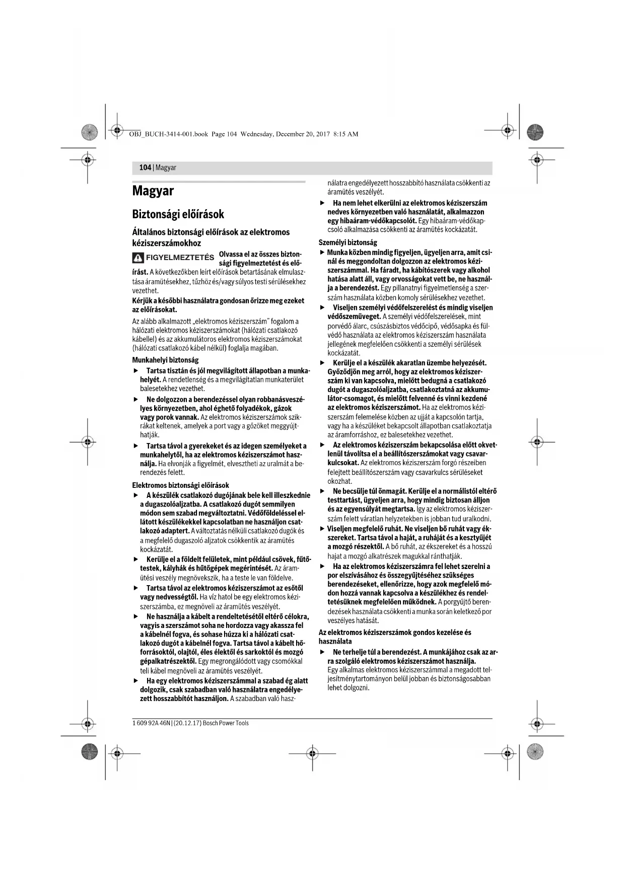 Érintésvédelmi osztály /II Az adatok [U] = 230 V névleges feszültségre vonatkoznak. Ettől eltérő feszültségek esetén és az egyes országok számára készült különleges ki- vitelekben ezek az adatok változhatnak. A bekapcsolási folyamatok rövid időtartamú feszültségcsökkenést okoznak. Hátrányos hálózati viszonyok esetén ez negatív hatással lehet más berendezések működésére. Ha a hálózati impedancia alacso- nyabb, mint 0,36 Ω nem kell hálózati zavarokra számítani. OBJ_BUCH-3414-001.book Page 108 Wednesday, December 20, 2017 8:15 AMMagyar | 109 Bosch Power Tools 1 609 92A 46N | (20.12.17) GGS 8 H Az egyenes rögzítéséhez használja a 11 felvevő karimát, a 8 befogó anyát, a 9 befogó karimát és a 10 zárt védőbúrát. Egy csavarhúzóval emelje ki a 17 biztosító gyűrűt a 3 csiszoló- tengely hornyából és vegye le a 11 felvevő karimát. Szerelje fel megfelelő módon a hozzáillő 11 felvevő karimát. Gyorsbefogó anya (GGS 8 SH) (lásd a „C” ábrát) A csiszoló szerszámok gyors cseréjéhez további szerszámok alkalmazása nélkül az 1 befogó anya helyett a 7 gyorsbefogó anyát is lehet használni. A 7 gyorsbefogó anyát kefékhez nem szabad használni. Csak hibátlan, kifogástalan 7 gyorsbefogó anyát használ- jon. A felcsavaráskor ügyeljen arra, hogy a 7 gyorsbefogó- anyának a felirattal ellátott oldala ne a csiszolótárcsa felé mutasson; a nyílnak a 16 indexjelre kell mutatnia. Egy előírásszerűen rögzített hibátlan gyorsbefogó anyát a re- cézett gyűrűnek az óramutató járásával ellentétes irányba va- ló elforgatásával kézzel ki lehet lazítani. Ha egy gyorsbefogó- anya beékelődött, és nem lehet kicsavarni, erre a célra sohase használjon fogót, hanem csak kizárólag a 15 kör- möskulcsot. Por- és forgácselszívás Az ólomtartalmú festékrétegek, egyes fafajták, ásványok és fémek pora egészségkárosító hatású lehet. A poroknak a kezelő vagy a közelben tartózkodó személyek által törté- nő megérintése vagy belégzése allergikus reakciókhoz és/vagy a légutak megbetegedését vonhatja maga után. Egyes faporok, például tölgy- és bükkfaporok rákkeltő ha- tásúak, főleg ha a faanyag kezeléséhez más anyagok is van- nak bennük (kromát, favédő vegyszerek). A készülékkel azbesztet tartalmazó anyagokat csak szakembereknek szabad megmunkálniuk. – Gondoskodjon a munkahely jó szellőztetéséről. – Ehhez a munkához célszerű egy P2 szűrőosztályú por- védő álarcot használni. A feldolgozásra kerülő anyagokkal kapcsolatban tartsa be az adott országban érvényes előírásokat. Gondoskodjon arról, hogy a munkahelyén ne gyűlhes- sen össze por. A porok könnyen meggyulladhatnak. Üzemeltetés Üzembe helyezés Ügyeljen a helyes hálózati feszültségre! Az áramforrás feszültségének meg kell egyeznie az elektromos kézi- szerszám típustábláján található adatokkal. Be- és kikapcsolás Az elektromos kéziszerszám üzembe helyezéséhez először tolja el előre, ezután nyomja be, majd tartsa benyomva a 6 be-/kikapcsolót. A benyomott 6 be-/kikapcsoló reteszeléséhez tolja tovább előre a benyomott 6 be-/kikapcsolót. Az elektromos kéziszerszám kikapcsolásához engedje el a 6 be-/kikapcsolót, illetve, ha az reteszelve van, nyomja be rövid időre a 6 be-/kikapcsolót, majd engedje el azt. Minden használat előtt ellenőrizze a csiszoló- szerszámokat. Győződjön meg arról, hogy a csiszoló- szerszám helyesen van felszerelve és szabadon forog. Hajtson végre egy legalább 1 perces, terhelésmentes próbafutást. Megrongálódott, nem kerek, vagy erősen berezgő csiszolószerszámokkal nem szabad dolgozni. A megrongálódott csiszolószerszámok széttörhetnek és személyi sérüléseket okozhatnak. Az energia megtakarítására az elektromos kéziszerszémot csak akkor kapcsolja be, ha használja. Újraindulás elleni védelem Az újraindulás elleni védelem az áramellátás megszakítása majd helyreállítása esetén meggátolja az elektromos kéziszer- szám akaratlan újraindulását. Az ismételt üzembe helyezéshez hozza a 6 be-/kikapcsolót a kikapcsolt helyzetbe, majd ismét kapcsolja be az elektro- mos kéziszerszámot. Munkavégzési tanácsok Az optimális eredményhez gyenge nyomással mozgassa ide- oda a csiszolótestet. A túl erős nyomás csökkenti az elektro- mos kéziszerszám teljesítőképességét és meggyorsítja a csi- szolótest kopását. Karbantartás és szerviz Karbantartás és tisztítás Az elektromos kéziszerszámon végzendő bármely munka megkezdése előtt húzza ki a csatlakozó dugót a dugaszolóaljzatból. Tartsa mindig tisztán az elektromos kéziszerszámot és annak szellőzőnyílásait, hogy jól és biztonságosan dol- gozhasson. Nehéz üzemeltetési feltételek esetén lehetőség szerint mindig használjon egy elszívó rendszert. Fújja ki gyak- ran a szellőzőnyílásokat, és iktasson be a hálózati veze- ték elé egy hibaáram védőkapcsolót (PRCD). Fémek megmunkálása során vezetőképes por juthat az elektro- mos kéziszerszám belsejébe. Ez hátrányos hatással lehet az elektromos kéziszerszám védőszigetelésére. A tartozékokat gondosan tárolja és kezelje. Ha a csatlakozó vezetéket ki kell cserélni, akkor a cserével csak a magát a Bosch céget, vagy egy Bosch elektromos kézi- szerszám-műhely ügyfélszolgálatát szabad megbízni, nehogy a biztonságra veszélyes szituáció lépjen fel. OBJ_BUCH-3414-001.book Page 109 Wednesday, December 20, 2017 8:15 AM110 | Русский 1 609 92A 46N | (20.12.17) Bosch Power Tools Vevőszolgálat és használati tanácsadás A Vevőszolgálat választ ad a termékének javításával és kar- bantartásával, valamint a pótalkatrészekkel kapcsolatos kér- déseire. A tartalékalkatrészekkel kapcsolatos robbantott áb- rák és egyéb információk a címen t