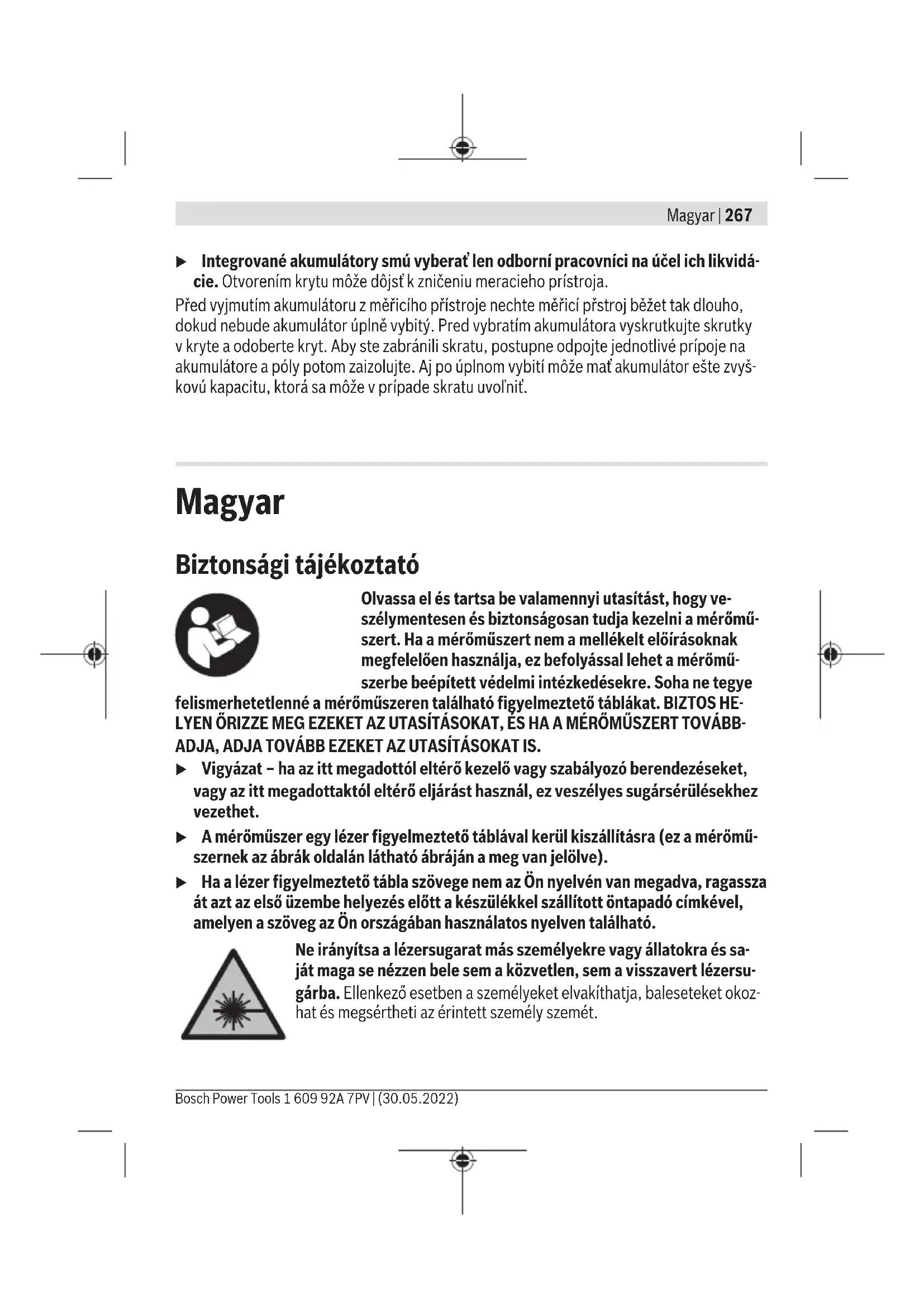 (f) Gondoskodjon arról, hogy a Bluetooth®-interfész a hordoz-ható végberendezésén aktiválva legyen.Nyomja meg röviden a gombot vagy tartsa benyomvaa gombot, hogy megnyissa az Alapbeállítások me- nüt. Jelölje ki a menüpontot.Nyomja meg a gombot vagy a gombot a kijelölé-séhez.A kijelölés nyugtázására nyomja meg a gombot.A Bluetooth®-jel a kijelzőn fehér színben kerül kijelzésre(f). A Bluetooth®-interfész deaktiválása Nyomja meg röviden a gombot vagy tartsa benyomva a gombot, hogy megnyis-sa az Alapbeállítások menüt.Jelölje ki a menüpontot.Nyomja meg a gombot vagy a gombot a kijelöléséhez.A kijelölés nyugtázására nyomja meg a gombot.A Bluetooth®-jel a kijelzőn szürke színben kerül kijelzésre. USB-interfész GLM 150-27 C: adatátvitel az USB-interfészen keresztül A mérőműszer Mikro-USB-csatlakozóján keresztül bizonyos, USB-interfésszel felszereltberendezésekhez (például számítógép, notebook) is lehet adatokat átvinni.Kösse össze a mérőműszert a Mikro-USB-kábel alkalmazásával a számítógépével vagynotebookjával. A számítógépén vagy a notebookján található operációs rendszer a mérő-műszert automatikusan egy meghajtóként ismeri fel.1 609 92A 7PV | (30.05.2022) Bosch Power ToolsMagyar | 281 Mihelyt a mérőműszert a Micro-USB-kábel segítségével összekapcsolják egy PC-vel vagy egy notebookkal, a Li-ion-akkumulátor feltöltésre kerül. A töltési idő a töltő- áramtól függően változó. A pontosság ellenőrzése Rendszeresen ellenőrizze a lejtésmérés és a távolságmérés pontosságát. Tovább információk az online használati utasításban találhatók: www.bosch-pt.com/manuals Hibaüzenet A mérőműszer a saját előírásszerű működését minden mérésnél ellenőrzi. Egy hiba észlelésekor a kijelzőn csak az itt látható szimbólum látható és a mérőmű- szer kikapcsolásra kerül. Ebben az esetben adja le a mérőműszert a kereskedő közbeiktatásával a Bosch-vevőszolgálatnál. Karbantartás és szerviz Karbantartás és tisztítás A mérőműszert csak az azzal együtt szállított védőtáskában tárolja és szállítsa. Tartsa mindig tisztán a mérőműszert. Ne merítse bele a mérőműszert vízbe vagy más folyadékokba. A szennyeződéseket egy nedves, puha kendővel törölje le. Tisztító- vagy oldószereket ne használjon. Mindenek előtt a(20)vevőlencsét, a(21)lézer kilépőnyílást és a(22)kamerát nagyon óvatosan tisztítsa meg: Ügyeljen arra, hogy ne maradhasson semmiféle szennyezés a ve- vőlencsén, a lézer kilépőnyíláson és a kamerán. A vevőlencsét, a lézer kilépőnyílást és a kamerát csak olyan szerekkel tisztítsa, amelyek a fényképezőgépek lencséinek tisztítására is alkalmasak. Ne próbáljon meg a vevőlencséből, a lézer kilépőnyílásból vagy a kamerából hegyes tárgyakkal szennyeződéseket eltávolítani és ne törölje meg a vevőlencsét, a lézer kilépőnyílást és a kamerát (eközben ezeket megkarcolhatja). Ha javításra van szükség, a(24)védőtáskába csomagolva küldje be a mérőműszert. Vevőszolgálat és alkalmazási tanácsadás A vevőszolgálat a terméke javításával és karbantartásával, valamint a pótalkatrészekkel kapcsolatos kérdésekre szívesen válaszol. A pótalkatrészekkel kapcsolatos robbantott áb- rák és egyéb információk a következő címen találhatók: www.bosch-pt.com Bosch Power Tools 1 609 92A 7PV | (30.05.2022)282 | Magyar A Bosch Alkalmazási Tanácsadó Team a termékeinkkel és azok tartozékaival kapcsolatos kérdésekben szívesen nyújt segítséget. Ha kérdései vannak vagy pótalkatrészeket szeretne rendelni, okvetlenül adja meg a ter- mék típustábláján található 10‑jegyű cikkszámot. Magyarország Robert Bosch Kft. 1103 Budapest Gyömrői út. 120. A www.bosch-pt.hu oldalon online megrendelheti készülékének javítását. Tel.:+3618798502 Fax: +3618798505 info.bsc@hu.bosch.com www.bosch-pt.hu További szerviz-címek itt találhatók: www.bosch-pt.com/serviceaddresses Szállítás A benne található lithium-ionos-akkumulátorokra a veszélyes árukra vonatkozó előírások érvényesek. A felhasználók az akkumulátorokat a közúti szállításban minden további nél- kül szállíthatják. Ha az akkumulátorok szállításával harmadik személyt (például: légi vagy egyéb szállító vál- lalatot) bíznak meg, akkor figyelembe kell venni a csomagolásra és a megjelölésre vonat- kozó különleges követelményeket. Ebben az esetben a küldemény előkészítésébe be kell vonni egy veszélyes áru szakembert. Hulladékkezelés A mérőműszereket, töltőkészülékeket, akkumulátorok, tartozékokat és csoma- golóanyagokat a környezetvédelmi szempontoknak megfelelően kell újrafel- használásra leadni. Ne dobja ki a mérőműszereket, a töltőkészülékeket és az akkumulátorokat a háztartási szemétbe! Csak az EU‑tagországok számára: Az elektromos és elektronikus berendezések hulladékairól szóló 2012/19/EU európai irányelvnek és a nemzeti jogba való átültetésének megfelelően a már nem használható mé- rőműszereket és töltőkészülékeket és a 2006/66/EK európai irányelvnek megfelelően a 1 609 92A 7PV | (30.05.2022) Bosch Power ToolsРусский | 283 már nem használható akkumulátorokat/elemeket külön össze kell gyűjteni és a környezet- védelmi szempontoknak megfelelően kell újrafelhasználásra leadni. Szakszerűtlen ártalmatlanítás esetén a már használhatatlan elektromos és elektronikus ké- szülékek a bennük esetleg található veszélyes anyagok következtében káros hatással le- hetnek a környezetre és az emberek egészségére. Akkumulátorok/elemek: Li-ion: Kérjük vegye figyelembe a Szállítás fejezetben található tájékoztatót (lásd „Szállítás”, Ol- dal282) funkciógombot. u A beépített akkumu