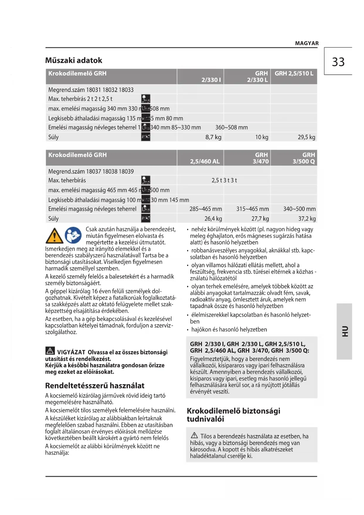 MAGYAR Műszaki adatok Krokodilemelő GRH 2/330 I GRH 2/330 L GRH 2,5/510 L Megrend.szám 18031 18032 18033 Max. teherbírás 2 t 2 t 2,5 t max. emelési magasság 340 mm 330 mm 508 mm Legkisebb áthaladási magasság 135 mm 85 mm 80 mm Emelési magasság névleges teherrel 135~340 mm 85~330 mm 360~508 mm Súly 8,7 kg 10 kg 29,5 kg Krokodilemelő GRH 2,5/460 AL GRH 3/470 GRH 3/500 Q Megrend.szám 18037 18038 18039 Max. teherbírás 2,5 t 3 t 3 t max. emelési magasság 465 mm 465 mm 500 mm Legkisebb áthaladási magasság 100 mm 130 mm 145 mm Emelési magasság névleges teherrel 285~465 mm 315~465 mm 340~500 mm Súly 26,4 kg 27,7 kg 37,2 kg Csak azután használja a berendezést, miután gyelmesen elolvasta és megértette a kezelési útmutatót. Ismerkedjen meg az irányító elemekkel és a berendezés szabályszerű használatával! Tartsa be a biztonsági utasításokat. Viselkedjen gyelmesen harmadik személlyel szemben. A kezelő személy felelős a balesetekért és a harmadik személy biztonságáért. A géppel kizárólag 16 éven felüliszemélyek dol