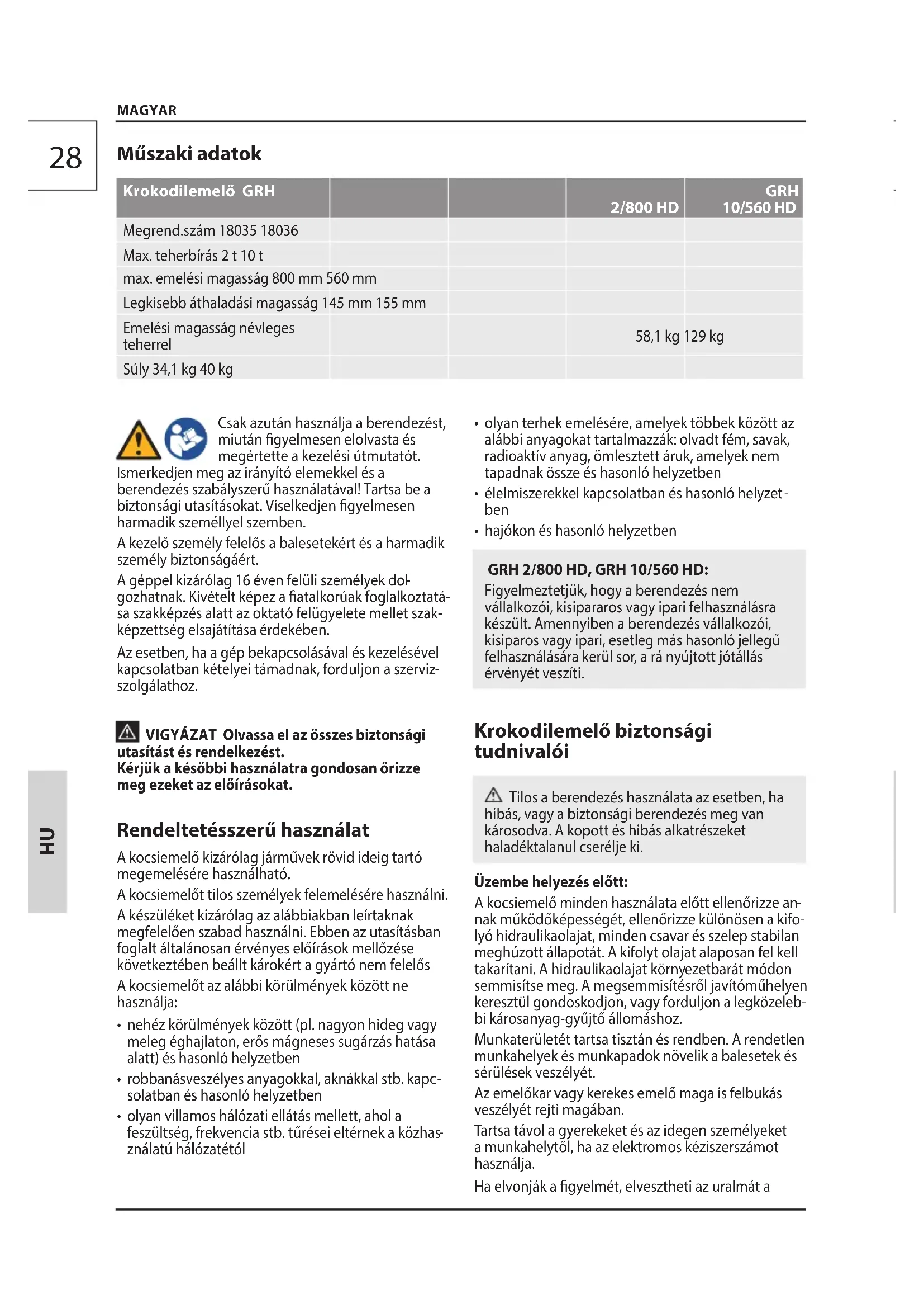 MAGYAR Műszaki adatok Krokodilemelő GRH 2/800 HD GRH 10/560 HD Megrend.szám 18035 18036 Max. teherbírás 2 t 10 t max. emelési magasság 800 mm 560 mm Legkisebb áthaladási magasság 145 mm 155 mm Emelési magasság névleges teherrel 58,1 kg 129 kg Súly 34,1 kg 40 kg Csak azután használja a berendezést, miután gyelmesen elolvasta és megértette a kezelési útmutatót. Ismerkedjen meg az irányító elemekkel és a berendezés szabályszerű használatával! Tartsa be a biztonsági utasításokat. Viselkedjen gyelmesen harmadik személlyel szemben. A kezelő személy felelős a balesetekért és a harmadik személy biztonságáért. A géppel kizárólag 16 éven felüliszemélyek dol