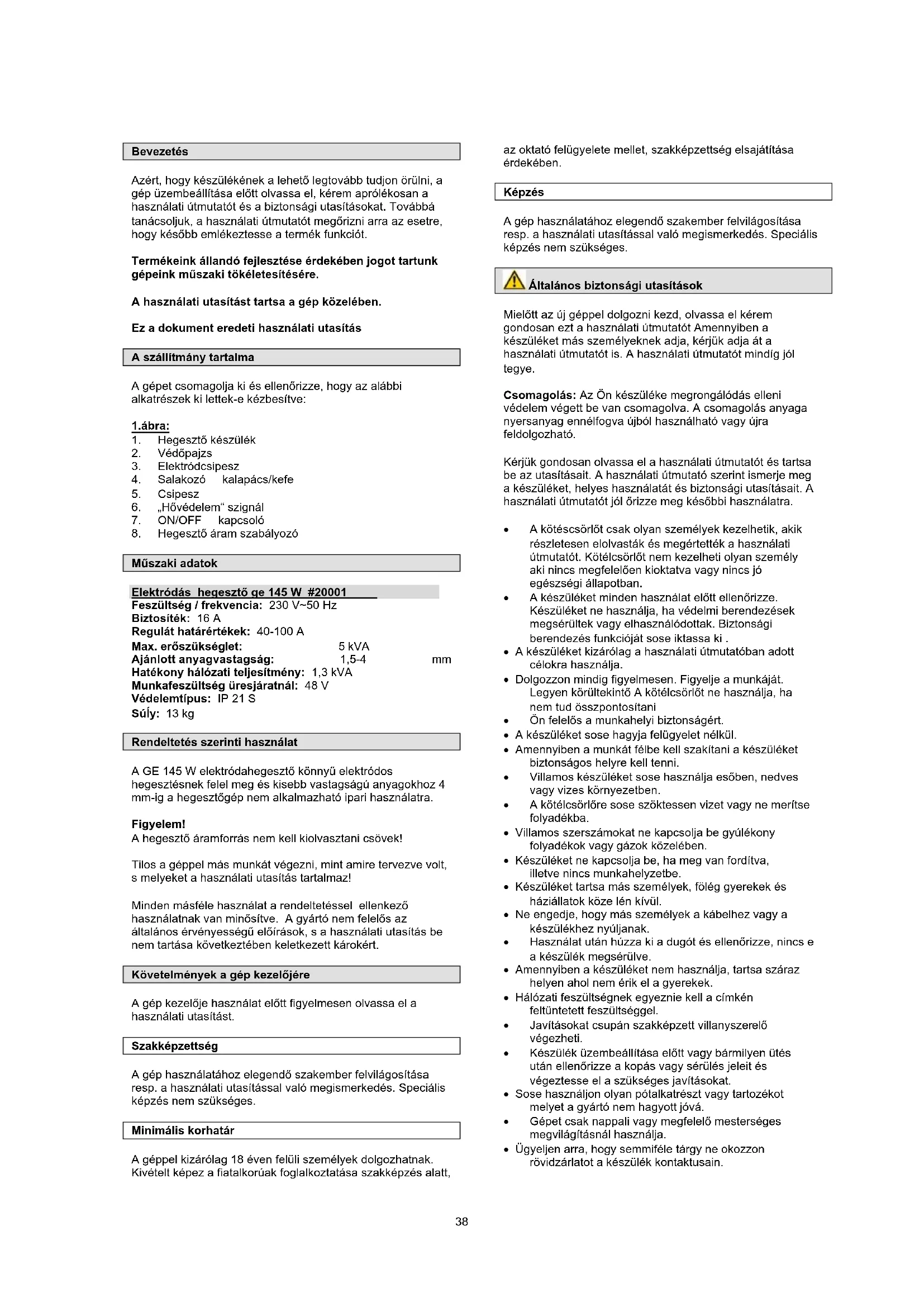 Műszaki adatok Elektródás hegesztő ge 145 W #20001 Feszültség / frekvencia: 230 V~50 Hz Biztosíték: 16 A Regulát határértékek: 40-100 A Max. erőszükséglet: 5 kVA Ajánlott anyagvastagság: 1,5-4 mm Hatékony hálózati teljesítmény: 1,3 kVA Munkafeszültség üresjáratnál: 48 V Védelemtípus: IP 21 S Súĺy: 13 kg Rendeltetés szerinti használat A GE 145 W elektródahegesztő könnyű elektródos hegesztésnek felel meg és kisebb vastagságú anyagokhoz 4 mm-ig a hegesztőgép nem alkalmazható ipari használatra. Figyelem! A hegesztő áramforrás nem kell kiolvasztani csövek! Tilos a géppel más munkát végezni, mint amire tervezve volt, s melyeket a használati utasítás tartalmaz! Minden másféle használat a rendeltetéssel ellenkező használatnak van minősítve. A gyártó nem felelős az általános érvényességű előírások, s a használati utasítás be nem tartása következtében keletkezett károkért. Követelmények a gép kezelőjére A gép kezelője használat előtt figyelmesen olvassa el a használati utasítást. Szakképzettség A gép használatához elegendő szakember felvilágosítása resp. a használati utasítással való megismerkedés. Speciális képzés nem szükséges. Minimális korhatár A géppel kizárólag 18 éven felüli személyek dolgozhatnak. Kivételt képez a fiatalkorúak foglalkoztatása szakképzés alatt, az oktató felügyelete mellet, szakképzettség elsajátítása érdekében. Képzés A gép használatához elegendő szakember felvilágosítása resp. a használati utasítással való megismerkedés. Speciális képzés nem szükséges. Általános biztonsági utasítások Mielőtt az új géppel dolgozni kezd, olvassa el kérem gondosan ezt a használati útmutatót Amennyiben a készüléket más személyeknek adja, kérjük adja át a használati útmutatót is. A használati útmutatót mindíg jól tegye. Csomagolás: Az Ön készüléke megrongálódás elleni védelem végett be van csomagolva. A csomagolás anyaga nyersanyag ennélfogva újból használható vagy újra feldolgozható. Kérjük gondosan olvassa el a használati útmutatót és tartsa be az utasításait. A használati útmutató szerint ismerje meg a készüléket, helyes használatát és biztonsági utasításait. A használati útmutatót jól őrizze meg későbbi használatra. A kötéscsörlőt csak olyan személyek kezelhetik, akik részletesen elolvasták és megértették a használati útmutatót. Kötélcsörlőt nem kezelheti olyan személy aki nincs megfelelően kioktatva vagy nincs jó egészségi állapotban. A készüléket minden használat előtt ellenőrizze. Készüléket ne használja, ha védelmi berendezések megsérültek vagy elhasználódottak. Biztonsági berendezés funkcióját sose iktassa ki . A készüléket kizárólag a használati útmutatóban adott célokra használja. Dolgozzon mindig figyelmesen. Figyelje a munkáját. Legyen körültekintő A kötélcsörlőt ne használja, ha nem tud összpontosítani Ön felelős a munkahelyi biztonságért. A készüléket sose hagyja felügyelet nélkül. Amennyiben a munkát félbe kell szakítani a készüléket biztonságos helyre kell tenni. Villamos készüléket sose használja esőben, nedves vagy vizes környezetben. A kötélcsörlőre sose szöktessen vizet vagy ne merítse folyadékba. Villamos szerszámokat ne kapcsolja be gyúlékony folyadékok vagy gázok közelében. Készüléket ne kapcsolja be, ha meg van fordítva, illetve nincs munkahelyzetbe. Készüléket tartsa más személyek, fölég gyerekek és háziállatok köze lén kívül. Ne engedje, hogy más személyek a kábelhez vagy a készülékhez nyúljanak. Használat után húzza ki a dugót és ellenőrizze, nincs e a készülék megsérülve. Amennyiben a készüléket nem használja, tartsa száraz helyen ahol nem érik el a gyerekek. Hálózati feszültségnek egyeznie kell a címkén feltüntetett feszültséggel. Javításokat csupán szakképzett villanyszerelő végezheti.