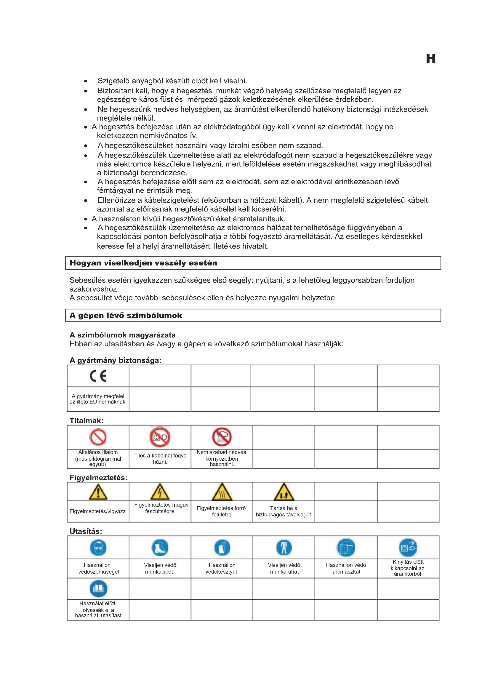 Tento formulár si môžete vyžiadaĢ tiež na Tel.: +49 (0) 79 04 / 700-0 Fax: +49 (0) 79 04 / 700-250 E-Mail: info@guede.comH x SzigetelĘ anyagból készült cipĘt kell viselni. x Biztosítani kell, hogy a hegesztési munkát végzĘ helység szellĘzése megfelelĘ legyen az egészségre káros füst és mérgezĘ gázok keletkezésének elkerülése érdekében. x Ne hegesszünk nedves helységben, az áramütést elkerülendĘ hatékony biztonsági intézkedések megtétele nélkül. x A hegesztés befejezése után az elektródafogóból úgy kell kivenni az elektródát, hogy ne keletkezzen nemkivánatos ív. x A hegesztĘkészüléket használni vagy tárolni esĘben nem szabad. x A hegesztĘkészülék üzemeltetése alatt az elektródafogót nem szabad a hegesztĘkészülékre vagy más elektromos készülékre helyezni, mert leföldelése esetén megszakadhat vagy meghibásodhat a biztonsági berendezése. x A hegesztés befejezése elĘtt sem az elektródát, sem az elektródával érintkezésben lévĘ fémtárgyat ne érintsük meg. x EllenĘrizze a kábelszigetelést (elsĘsorban a hálózati kábelt). A nem megfelelĘ szigetelésĦ kábelt azonnal az elĘírásnak megfelelĘ kábellel kell kicserélni. x A használaton kívüli hegesztĘkészüléket áramtalanítsuk. x A hegesztĘkészülék üzemeltetése az elektromos hálózat terhelhetĘsége függvényében a kapcsolódási ponton befolyásolhatja a többi fogyasztó áramellátását. Az esetleges kérdésekkel keresse fel a helyi áramellátásért illetékes hivatalt. Hogyan viselkedjen veszély esetén Sebesülés esetén igyekezzen szükséges elsĘ segélyt nyújtani, s a lehetĘleg leggyorsabban forduljon szakorvoshoz. A sebesültet védje további sebesülések ellen és helyezze nyugalmi helyzetbe. A gépen lévĞ szimbólumok A szimbólumok magyarázata Ebben az utasításban és /vagy a gépen a következĘ szimbólumokat használják: A gyártmány biztonsága: