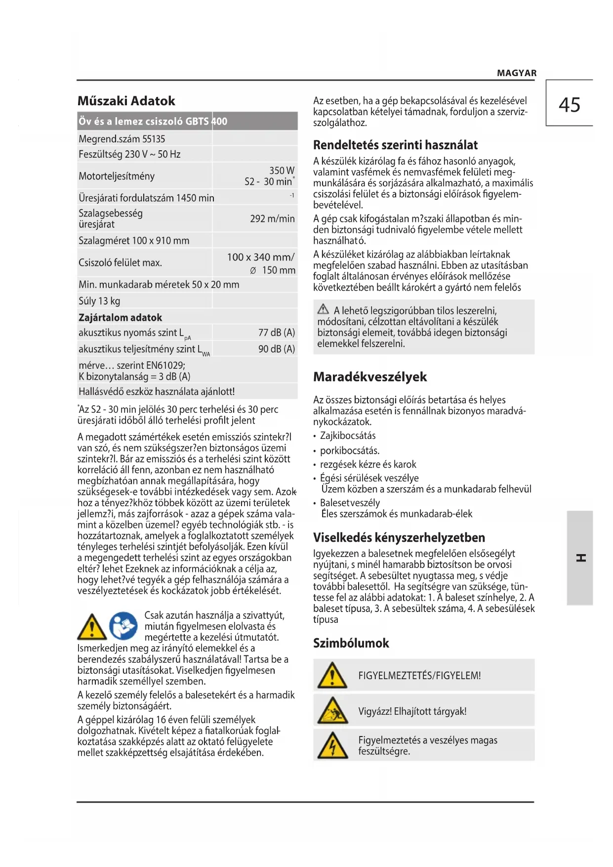 koztatása szakképzés alatt az oktató felügyelete melletszakkép zettség elsajátítása érdekében. Az esetben, ha a gép bekapcsolásával és kezelésével kapcsolatban kételyei támadnak, forduljon a szerviz- szolgálathoz. Rendeltetés szerinti használat A készülék kizárólag fa és fához hasonló anyagok, valamint vasfémek és nemvasfémek felületi meg- munkálására és sorjázására alkalmazható, a maximális csiszolási felület és a biztonsági előírások gyelem- bevételével. A gép csak kifogástalan m?szaki állapotban és min- den biztonsági tudnivaló gyelembe vétele mellett használhat