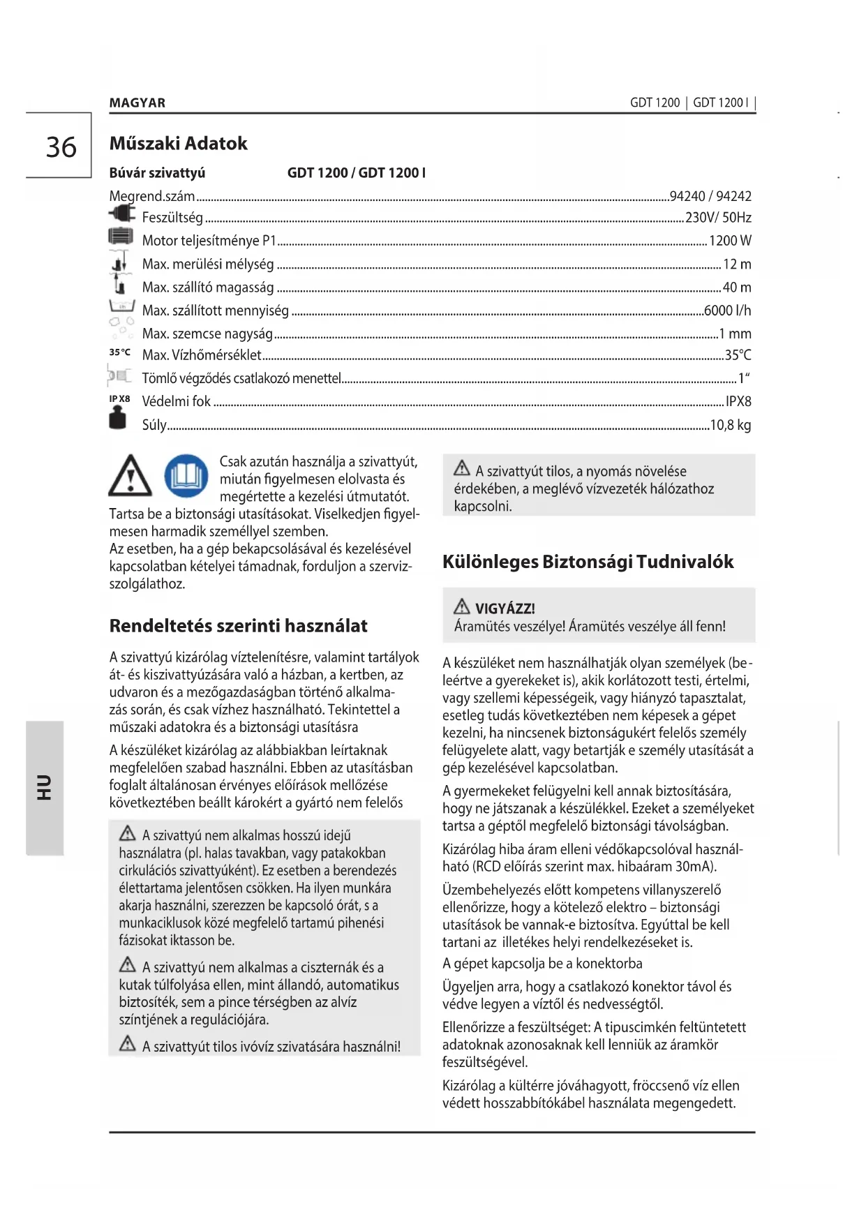 Csak azután használja a szivattyút, miután gyelmesen elolvasta és megértette a kezelési útmutatót. Tartsa be a biztonsági utasításokat. Viselkedjen gyel- mesen harmadik személlyel szemben. Az esetben, ha a gép bekapcsolásával és kezelésével kapcsolatban kételyei támadnak, forduljon a szerviz- szolgálathoz. Rendeltetés szerinti használat A szivattyú kizárólag víztelenítésre, valamint tartályok át- és kiszivattyúzására való a házban, a kertben, az udvaron és a mezőgazdaságban történő alkalma- zás során, és csak vízhez használható. Tekintettel a műszaki adatokra és a biztonsági utasításra A készüléket kizárólag az alábbiakban leírtaknak megfelelően szabad használni. Ebben az utasításban foglalt általánosan érvényes előírások mellőzése következtében beállt károkért a gyártó nem felelős A szivattyú nem alkalmas hosszú idejű használatra (pl. halas tavakban, vagy patakokban cirkulációs szivattyúként). Ez esetben a berendezés élettartama jelentősen csökken. Ha ilyen munkára akarja használni, szerezzen be kapcsoló órát, s a munkaciklusok közé megfelelő tartamú pihenési fázisokat iktasson be. A szivattyú nem alkalmas a ciszternák és a kutak túlfolyása ellen, mint állandó, automatikus biztosíték, sem a pince térségben az alvíz színtjének a regulációjára. A szivattyút tilos ivóvíz szivatására használni! Műszaki Adatok Búvár szivattyú GDT 1200 / GDT 1200 I Megrend.szám ....................................................................................................................................................................94240 / 94242 Feszültség ......................................................................................................................................................................230V/ 50Hz Motor teljesítménye P1 .....................................................................................................................................................1200 W Max. merülési mélység ..........................................................................................................................................................12 m Max. szállító magasság ..........................................................................................................................................................40 m Max. szállított mennyiség ...............................................................................................................................................6000 l/h Max. szemcse nagyság ..........................................................................................................................................................1 mm Max. Vízhőmérséklet ................................................................................................................................................................ 35°C Tömlő végződés csatlakozó menettel ..........................................................................................................................................1“ Védelmi fok .................................................................................................................................................................................IPX8 Súly ............................................................................................................................................................................................10,8 kg A szivattyút tilos, a nyomás növelése érdekében, a meglévő vízvezeték hálózathoz kapcsolni. Különleges Biztonsági Tudnivalók VIGYÁZZ! Áramütés veszélye! Áramütés veszélye áll fenn! A készüléket nem használhatják olyan személyek (be